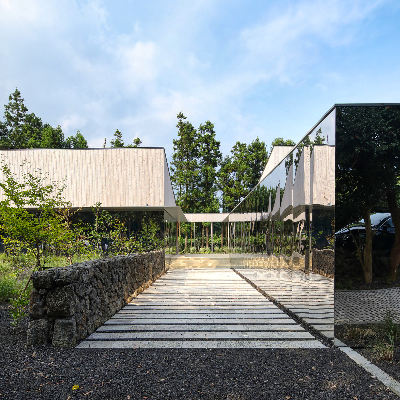 대지의 경계를 둘러싼 밭담과 같은 현무암 돌담을 내부 마당의 영역을 구분하고 장소화하는 데에 사용했으며, 이 돌담은 미러스테인레스에 반사되어 금속 표면에 시각적 질감을 만들고 확장된 공간감을 경험하게 한다.