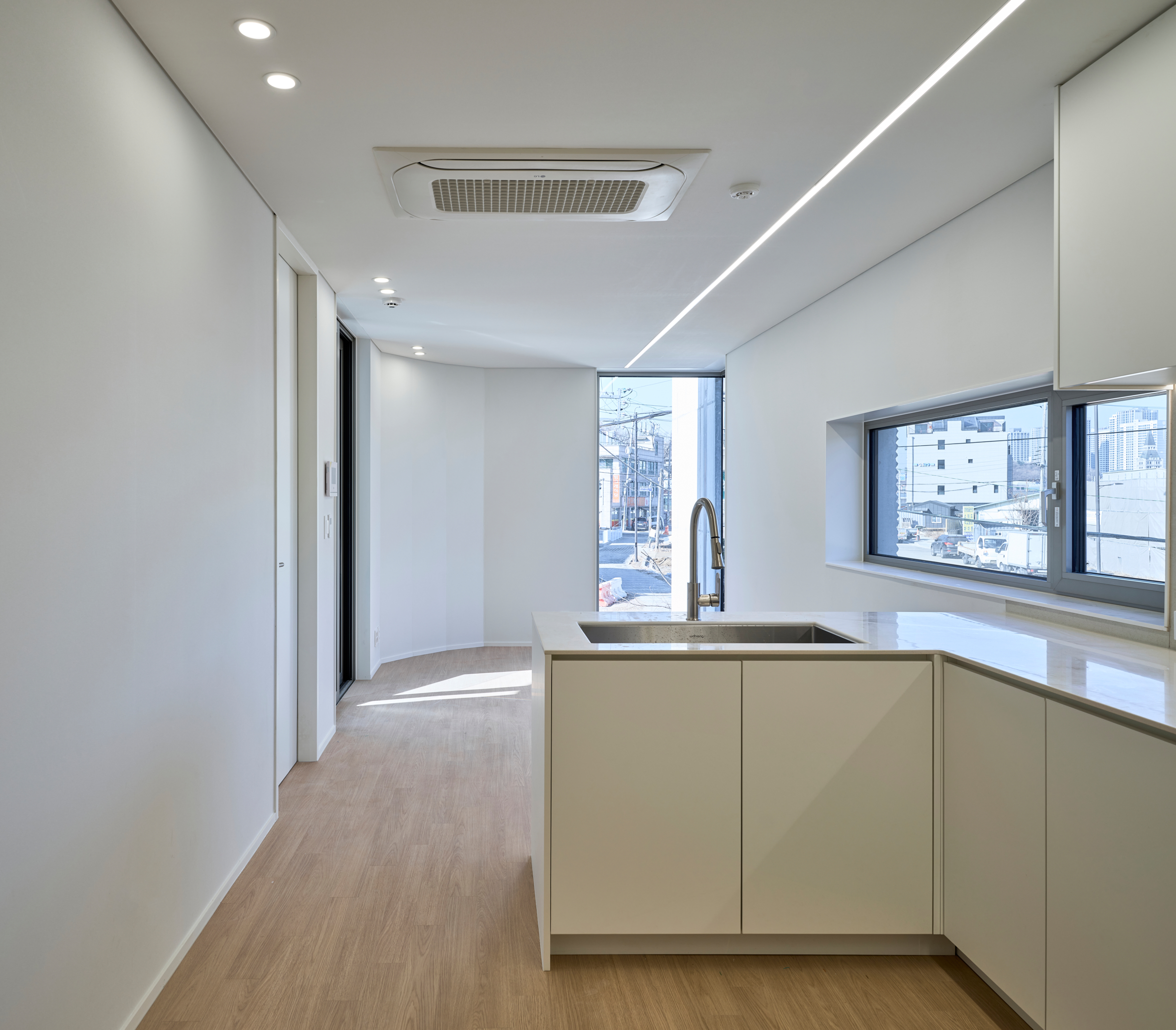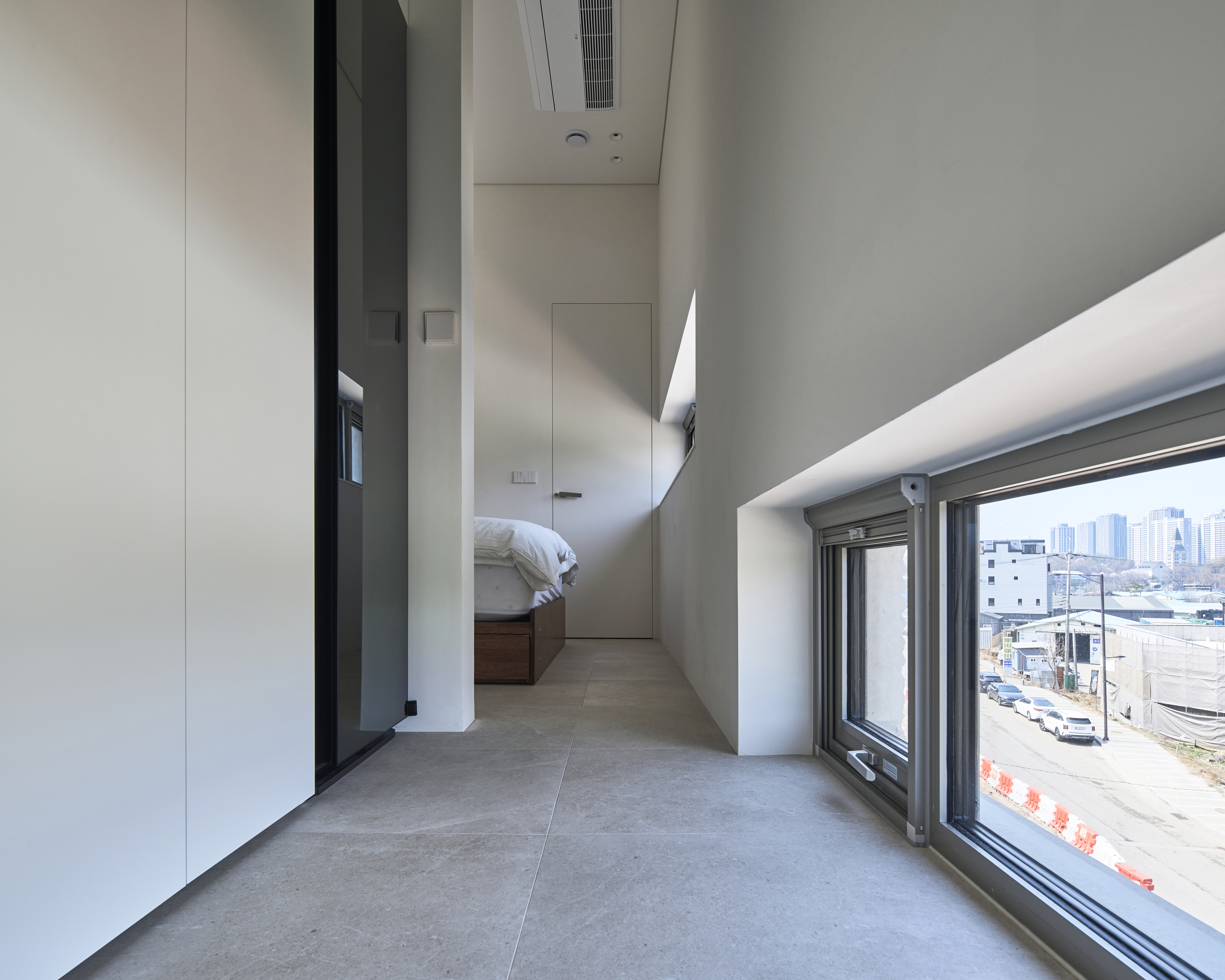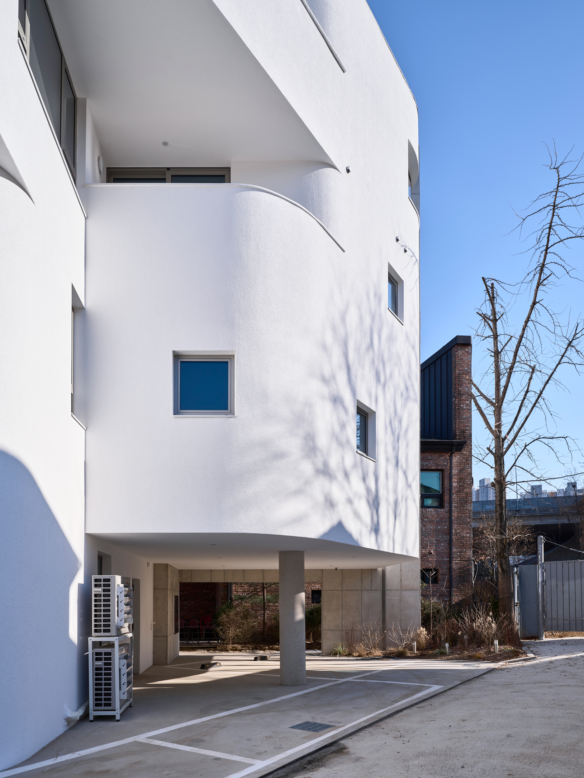 차량의 소음, 건조한 도시 풍경과 마주한 북쪽과 동쪽 면은 단단하고 거친 콘크리트 벽이 ㄱ자로 서 있다. 층의 구분이 모호하고 주거로 인식되지 않는 단일한 면으로 1층 근린생활시설 용도에 시선을 집중시키는 장점을 가지며, 신경질적인 도시의 자극에 침묵으로 대응한다.