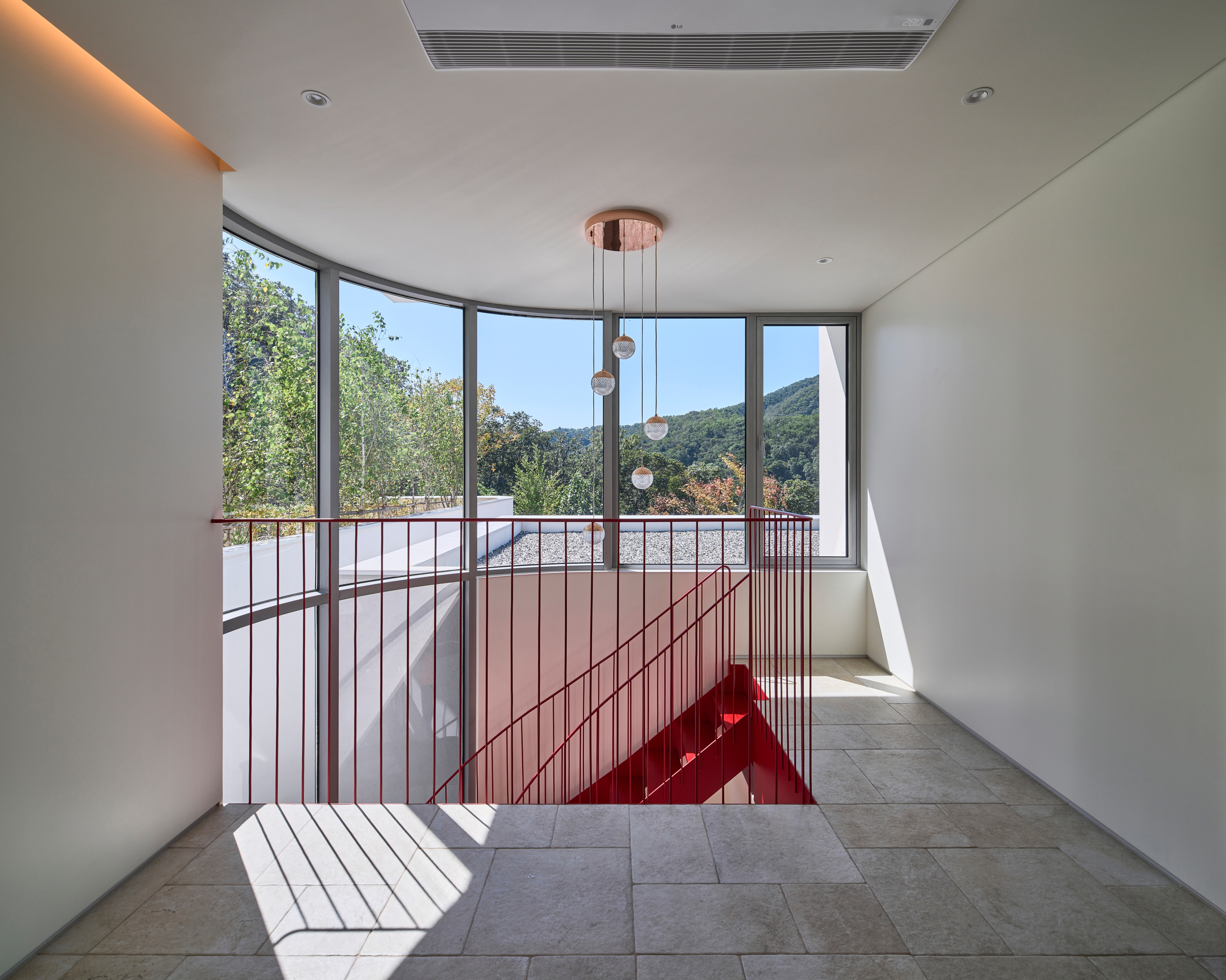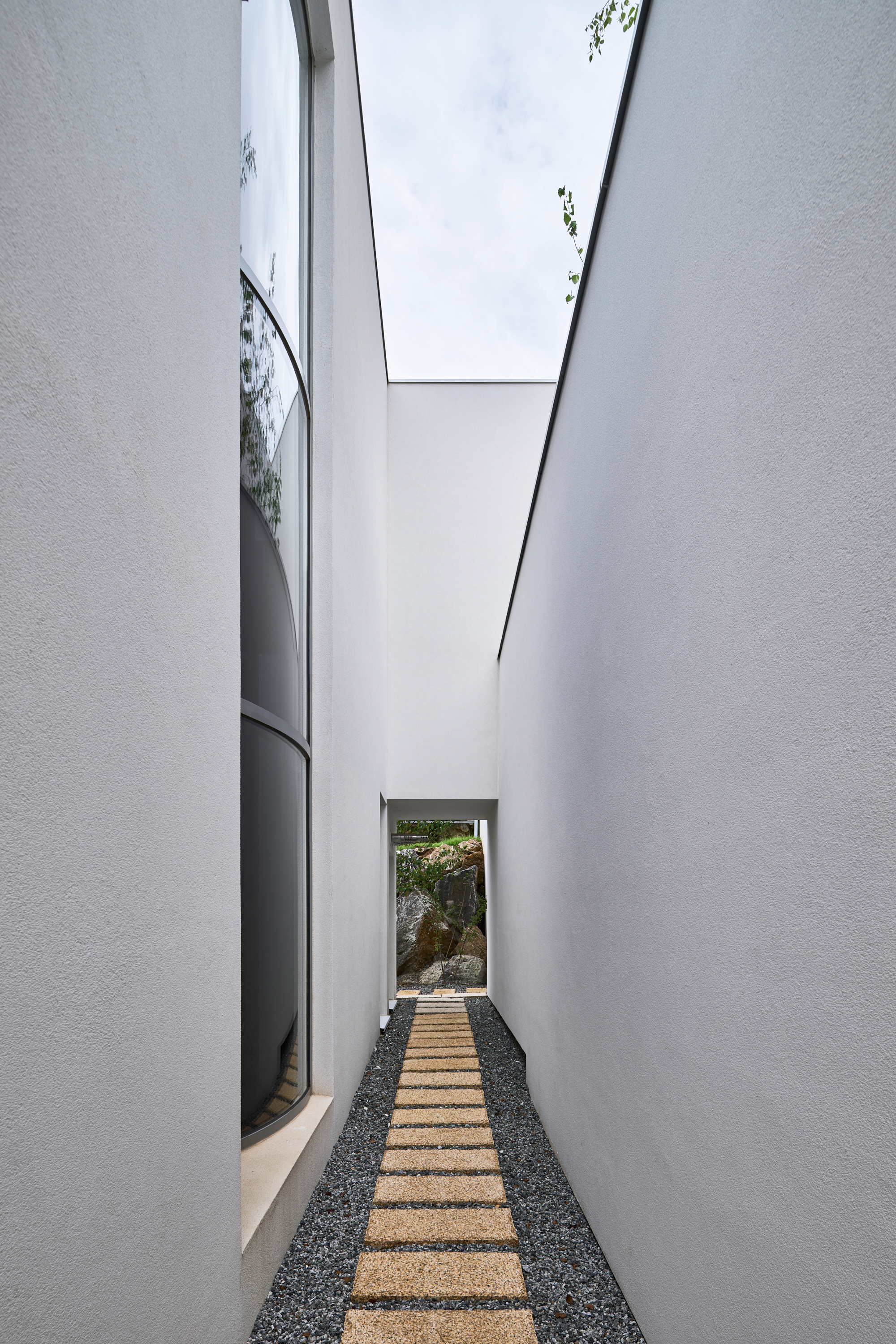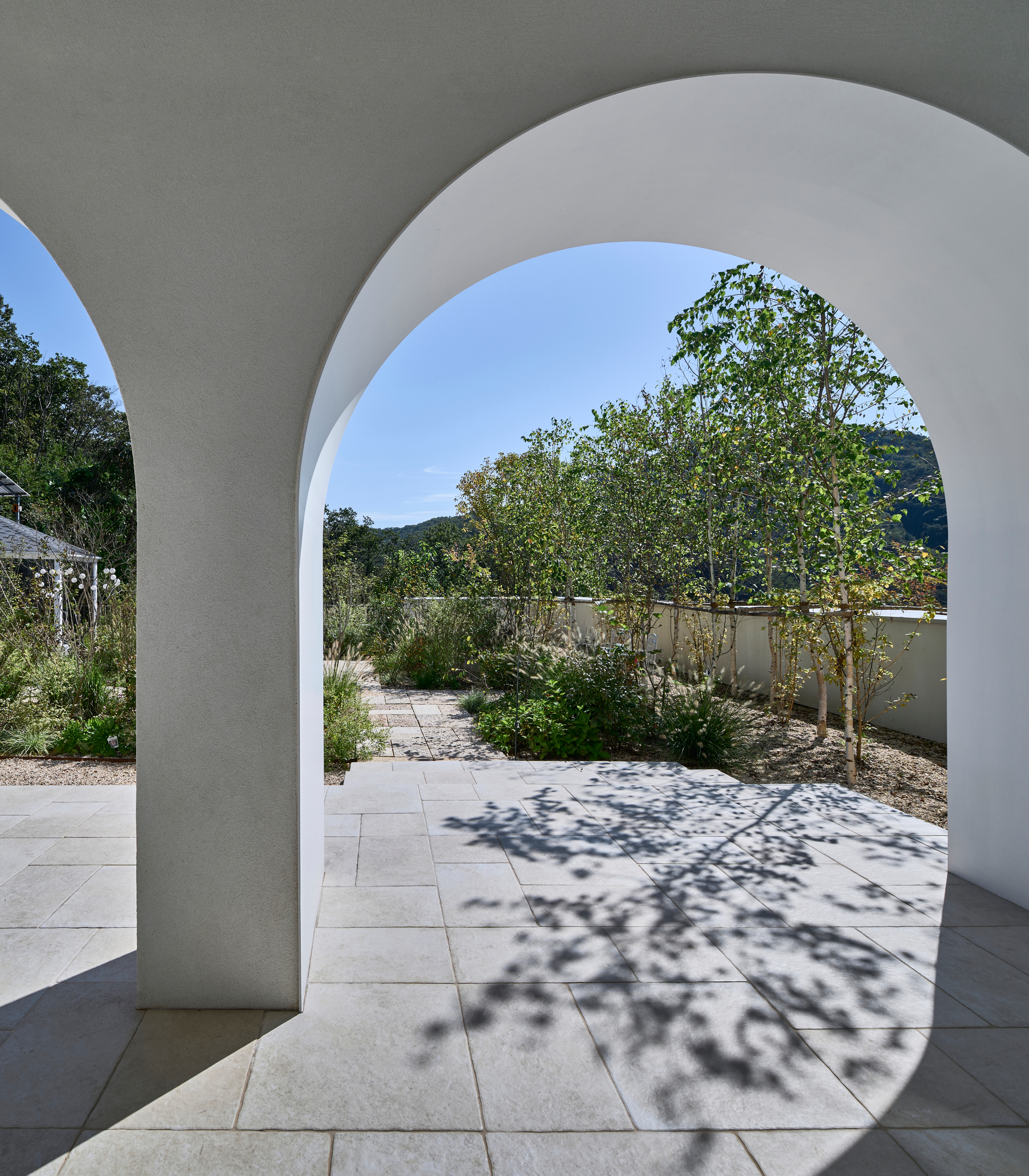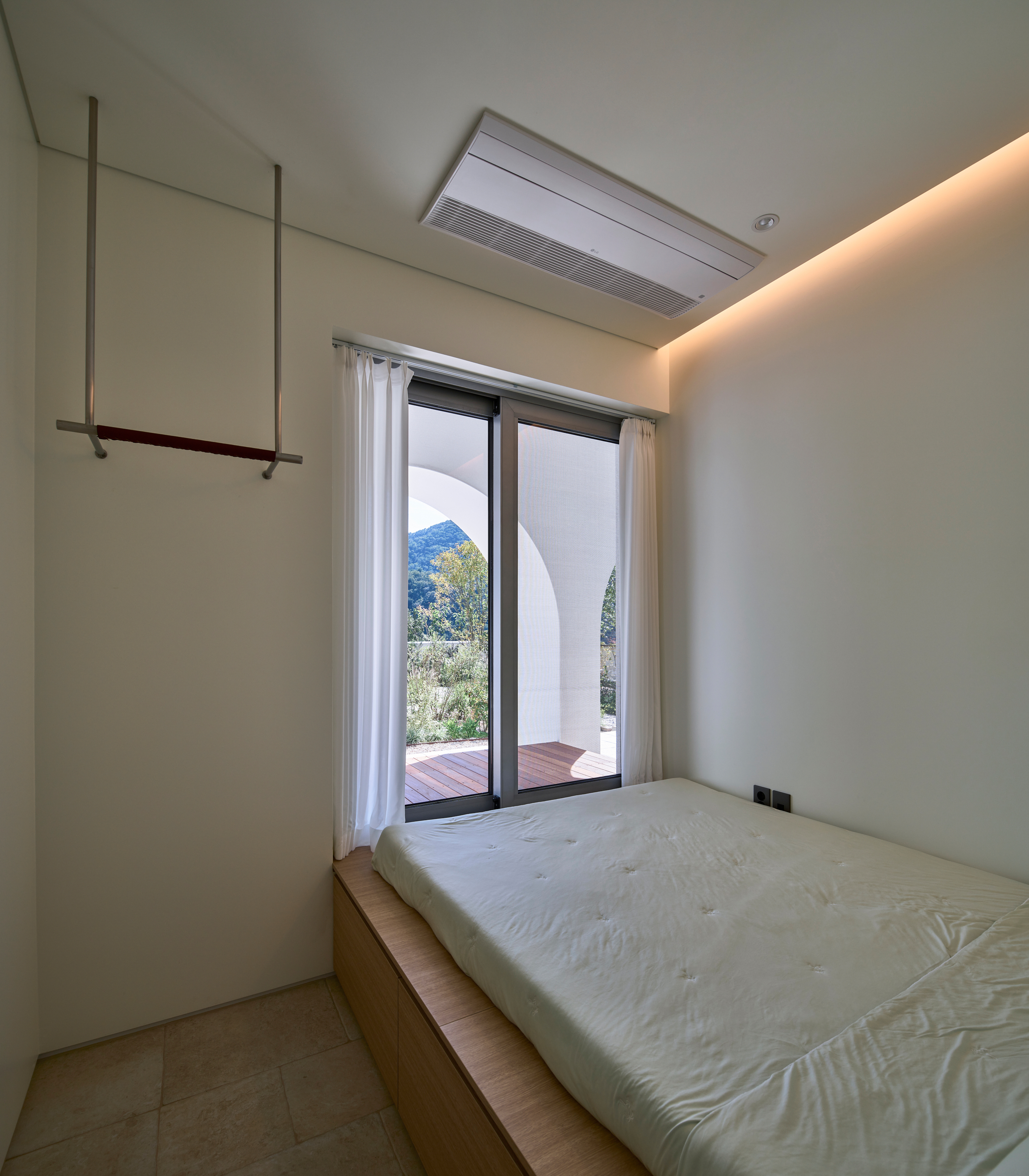 이 집의 가장 큰 특징은 연속된 아치로 형성된 회랑이다. 회랑의 사전적 정의는 ‘건물의 중요 부분을 둘러싸고 있는 지붕이 달린 복도‘이다. 하지만 이 집에서 회랑은 복도로서 기능하기 보다는 ’잠시 머물다 가는 곳’의 의미를 가진다. 한낮에는 남향의 햇빛이 아치 안에 머물다 가는데 집 안으로 간접광의 편안한 빛을 들이게 된다. 방과 이어진 회랑의 툇마루는 방의 나른한 머무름을 집 밖으로 옮겨오는 장소다. 그 옆에는 작은 욕조가 이어지는데, 툇마루가 변용된 머무름의 다른 모습이다. 가장 의미 있는 머묾은 회랑의 직각 방향으로 열린 아치의 프레임을 통해서 일어난다. 원경의 산과 하늘, 근경의 정원 풍경이 아치 안으로 들어와 시선을 잡아둔다. 아치 안에서 사계절이 머 물다, 갈 것이었다.