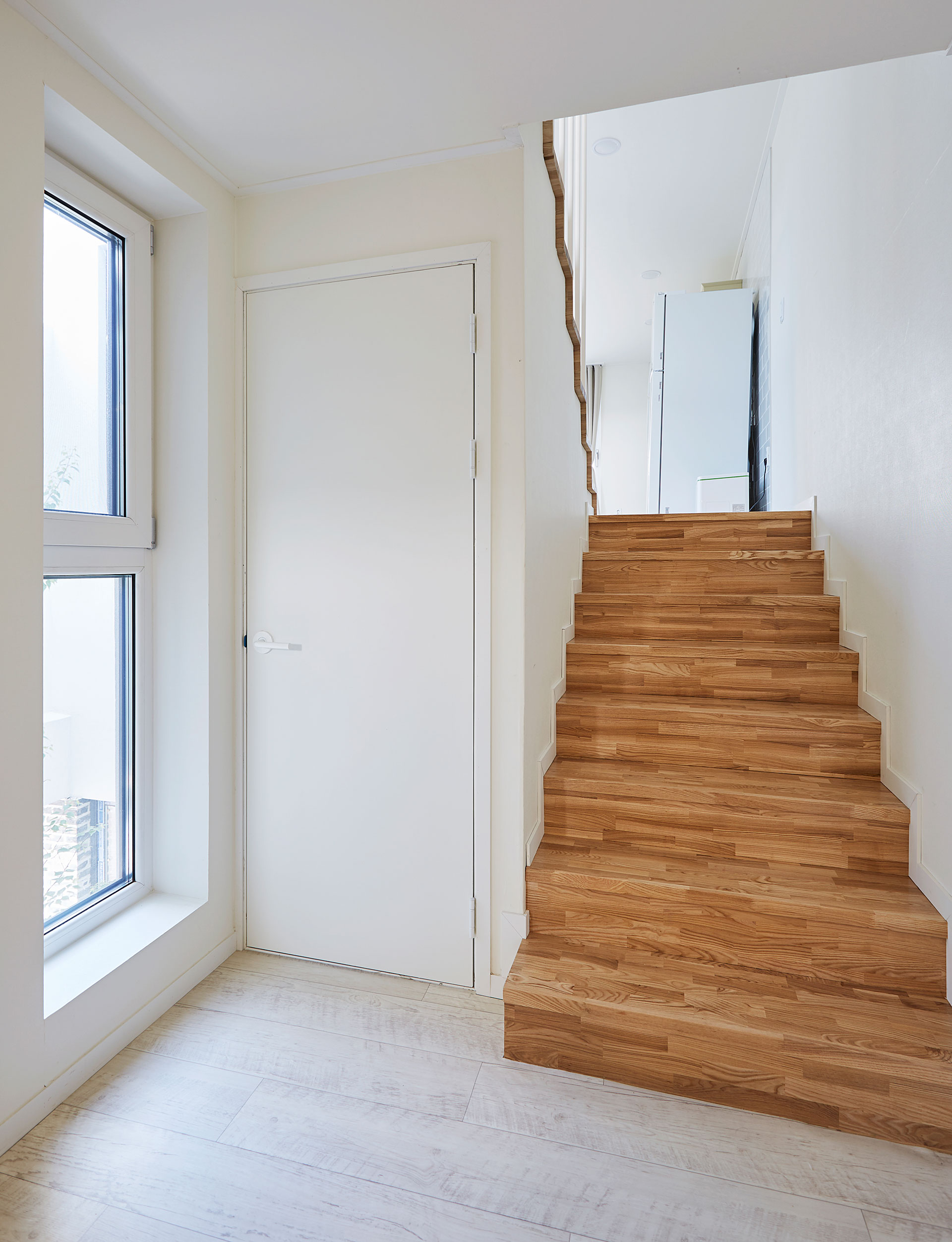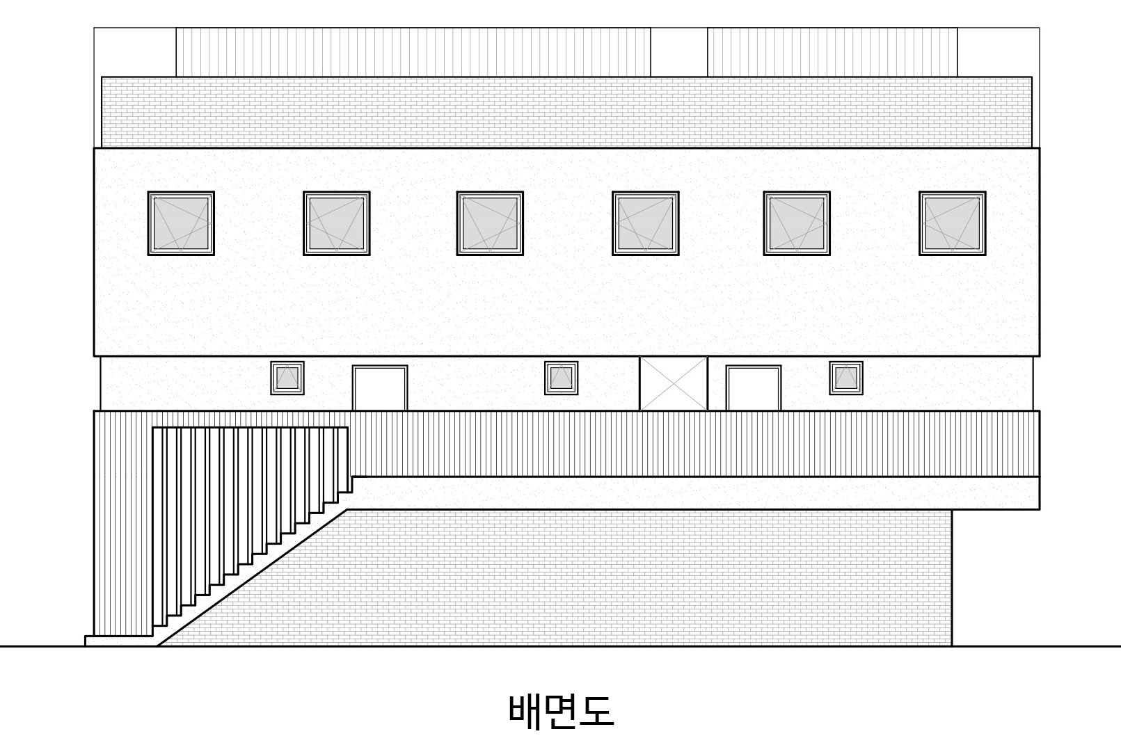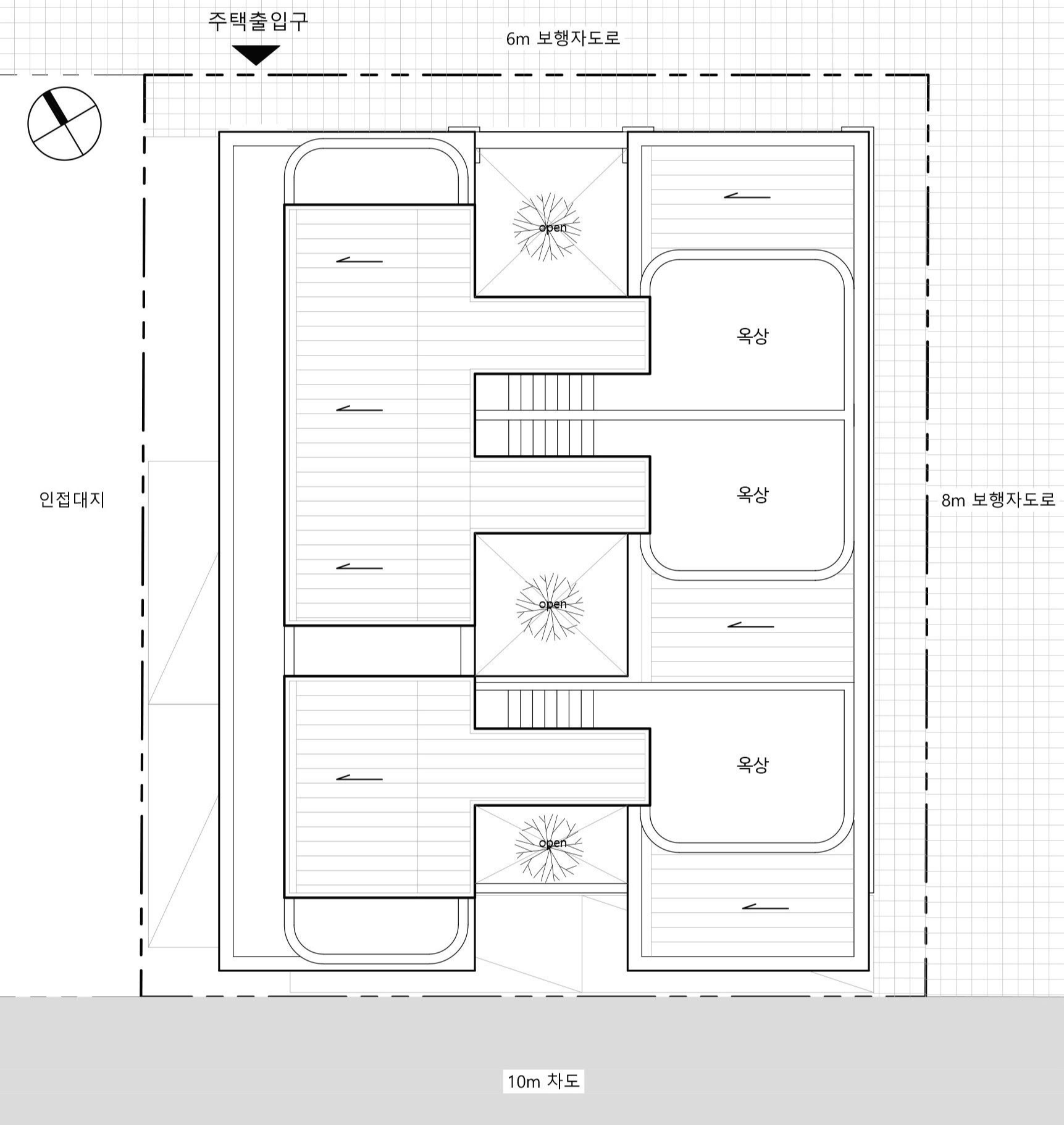 따라서 주택의 2, 3층을 복층화하고 한 층에 3가구를 구성하여 공용 계단은 2층에서 끝나도록 하였다. 2층의 수평적 복도는 3가구가 우연한 만남을 기대할 소통의 장이 된다.