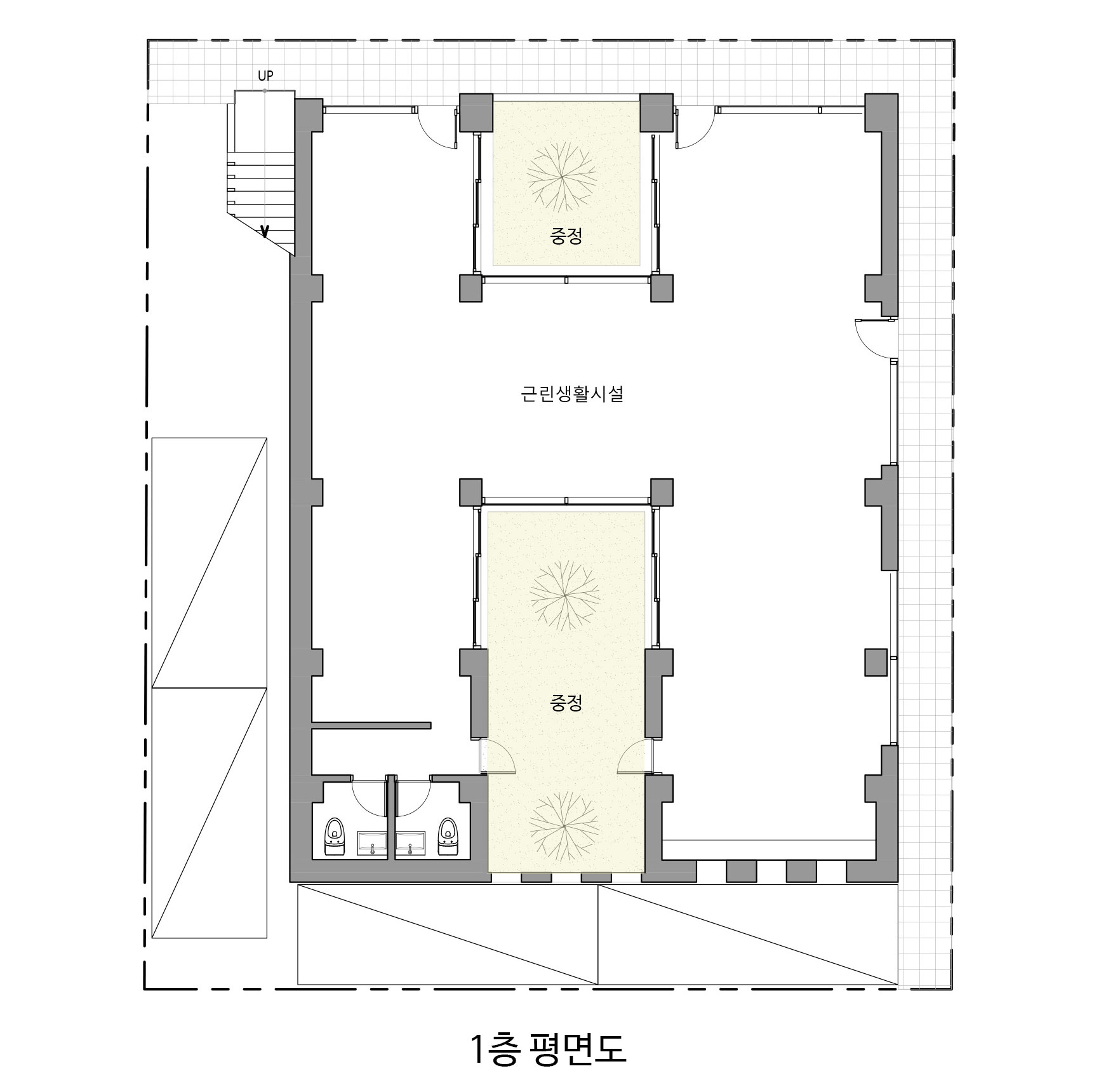 1층까지 뚫려있는 광정은 각 가구뿐만 아니라 1층 상가에도 매력적인 외부공간을 제공한다. 상가의 중심부를 관통하는 이 외부공간은 특징 없는 주변 가로 환경과 대비되어 내부로 사람을 끌어들이는 융합의 공간이 될 것이다.
