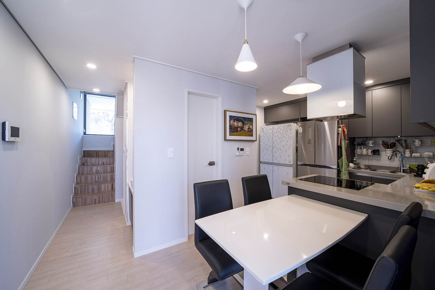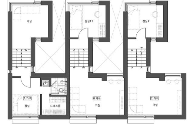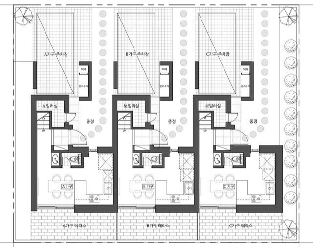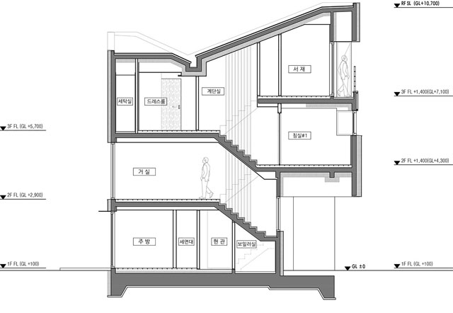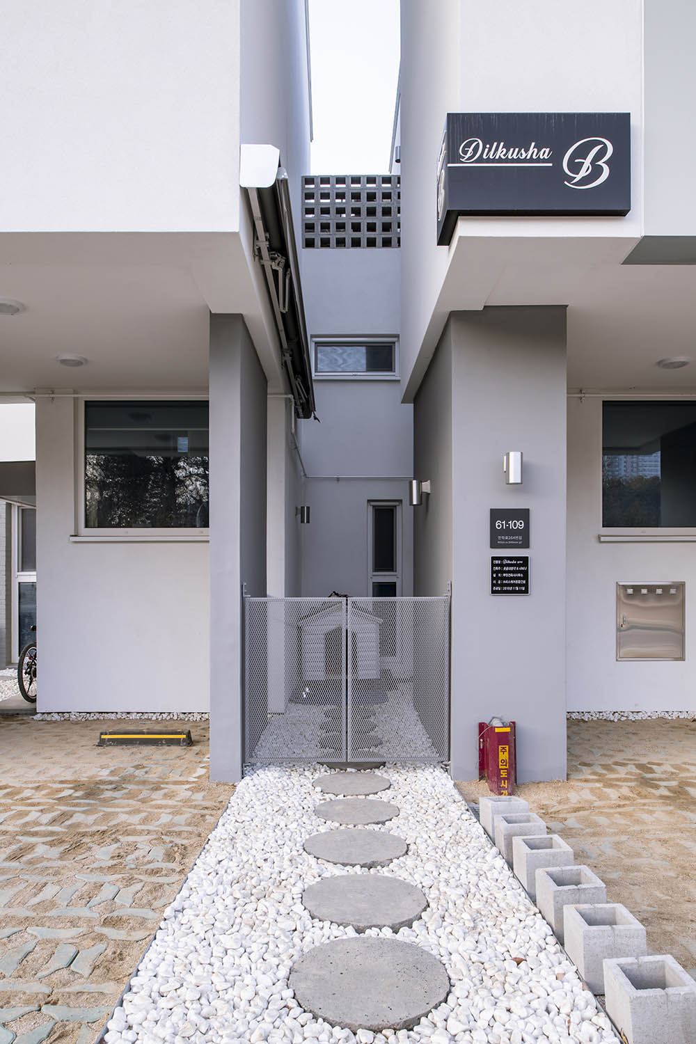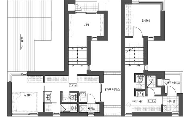 보통 다가구주택을 짓고자 하는 건축주는 본인의 삶을 담는 집을 짓는 목적 외에도 임대수익을 통한 건축비의 조달을 고려하지 않을 수 없다. 이때 건축주들이 흔히 가지는 자세는 스스로 다가구주택의 한계를 인정하고 수익을 위한 최소한의 건축비를 선택하는 것이다. 여기에서 말하는 다가구주택의 한계란 주변 아파트의 임대가를 넘을 수 없는, ‘아파트보다 한 단계 수준이 낮은 주택’이라는 인식이다. 하지만 그 인식에서 벗어나 단독주택과 아파트 사이의 어느 지점에 자리한, 다가구주택만의 고유한 ‘모여 사는 집’의 형식을 제안해 거주의 질과 임대 가치를 동시에 높일 수 있는 집을 만들고자 하는 생각으로 설계를 시작했다.