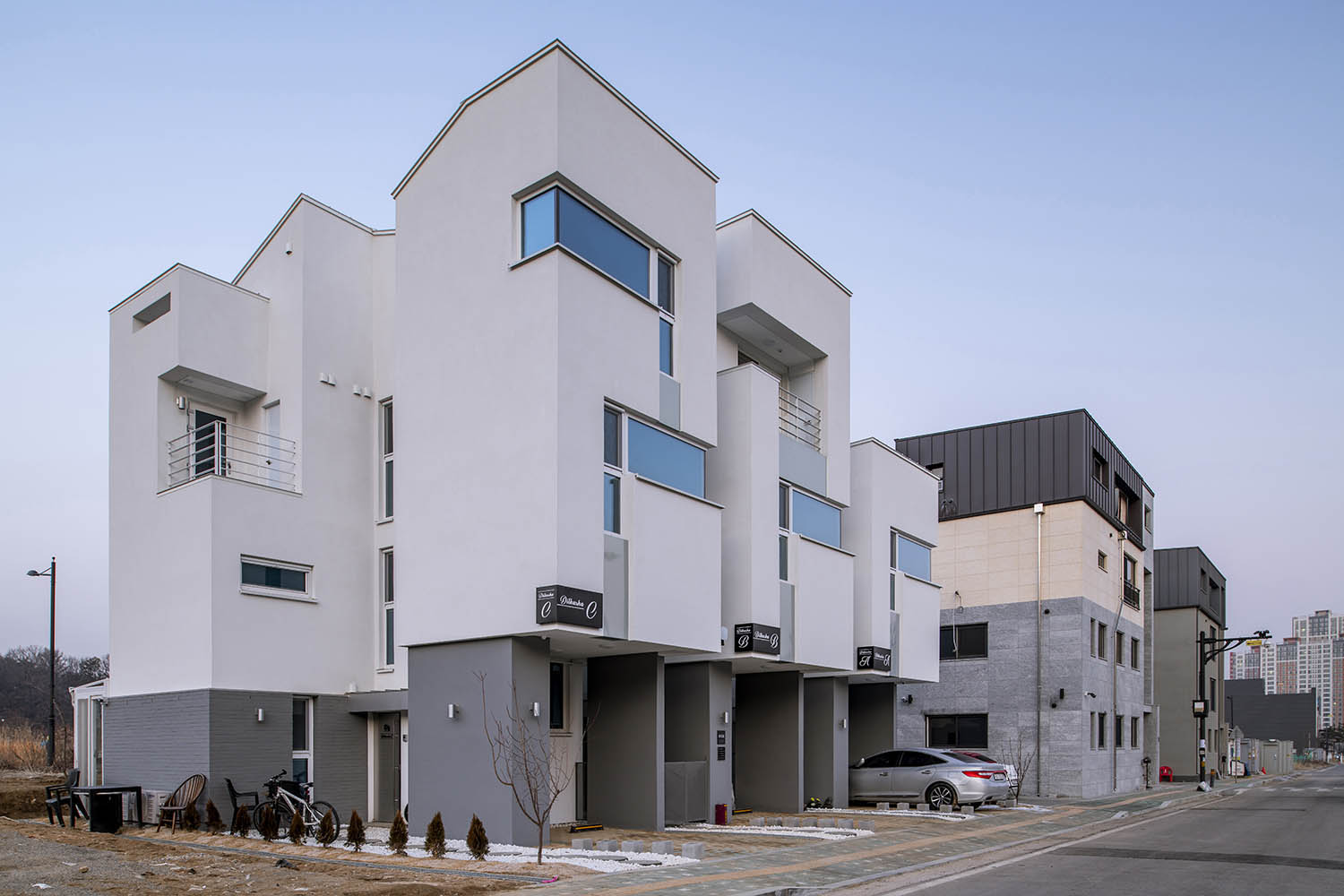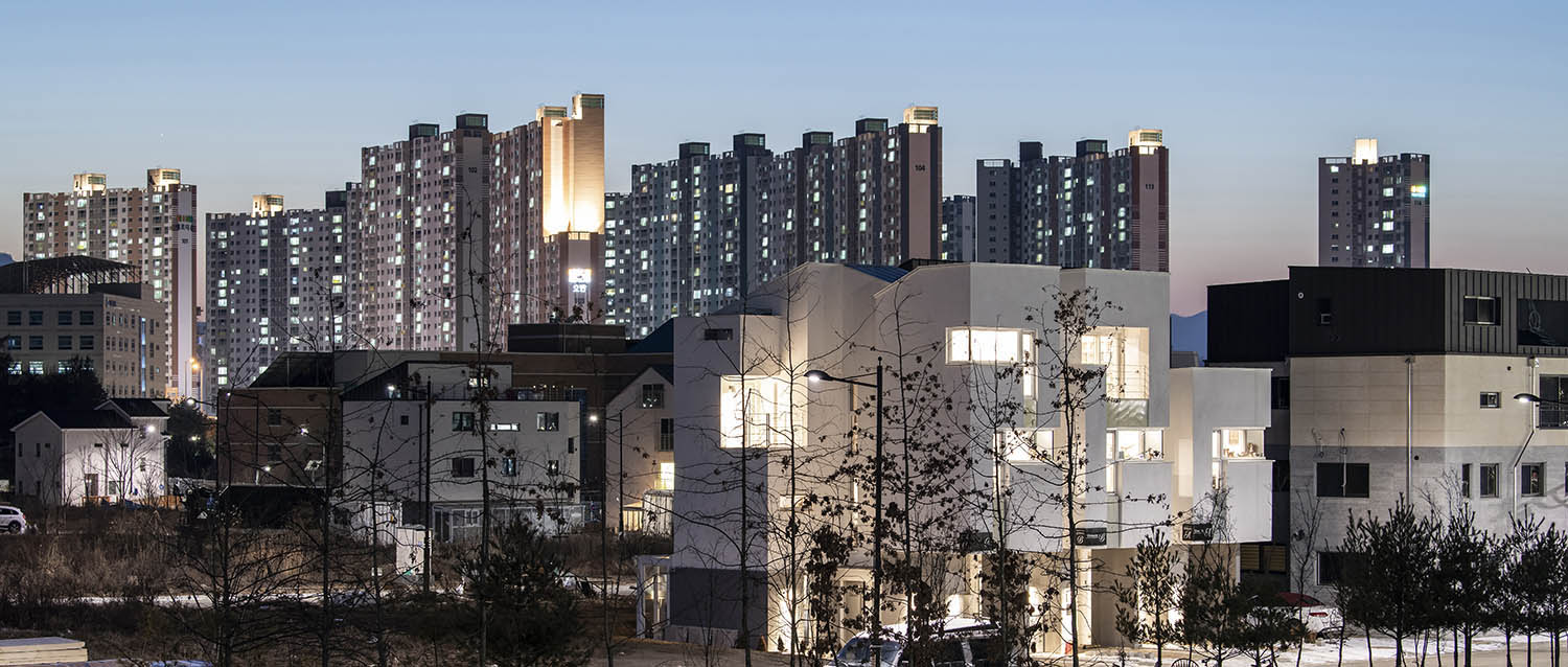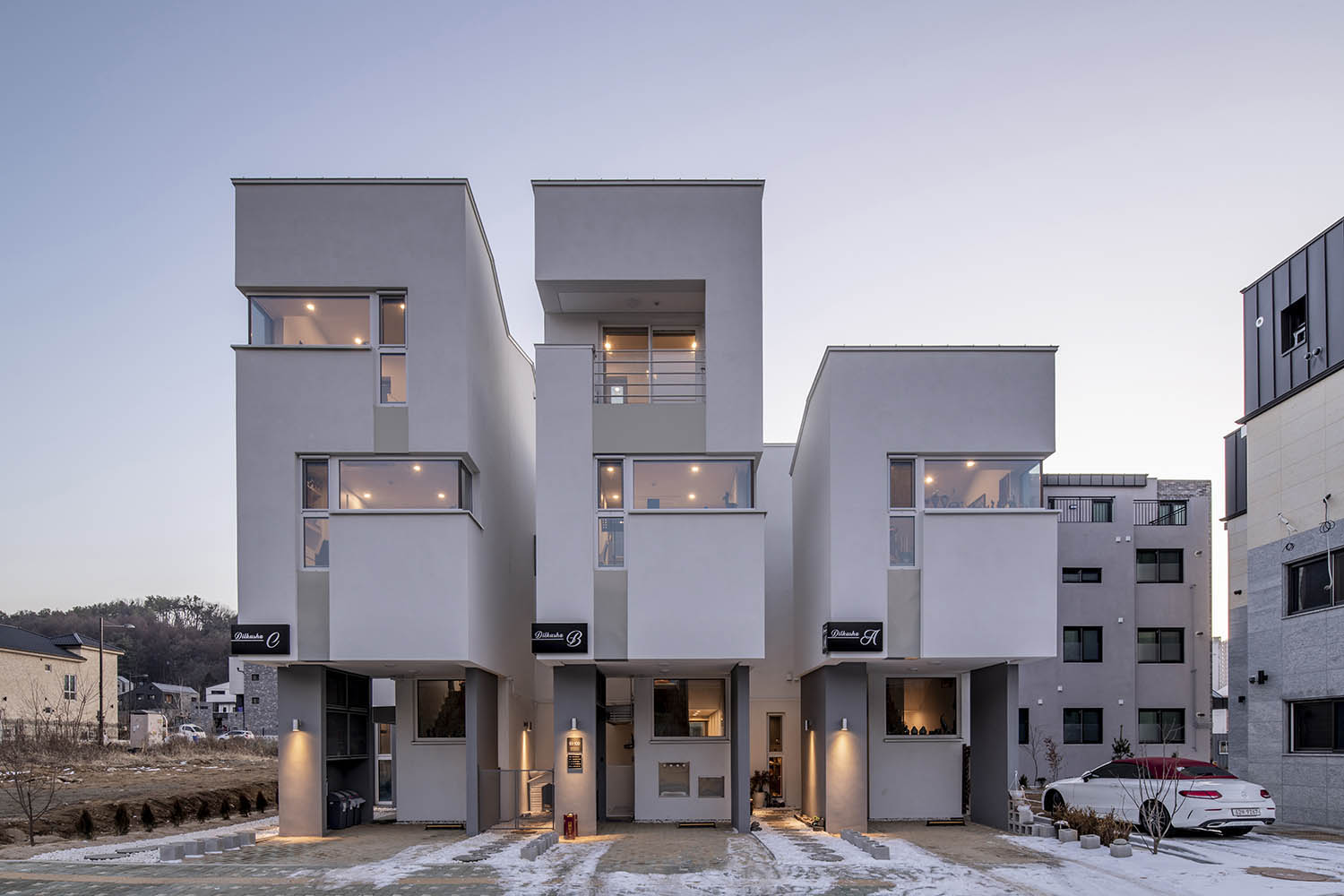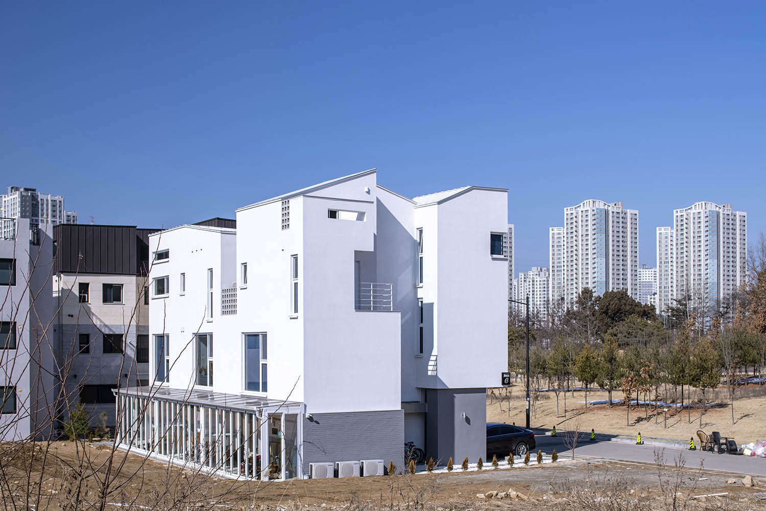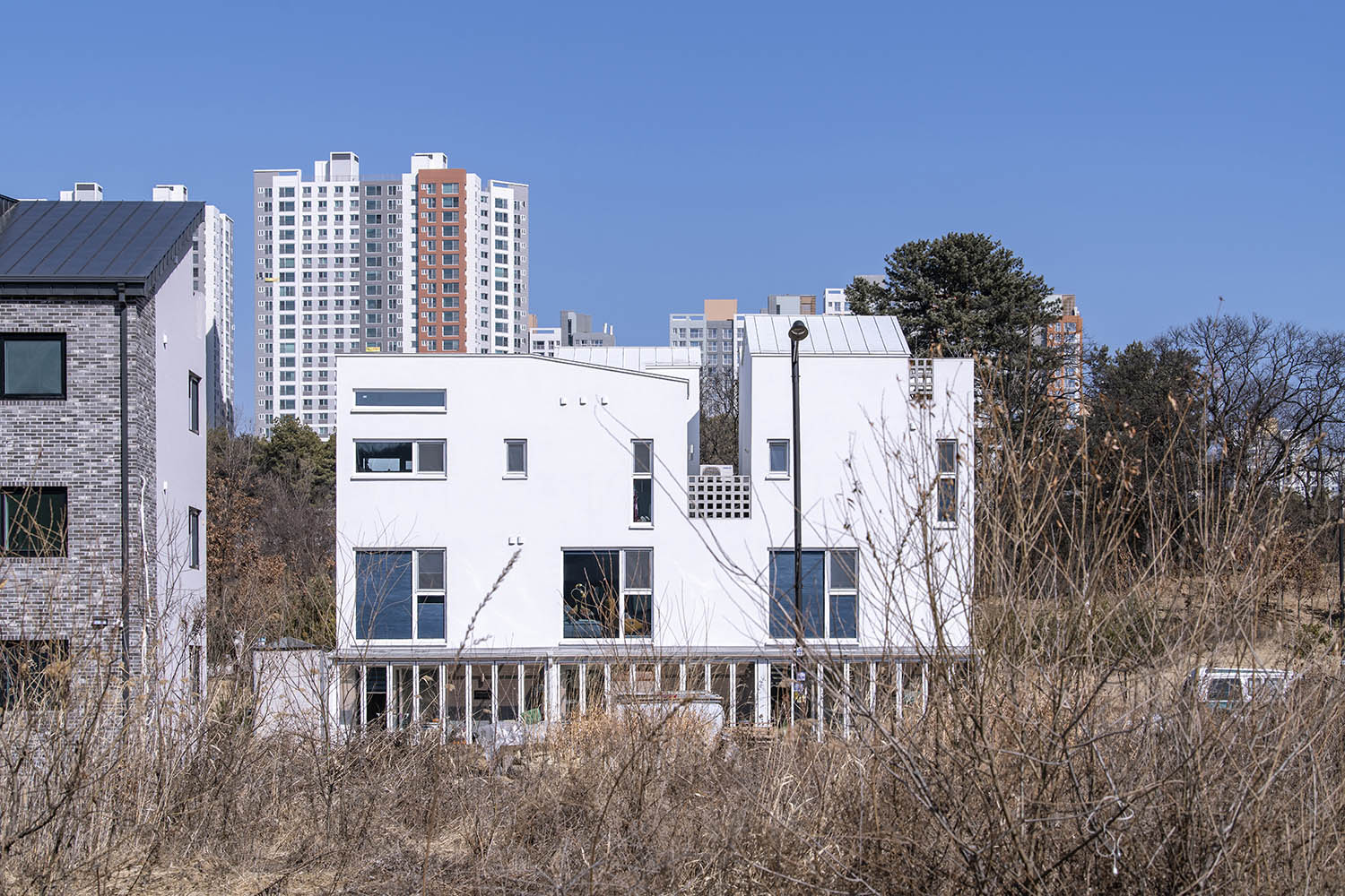 수려한 공원과 나지막한 산으로 둘러싸인 의정부의 민락 2 지구 단독주택지에 위치한 대지는 지구 단위계획상 3가구의 다가구주택을 허용하고 있었다. 건폐율 40%, 용적률 80% 제한으로 비교적 다양한 형태의 주택이 들어설 가능성이 많은 상황이었음에도, 주변은 여느 도시의 다가구주택 형식과 크게 다르지 않은 모습들뿐이었다.