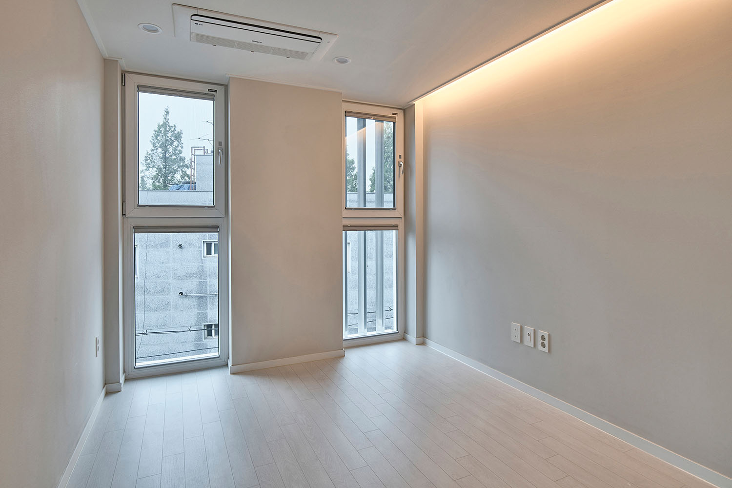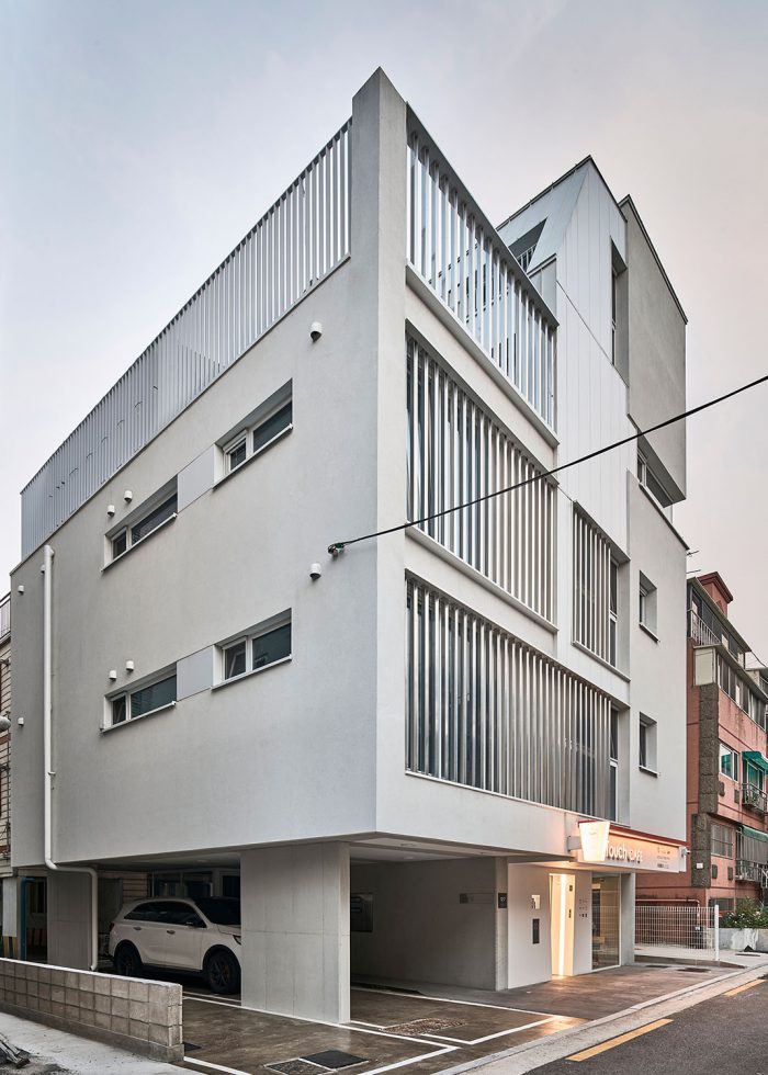 아파트와는 다른 물리적 조건의 도심 속 작은 공동주택이 ‘버는 집’의 노골적 자세가 아닌 ‘사는 집’으로서 배려를 담으려면 어찌해야 할 것인가. 우린 집에 표정을 담아 보기로 했다. 아파트가 가지는 편리성, 쾌적성의 장점을 따라가기 어렵다면 그 그늘인 익명성과 무표정만큼은 벗어나 보면 어떨까 하는 생각이었다. 표정은 주체에 대해 객체가 느끼는 감정의 모습으로, 집이 표정을 갖는다는 것은 그곳에 사는 사람이 단순히 그 공간을 점유하는 것에서 더 나아가 그 집과 감정을 교류한다는 것이고 ‘사는 집’이 되기 위한 중요한 기초가 될 것이라 생각했다. 표정을 만들기 위해 우리가 사용한 장치는 한쪽이 사선으로 접힌 ㄷ자 형태의 알루미늄 루버였다. 이는 단순히 면과 선의 다층적 구성을 통해 외부에서 보이는 표정의 변화만을 의도했다기보다는 비록 작은 원룸이지만 사는 사람이 창을 통해 밖과 소통하는 과정에서 집이 가질 수 있는 다양한 표정을 감지할 수 있기를 기대함이 더 컸다.