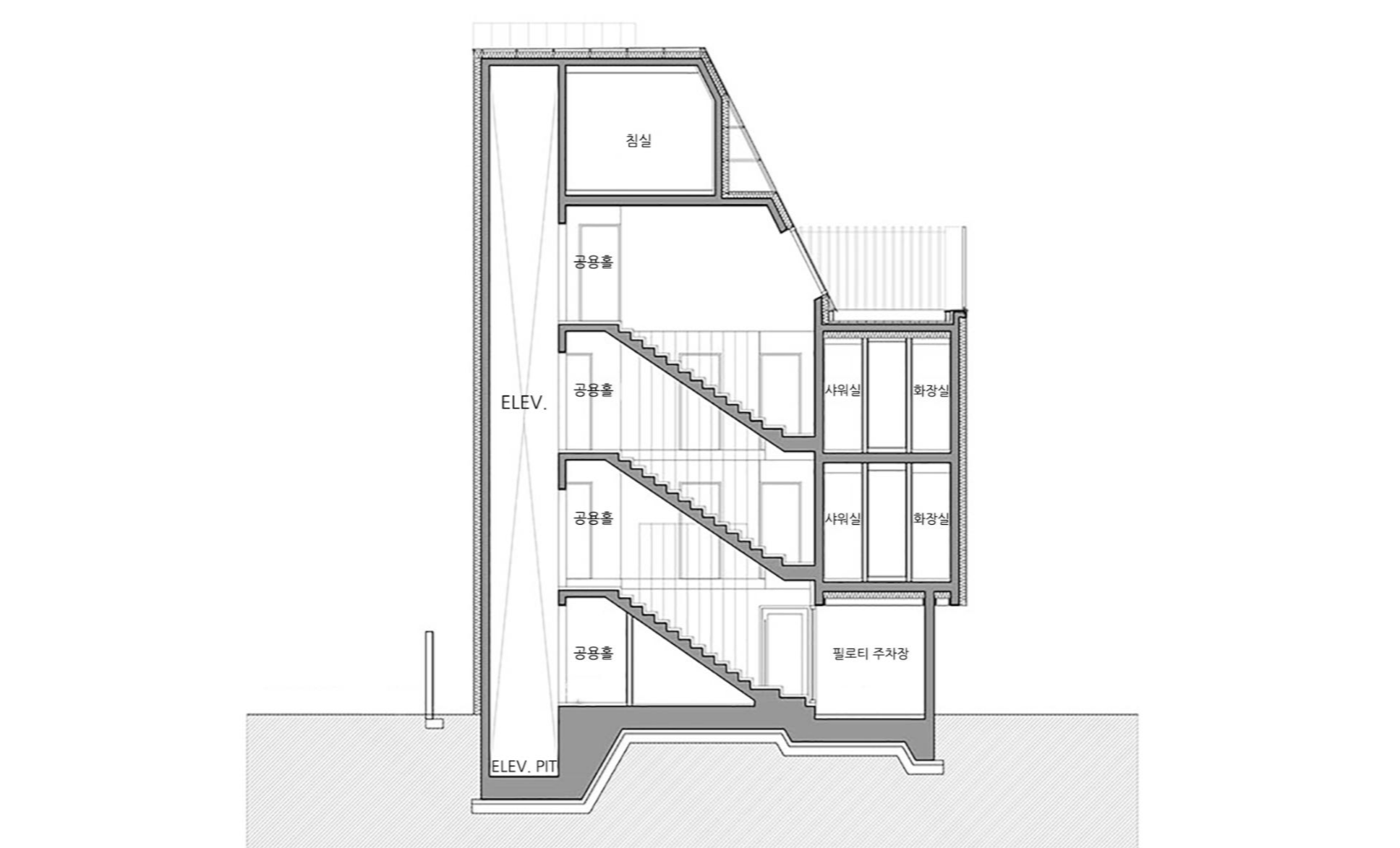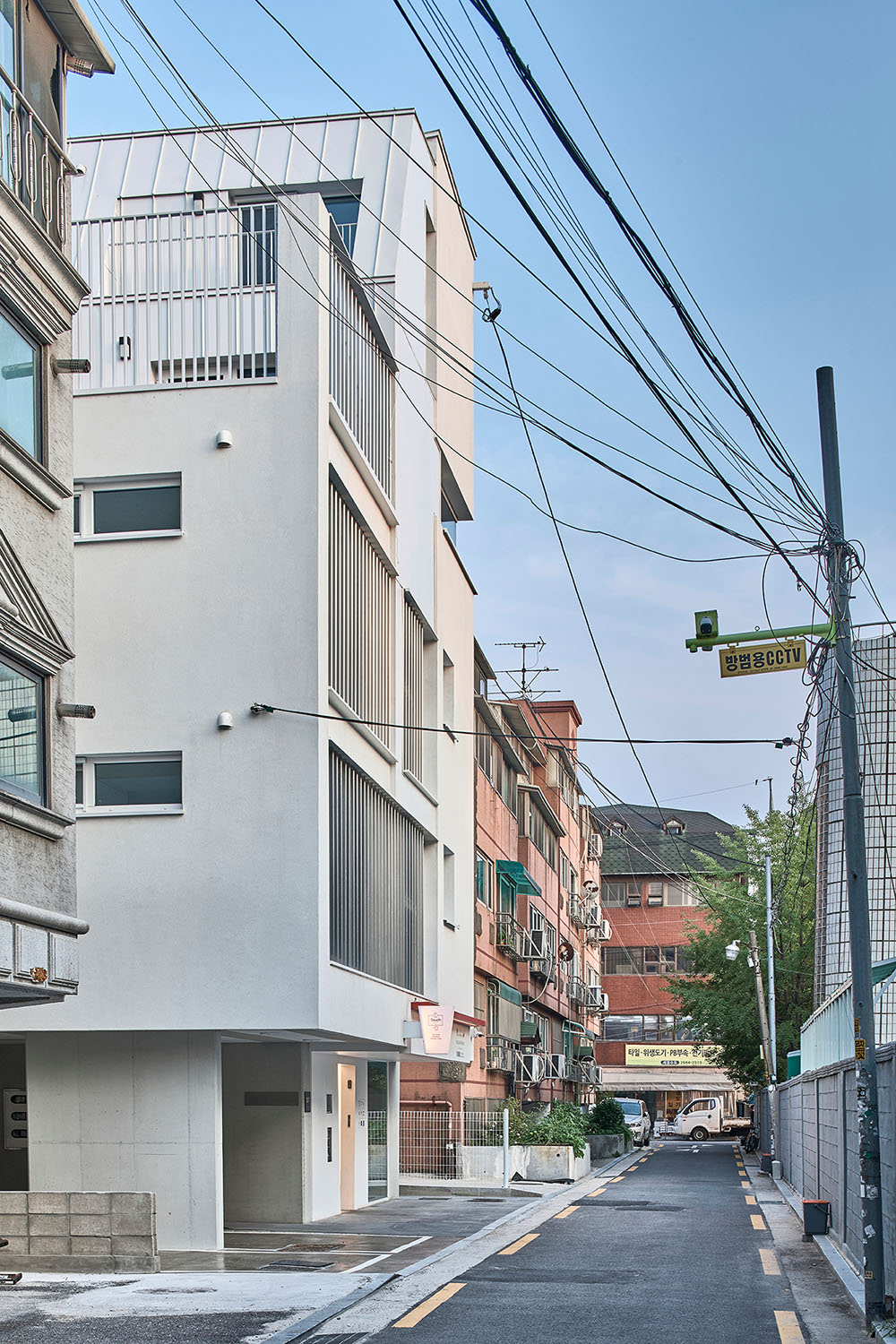 정북 일조 사선을 제대로 받는 작은 땅에서는 대부분 사선제한이 형태를 결정하고 만다. 보이지 않는 선이 면을 제단하고 면이 스트레치 되어 볼륨을 만든다. 그렇게 드러난 건물의 얼굴은 우리에게 너무나 익숙하다. 그 익숙하고 지루한, 개성 없는 얼굴에 표정을 갖게 하고 싶었다. 화장이 아닌 표정을 드러내는 것, 이것이 이번 프로젝트의 중요한 목표점이 되었다.