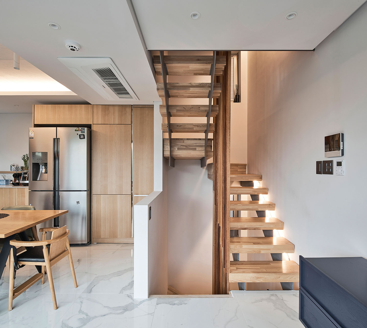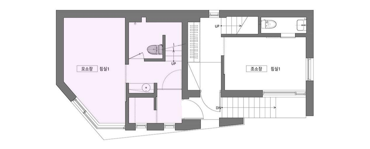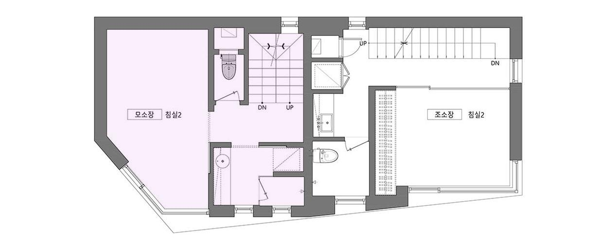 갈등이나 앙금이 남지 않도록 달라지는 채광의 문제(과연 어느 집이 남향을 취할 것인가?)를 조율해 내는 것이 이 집의 계획에 있어 가장 어려운 숙제였다. 두 가족이 원하는 각각의 요구 조건들에 대하여 우선순위를 매기고 비교해 본 결과, 네 식구인 모소장은 면적을, 세 식구인 조소장은 향을 더 원하는 것으로 좁혀졌다. 그래서 내린 우리의 결론은 각자의 집에 이르는 공용홀을 조소장의 집 면적에서 할애해 상대적으로 모소장이 바닥면적을 더 확보하고 대신 조소장은 남향을 취하는 것이었다.