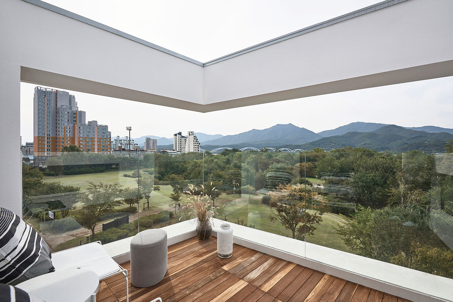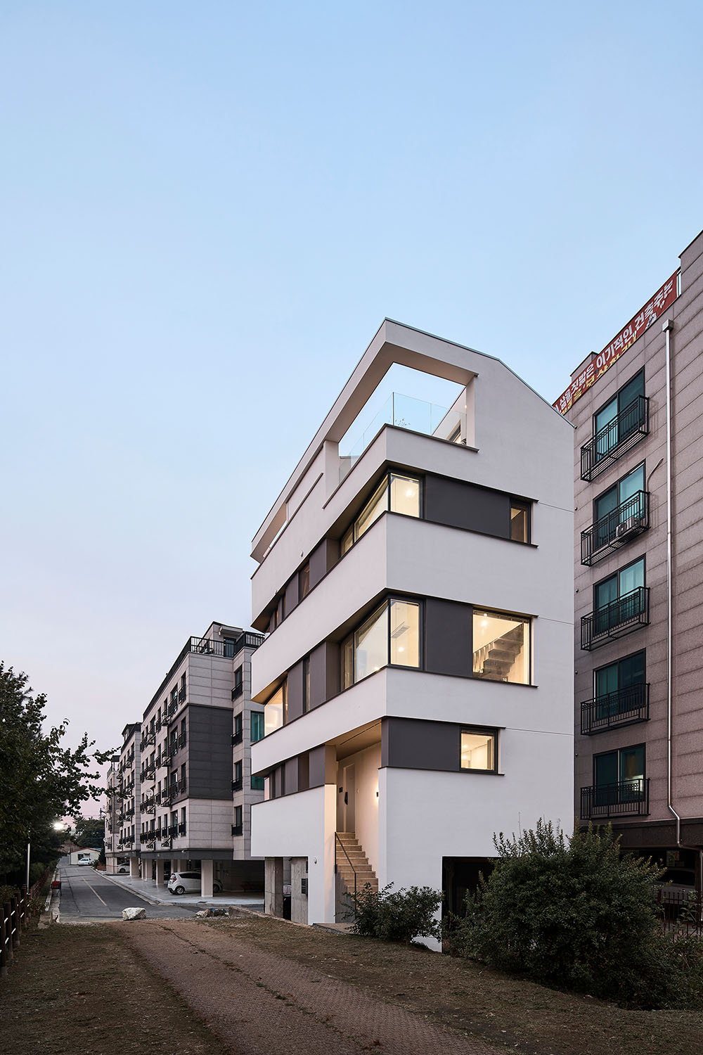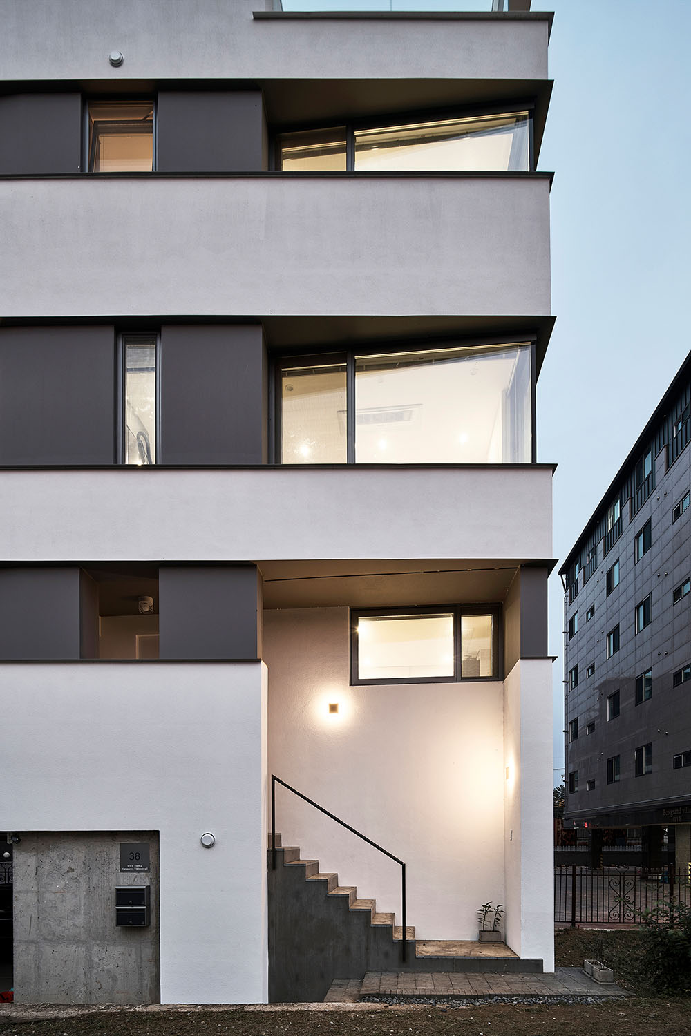 외관은 통일된 디자인으로 두 집의 구별을 두지 않았다. 단순한 건물에 그저 가로로 길게 찢은 창을 층별로 반복해서 설치하였다. 건물의 형태는 땅의 모양을 따르고 내부 실의 구성과 창은 공원과 나란히 두다 보니 그 어긋남이 착시를 만들지만 그것은 단순함이 지루함으로 읽히기를 경계하기 위해 의도된 바이다.