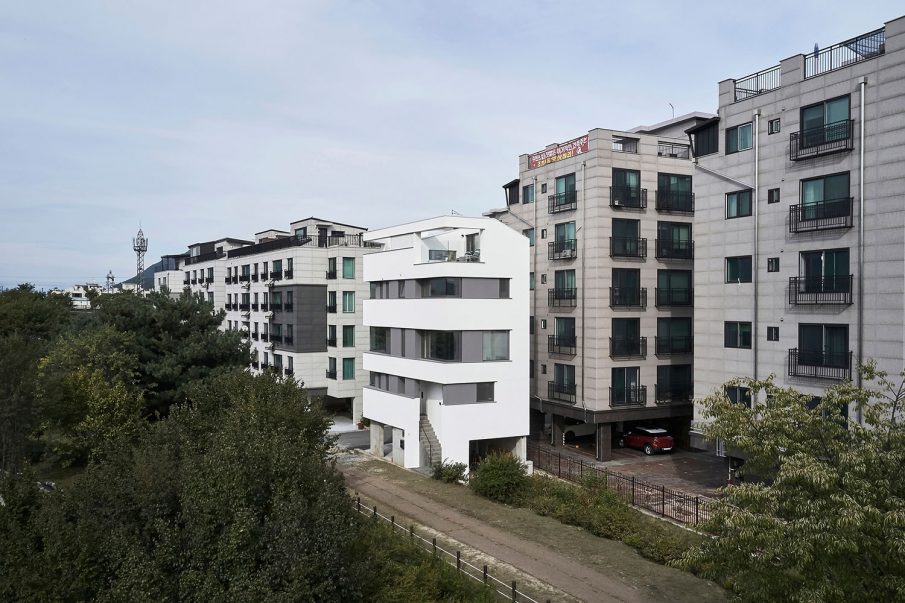 계획을 시작하며 제일 먼저 결정해야 할 것은 집을 어떤 구성으로 어떻게 앉힐 것인 가였다. 층별로 나누어 집을 배치하면 채광(향)은 동등해지고 바닥면적의 활용도는 좋아지겠지만 외부 경관에 차등이 생긴다. 그러나 땅콩집과 같은 형태를 취하고 복층 형식으로 구성하게 되면 채광(향)은 차등이 생기나 높이에 따라 달라지는 외부 경관은 양쪽이 동일해진다. 따라서 우리는 높이에 따라 달라지는 풍경(2층에서는 공원의 숲이 보이고, 3층에서는 그 너머 운길산의 능선이 겹쳐지고 4층에서는 숨겨졌던 북한강과 하늘까지 아우르는)을 선택하였다.