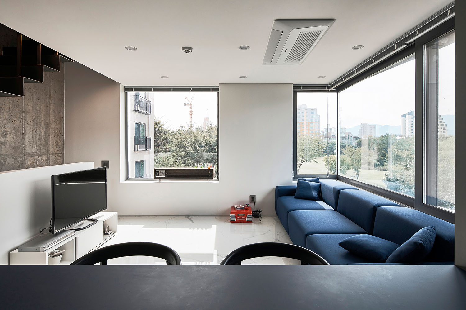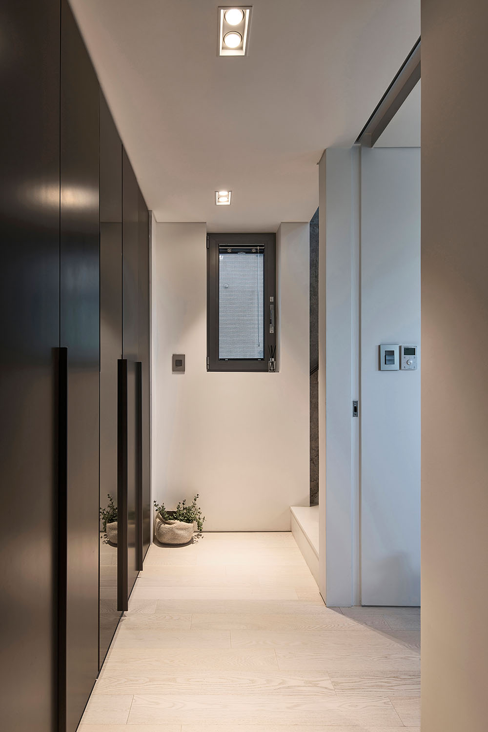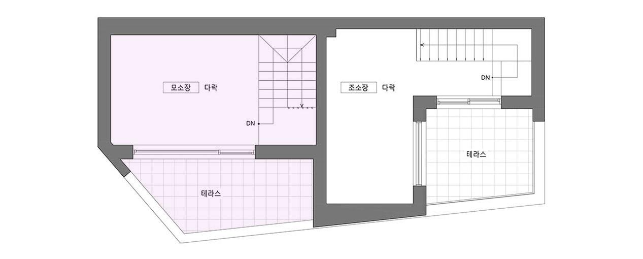 갈등이나 앙금이 남지 않도록 달라지는 채광의 문제(과연 어느 집이 남향을 취할 것인가?)를 조율해 내는 것이 이 집의 계획에 있어 가장 어려운 숙제였다. 두 가족이 원하는 각각의 요구 조건들에 대하여 우선순위를 매기고 비교해 본 결과, 네 식구인 모소장은 면적을, 세 식구인 조소장은 향을 더 원하는 것으로 좁혀졌다. 그래서 내린 우리의 결론은 각자의 집에 이르는 공용홀을 조소장의 집 면적에서 할애해 상대적으로 모소장이 바닥면적을 더 확보하고 대신 조소장은 남향을 취하는 것이었다.