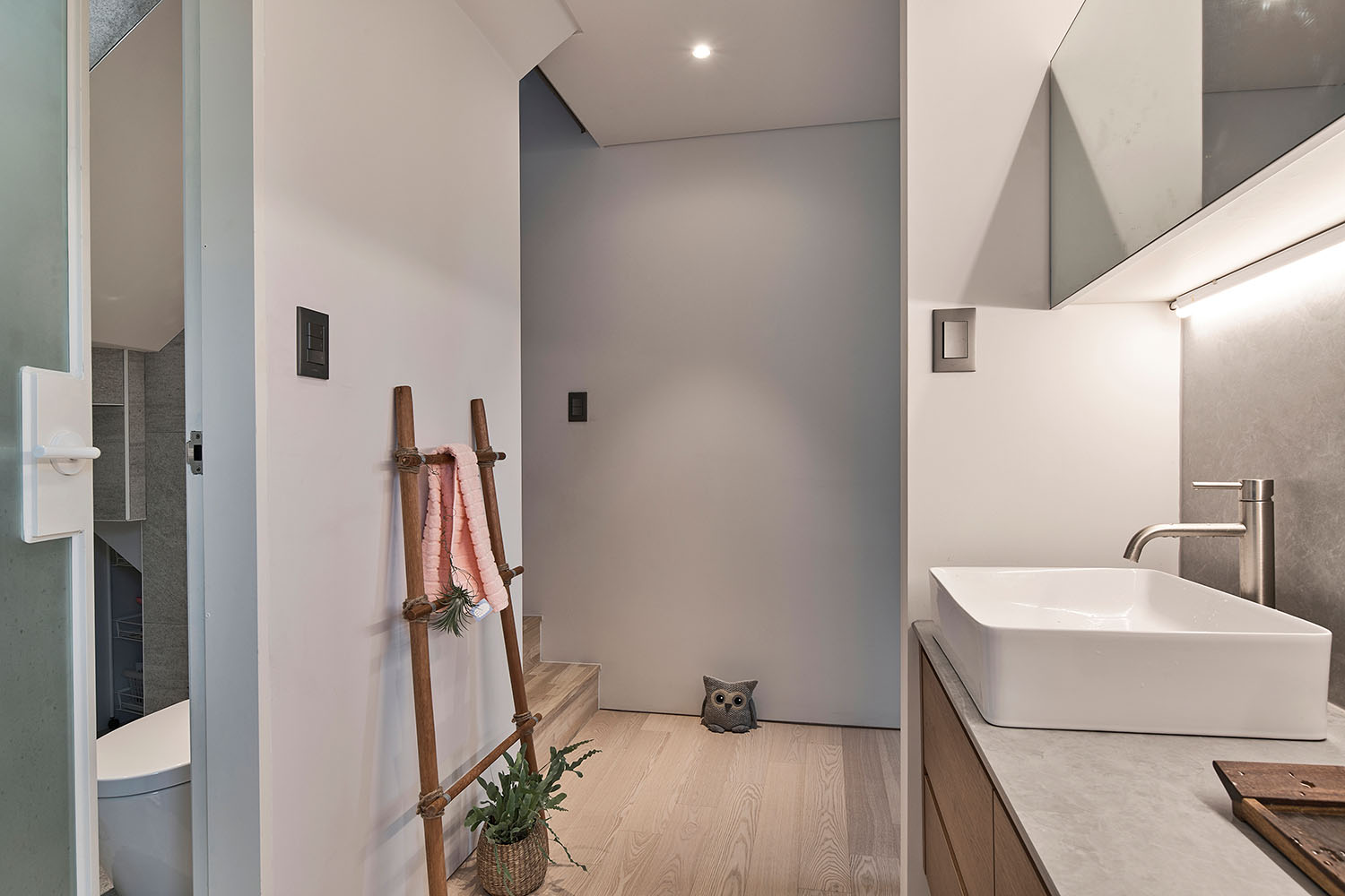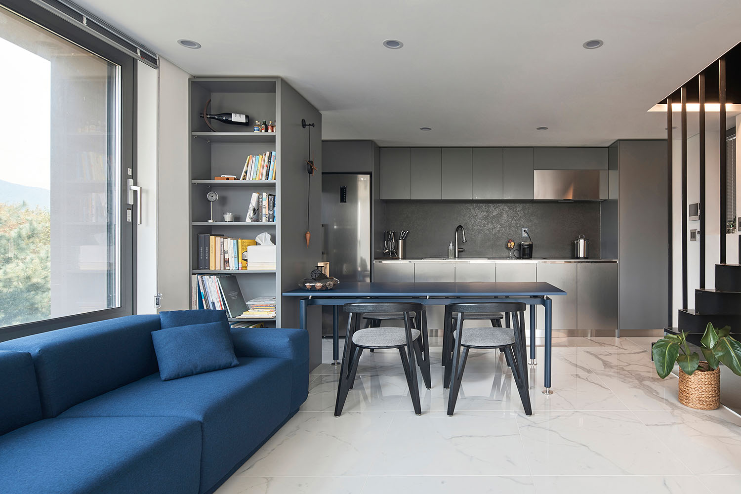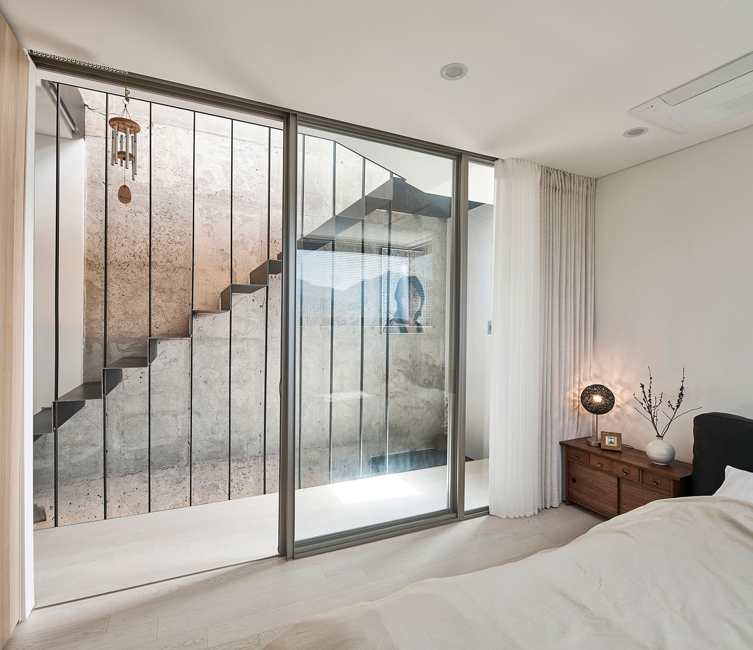 갈등이나 앙금이 남지 않도록 달라지는 채광의 문제(과연 어느 집이 남향을 취할 것인가?)를 조율해 내는 것이 이 집의 계획에 있어 가장 어려운 숙제였다. 두 가족이 원하는 각각의 요구 조건들에 대하여 우선순위를 매기고 비교해 본 결과, 네 식구인 모소장은 면적을, 세 식구인 조소장은 향을 더 원하는 것으로 좁혀졌다. 그래서 내린 우리의 결론은 각자의 집에 이르는 공용홀을 조소장의 집 면적에서 할애해 상대적으로 모소장이 바닥면적을 더 확보하고 대신 조소장은 남향을 취하는 것이었다.