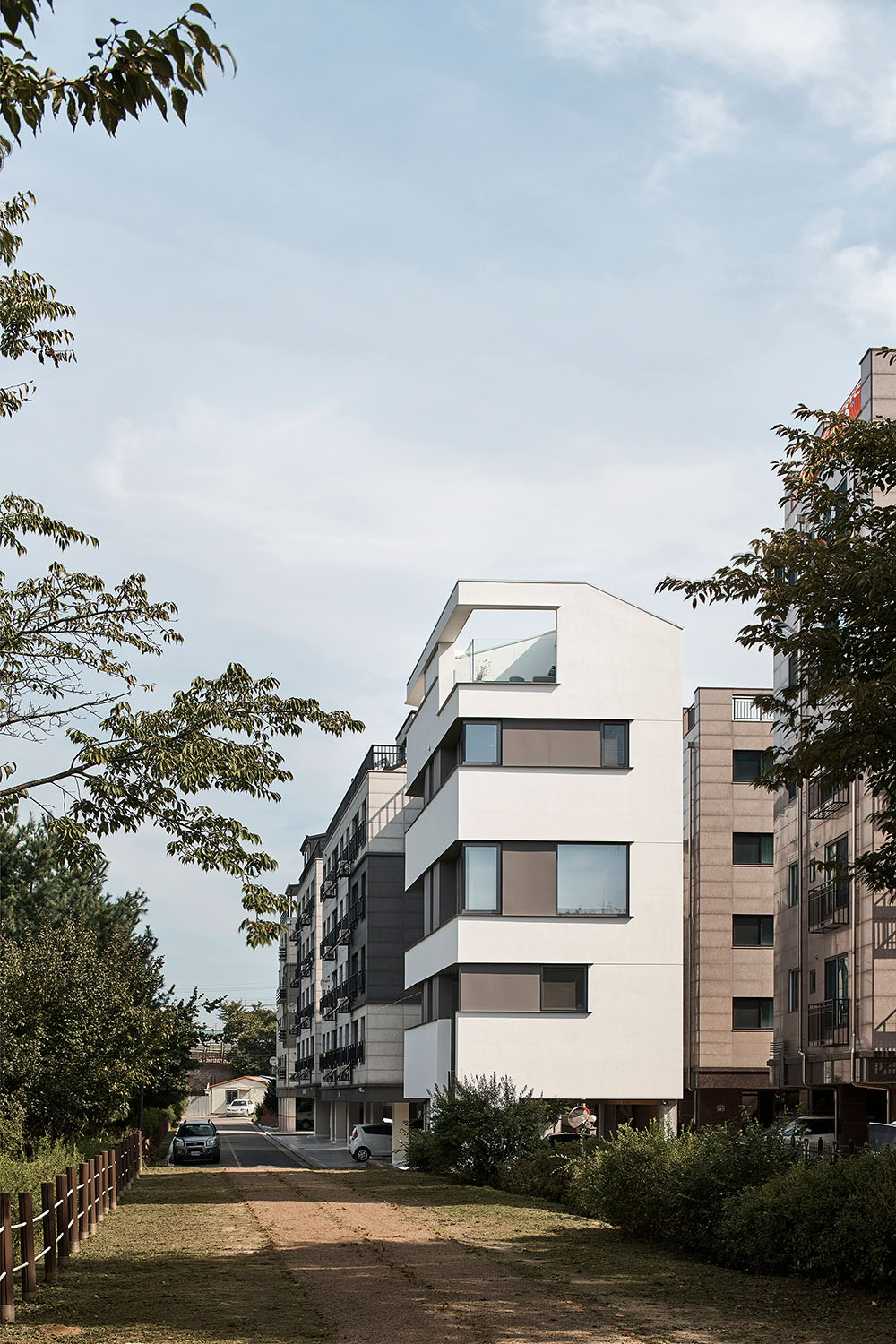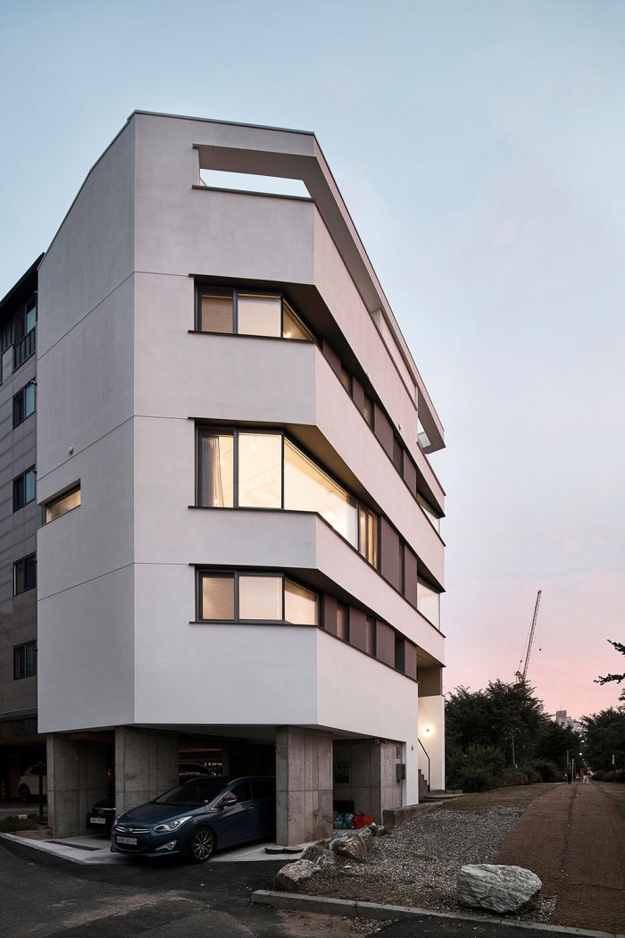 외관은 통일된 디자인으로 두 집의 구별을 두지 않았다. 단순한 건물에 그저 가로로 길게 찢은 창을 층별로 반복해서 설치하였다. 건물의 형태는 땅의 모양을 따르고 내부 실의 구성과 창은 공원과 나란히 두다 보니 그 어긋남이 착시를 만들지만 그것은 단순함이 지루함으로 읽히기를 경계하기 위해 의도된 바이다.