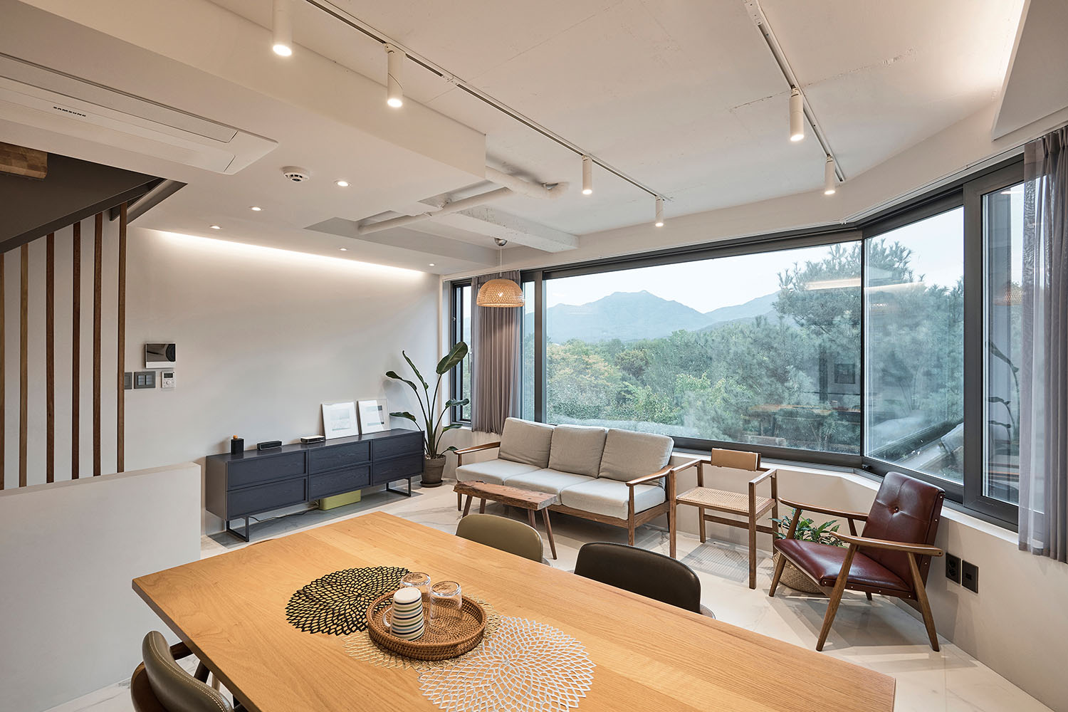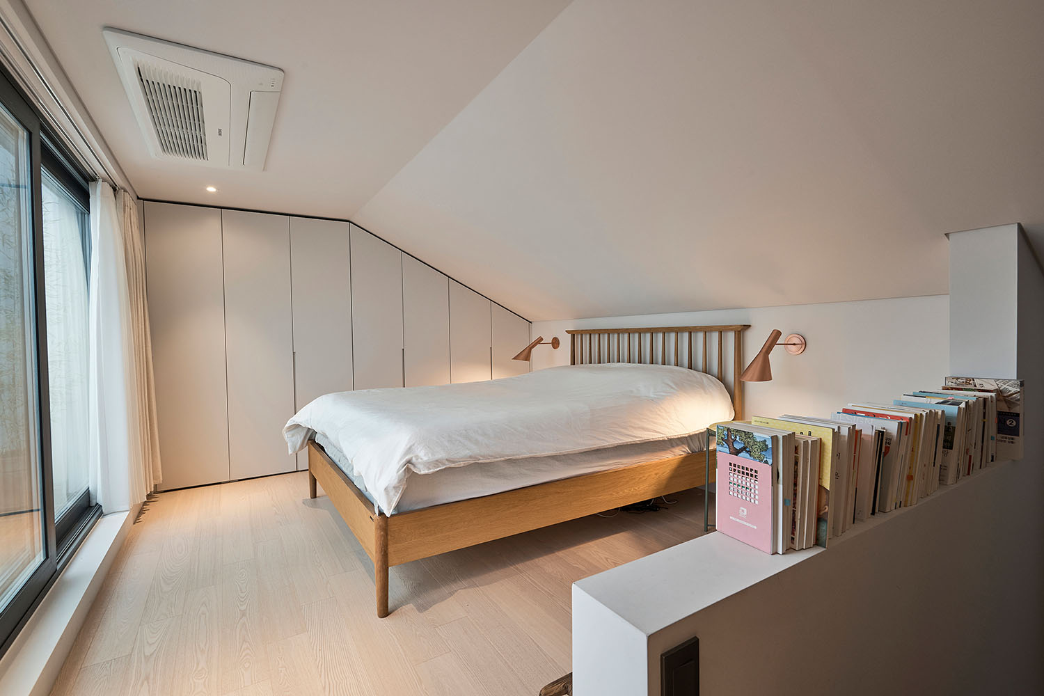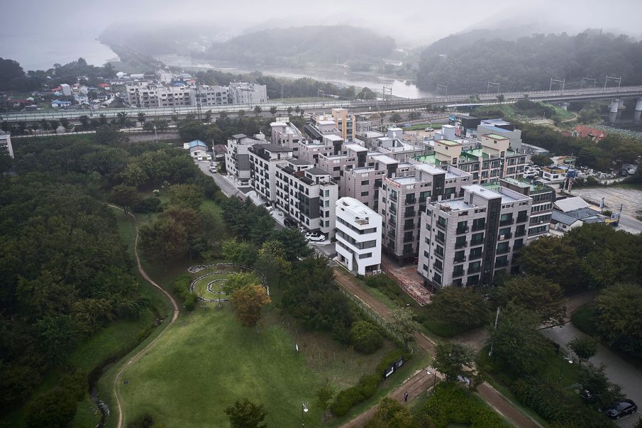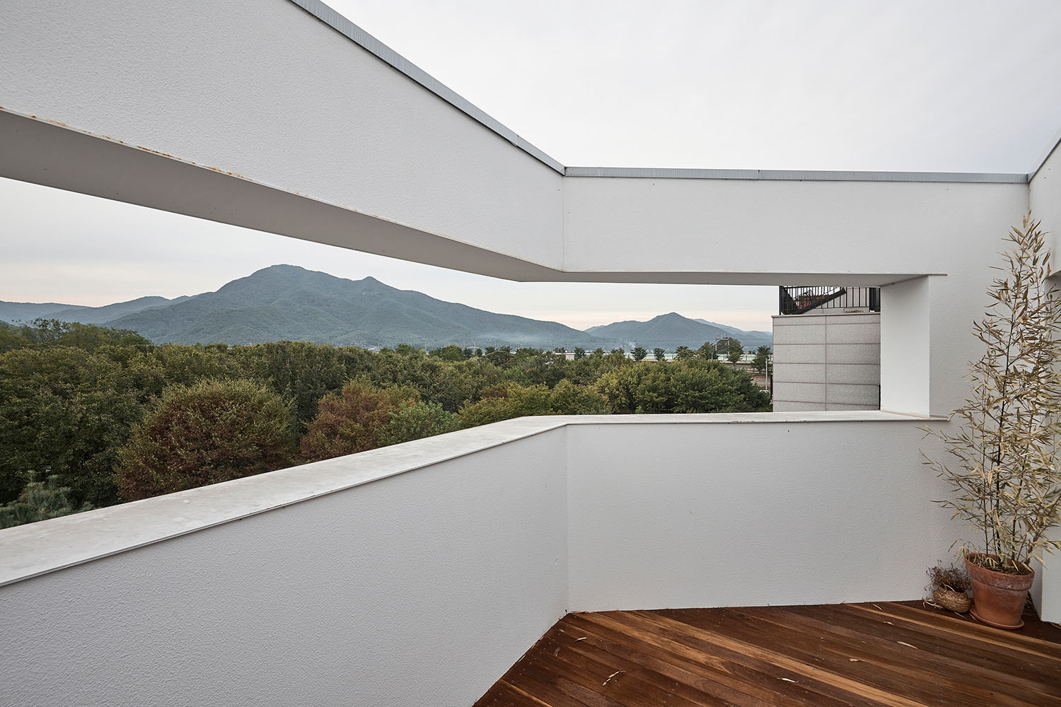 계획을 시작하며 제일 먼저 결정해야 할 것은 집을 어떤 구성으로 어떻게 앉힐 것인 가였다. 층별로 나누어 집을 배치하면 채광(향)은 동등해지고 바닥면적의 활용도는 좋아지겠지만 외부 경관에 차등이 생긴다. 그러나 땅콩집과 같은 형태를 취하고 복층 형식으로 구성하게 되면 채광(향)은 차등이 생기나 높이에 따라 달라지는 외부 경관은 양쪽이 동일해진다. 따라서 우리는 높이에 따라 달라지는 풍경(2층에서는 공원의 숲이 보이고, 3층에서는 그 너머 운길산의 능선이 겹쳐지고 4층에서는 숨겨졌던 북한강과 하늘까지 아우르는)을 선택하였다.