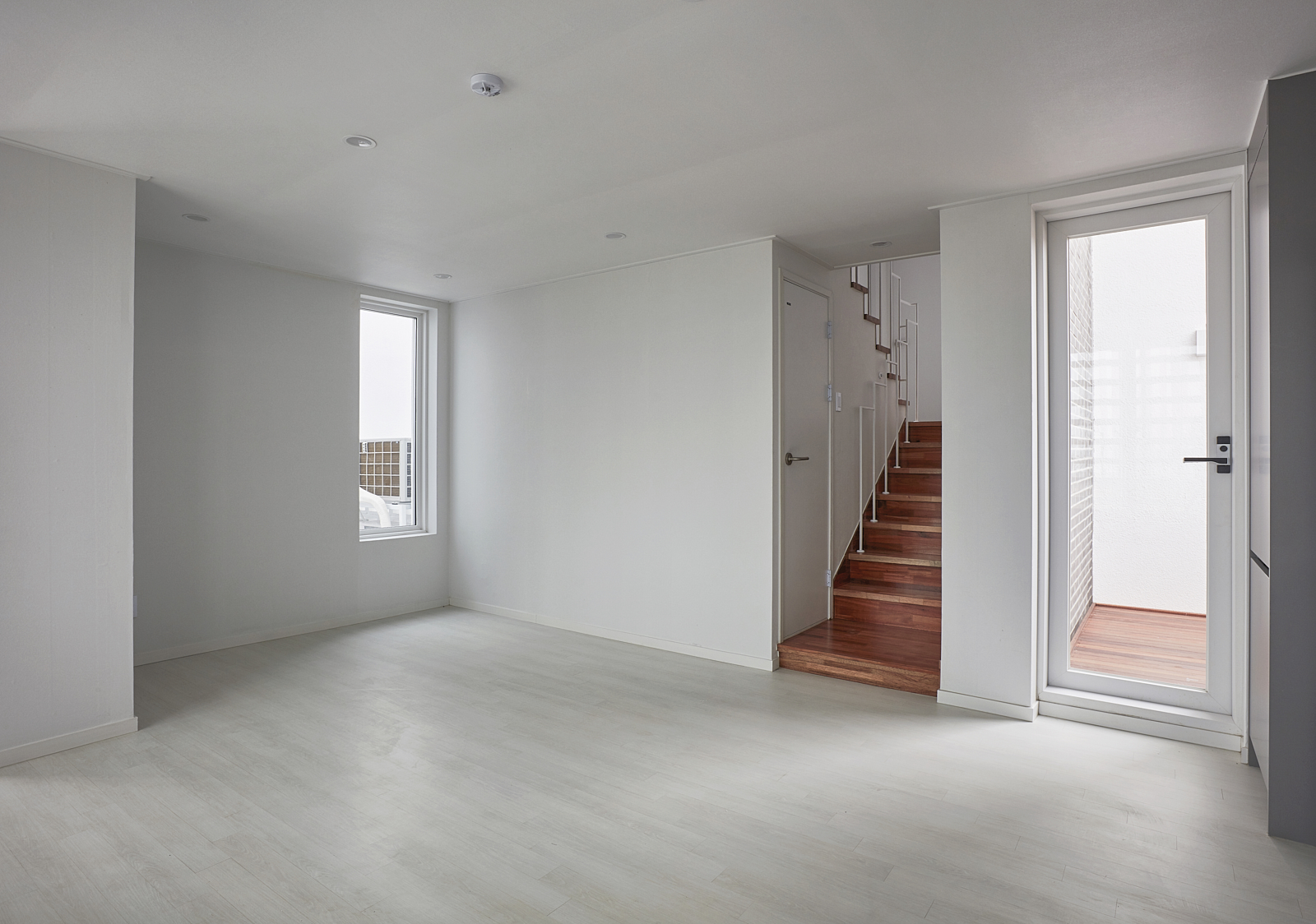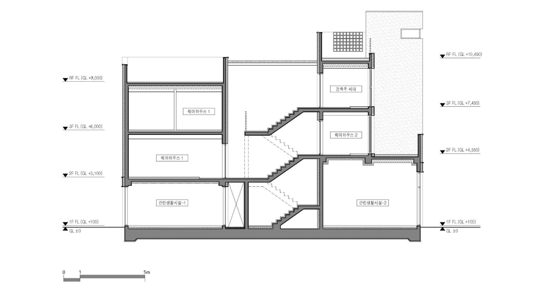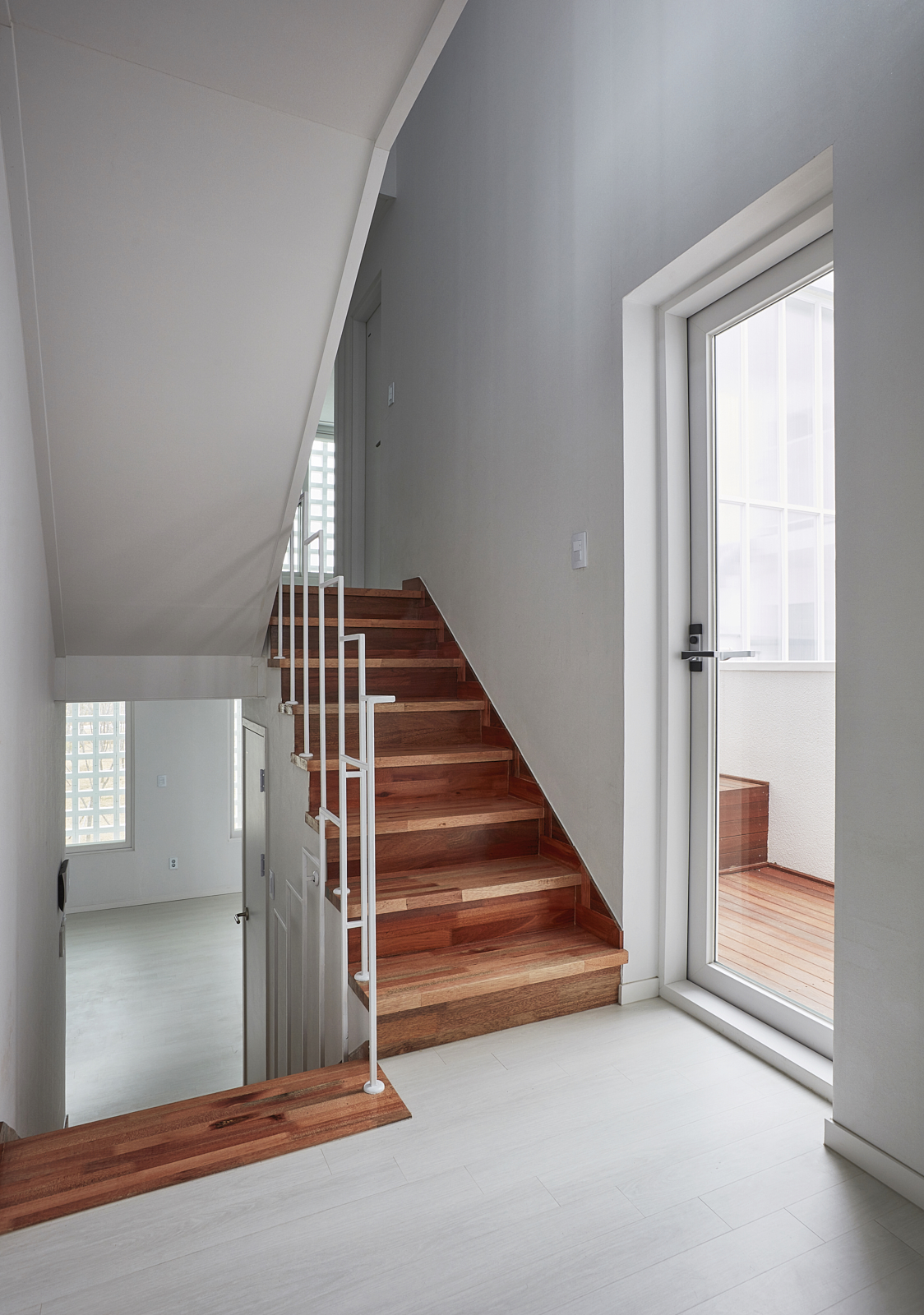 복층으로 구성된 주택 내부의 경우 계단에 의해 반 층씩 엇갈리게 되는 스킵플로어 방식을 적용해, 계단이 수직과 수평 두 방향 모두의 이동 동선을 감당하여 효율적 공간 사용이 가능해지고 층의 명확한 분리가 모호해져 층간 이동의 심리적 부담을 덜 수 있도록 계획했다. 또한 더 나아가 집과 집을 연결하는 공용 계단에서도 이 방식을 적용해, 계단의 폭은 더 여유 있게 확보하면서 공용면적을 최소화하였다.