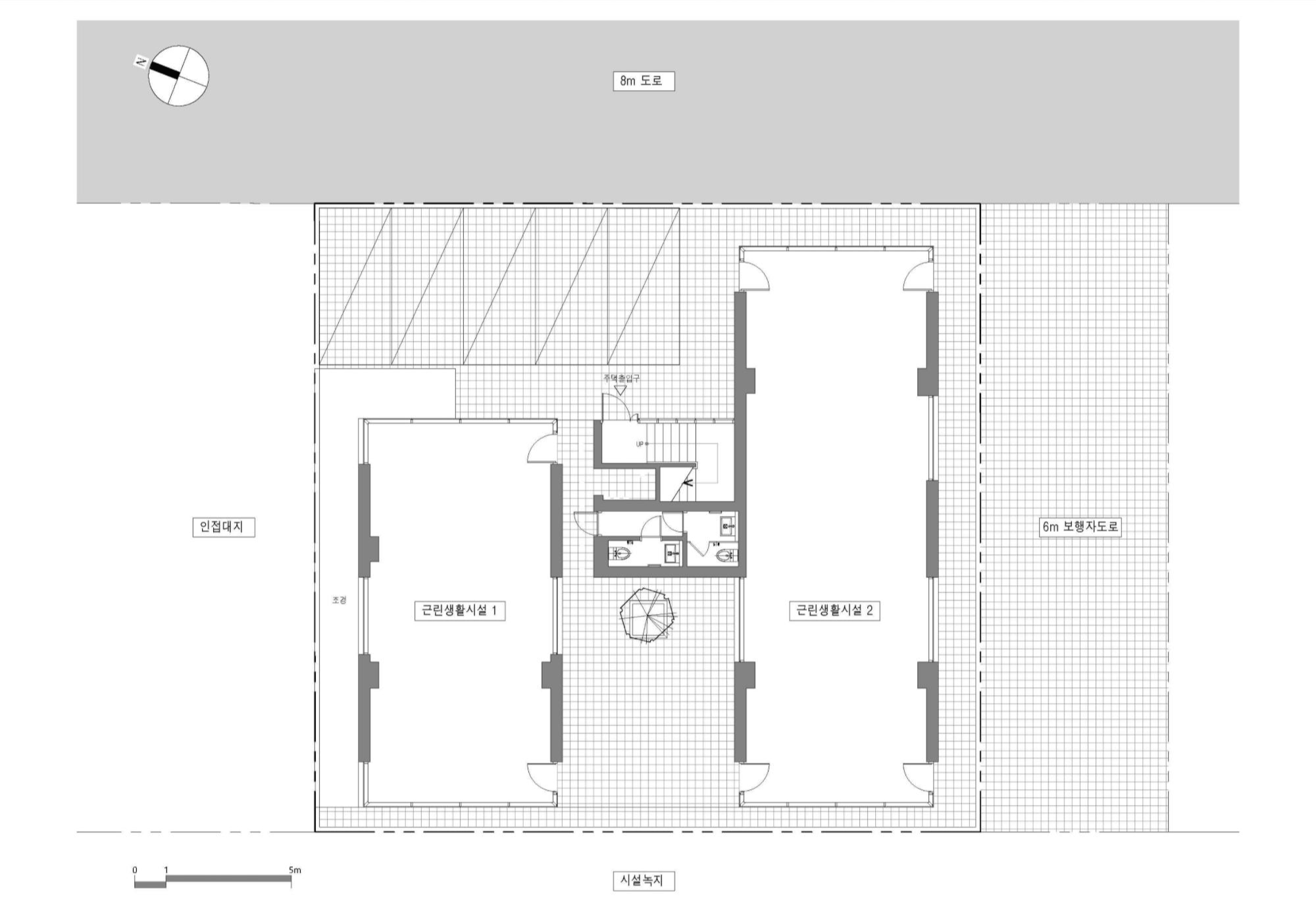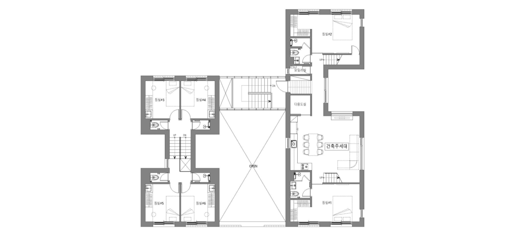 따라서 우리는 건축주가 거주할 1가구를 제외한 2가구는 쉐어하우스 또는 게스트하우스로 운영될 수 있는 구조로 단위세대를 계획하고, 1층의 상가와 쉐어하우스(또는 게스트하우스)가 서로 조응하면 좋은 시너지를 만들어 낼 수 있겠다는 생각에 집의 중심부에 널찍한 중정을 두어, 상권이 형성되기 어려운 지역에 스스로 매력적인 공간을 품어 주변의 상가와 차별화하였다.