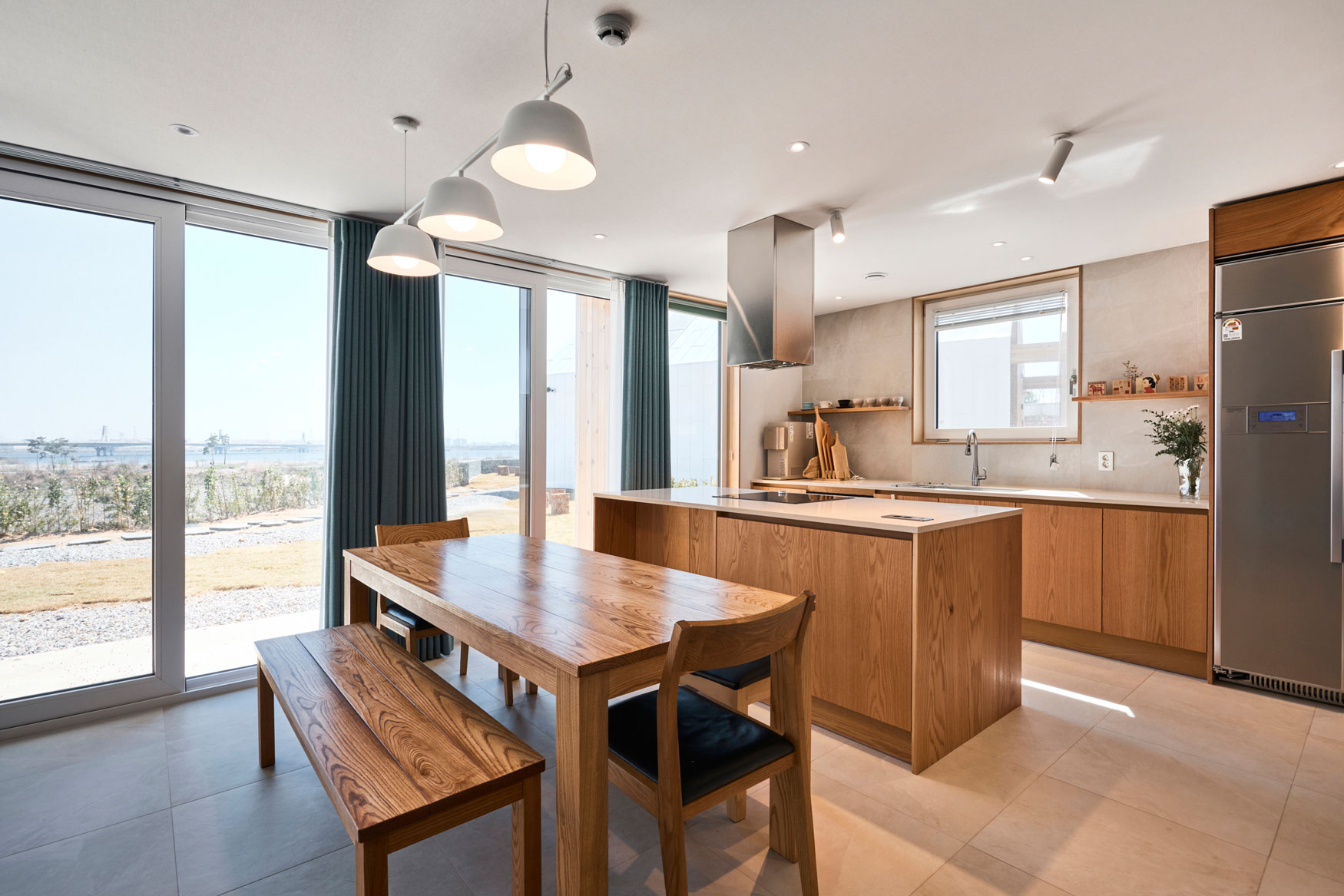 주택의 1층에는 현관과 연결된 공용화장실을 두어 아이들이 쉽게 이용하게 했다. 누구든 방문하면 손을 씻고 들어간다. 중문을 통해 집의 거실로 들어오면 주방과 다이닝이 통합된 공간으로 다섯 식구가 있기에 부족함이 없어 보인다. 거실에는 마당으로 연결된 출입문이 여러 개 있다. 간절기에 열어두면 내외부가 따로 없다. 주방에서 연결된 다용도실도 빼놓을 수 없다.
