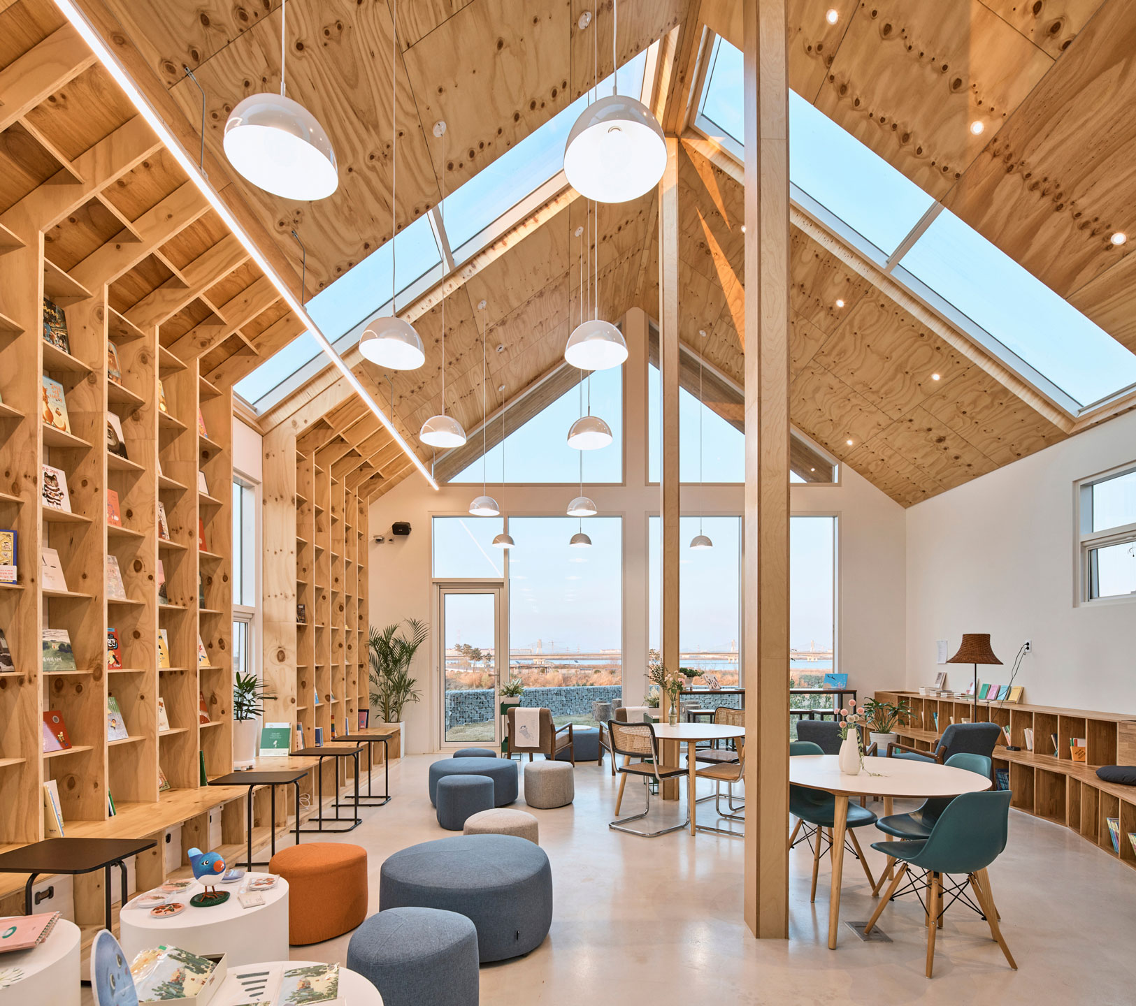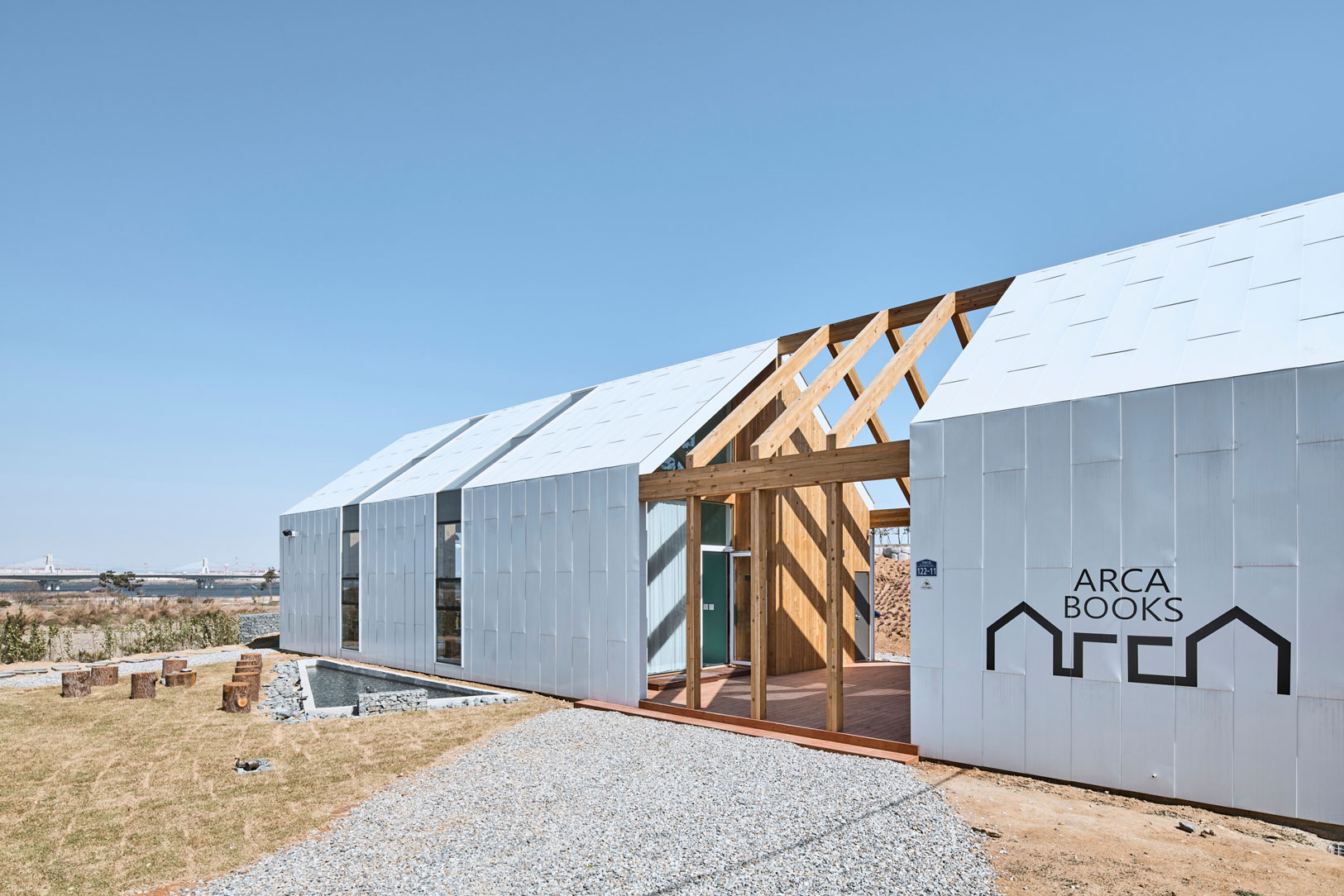 서점동은 거주하는 집과는 독립된 공간이고 건축주에게는 삶의 터전이다. 아이들을 가르치는 일보다 아이들과 소통하는 일에 매진하고 싶다는 건축주는 독서토론, 인문학 토론, 문학의 밤과 같은 프로그램도 계획했다. 보통 서점이란 곳이 서가로 가득 채워진 공간으로 인식되는데, 우리는 책이 중심이 아닌 책을 매개로 한 소통의 공간을 제안 드렸고, 이 제안이 받아들여졌다. 인적이 드문 농촌에 작은 도서관이자 찾는 이에게 쉘터 같은 공간을 제공하고 싶었다. 서점은 외부에서 보면 폐쇄적으로 보일 수 있지만 안에서는 평택호와 북스테이를 시선으로 연결하여 개방감을 제공했으며, 복층 높이의 구조가 이에 한몫한다. 천창을 지붕과 벽으로 연결 지어 햇빛이 내부로 들게 한 점은 플랜테리어를 고려해 식물들이 잘 자라게 하기 위한 장치이다.
