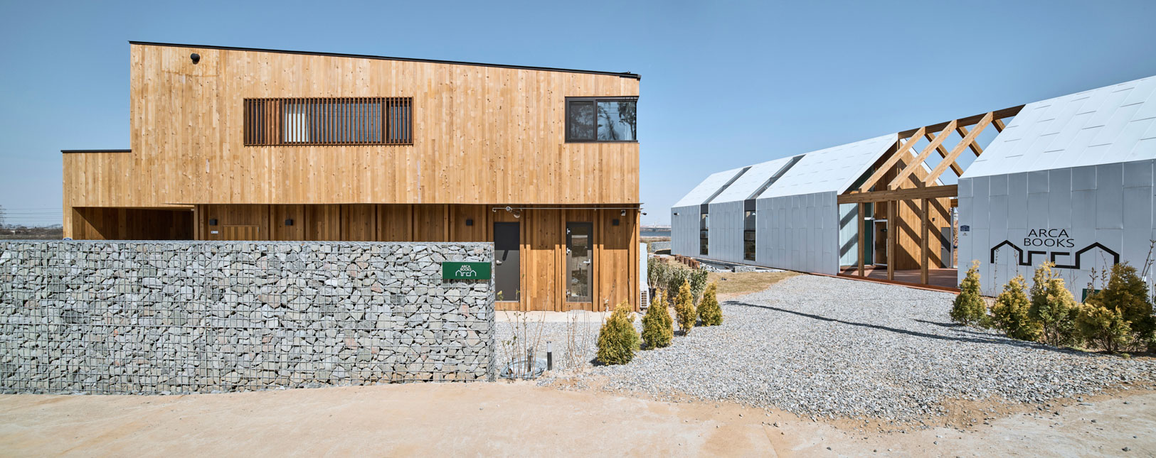 이 집이 여느 집과 다른 점은 서점과 한 데 이루어져 있음이다. '책과 노니는 집'이라 명명한 것도 이 때문인데 도시의 빽빽함보다 섬처럼 고독함이 책과 어울린다는 건축주의 취향이 반영된 장소다. 건축주는 여러 지역의 서점과 북 스테이를 돌아보았고 이곳은 다른 장소이길 바랬다. 아마도 돌아본 서점과 북스테이들이 집의 형태로 운영되는 것을 보고 작다고 느낀 모양이다. 서점에는 아이와 같이 읽을만한 동화로 채울 계획이다. 이곳에 이르는 길에 논과 습지들로 인적이 드문 환경이라 서점을 찾는 방문자에게는 생경한 길이겠다 싶다.