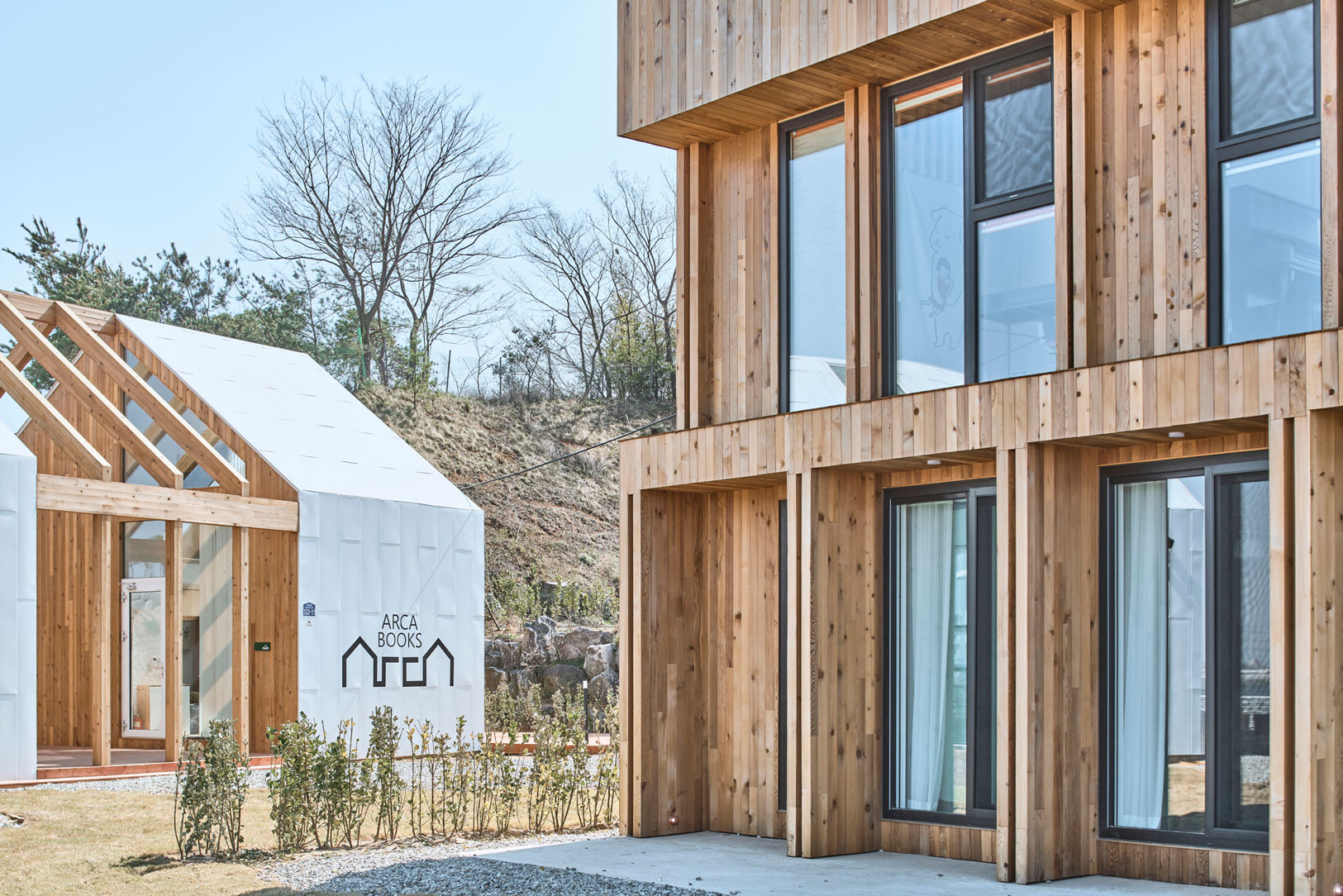 다섯 식구가 거주할 주택과 동화체험 공간인 서점, 방문객을 위한 북 스테이를. 건축주 가족에게 알맞은 집터와 규모를 찾는 게 우선이었다. 깎여 나간 야산을 등지고 집이 앉기에는 채광이 불리하고 서점에 막혀 조망이 좋지 않았다. 더구나 대지에 높이차이까지 발생하여 추후 서점과 주택의 동선에도 영향을 미치는 상황이었다. 따라서 건축주가 제시한 조건 안에서 배치부터 다시 검토하는 데 시간과 노력이 소요됐다. 도시의 집과 다른 대목이다. 건축주는 자연과 소통하고 자연스럽게 마당으로 연결해서 편안한 집이 되길 원했는데, 특히 공사비를 걱정하신 건축주는 집의 규모를 특정하지 않았지만 서점은 규모를 최대한 크게 하고 싶어 했다.