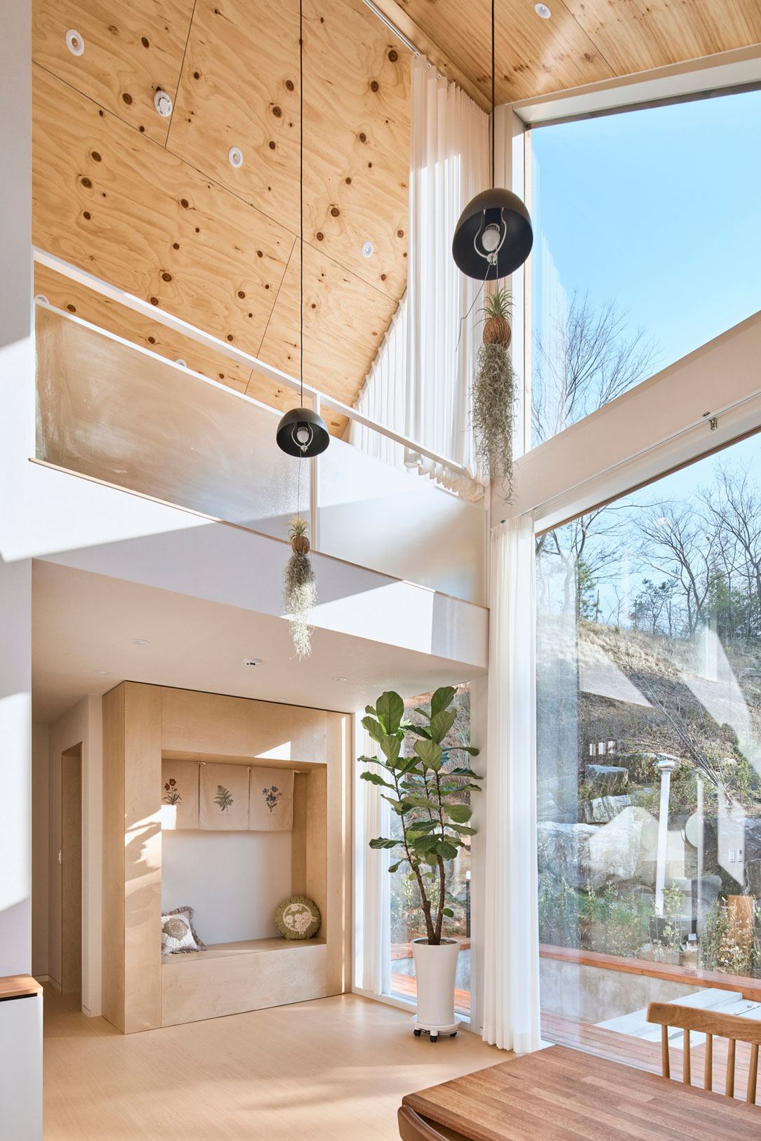 아파트에 살고 있던 건축주는 자신의 거주형태에 빗 데어 아이들의 방과 안방, 거실을 얘기하며 집의 규모를 가늠한다. 각각의 공간을 조직하는 일은 건축가의 몫이다. 세 아이가 개별로 방을 갖게 하고 싶었지만 집이 커지는 것을 우려해 딸들의 방에 다락을 얹어 계단이 있는 복층으로 계획했다. 2층 규모로 설계한 집의 거실은 자연스레 1층에 있고 마당과 연결된다. 2층에는 가족들의 침실이 놓이는데 복도를 통해 바로 연결되는 구조보다 거실이 연장된 공간으로 연결동선에 여유를 더한다. 안방은 테라스를 끼고 평택호 조망이 제일이다.