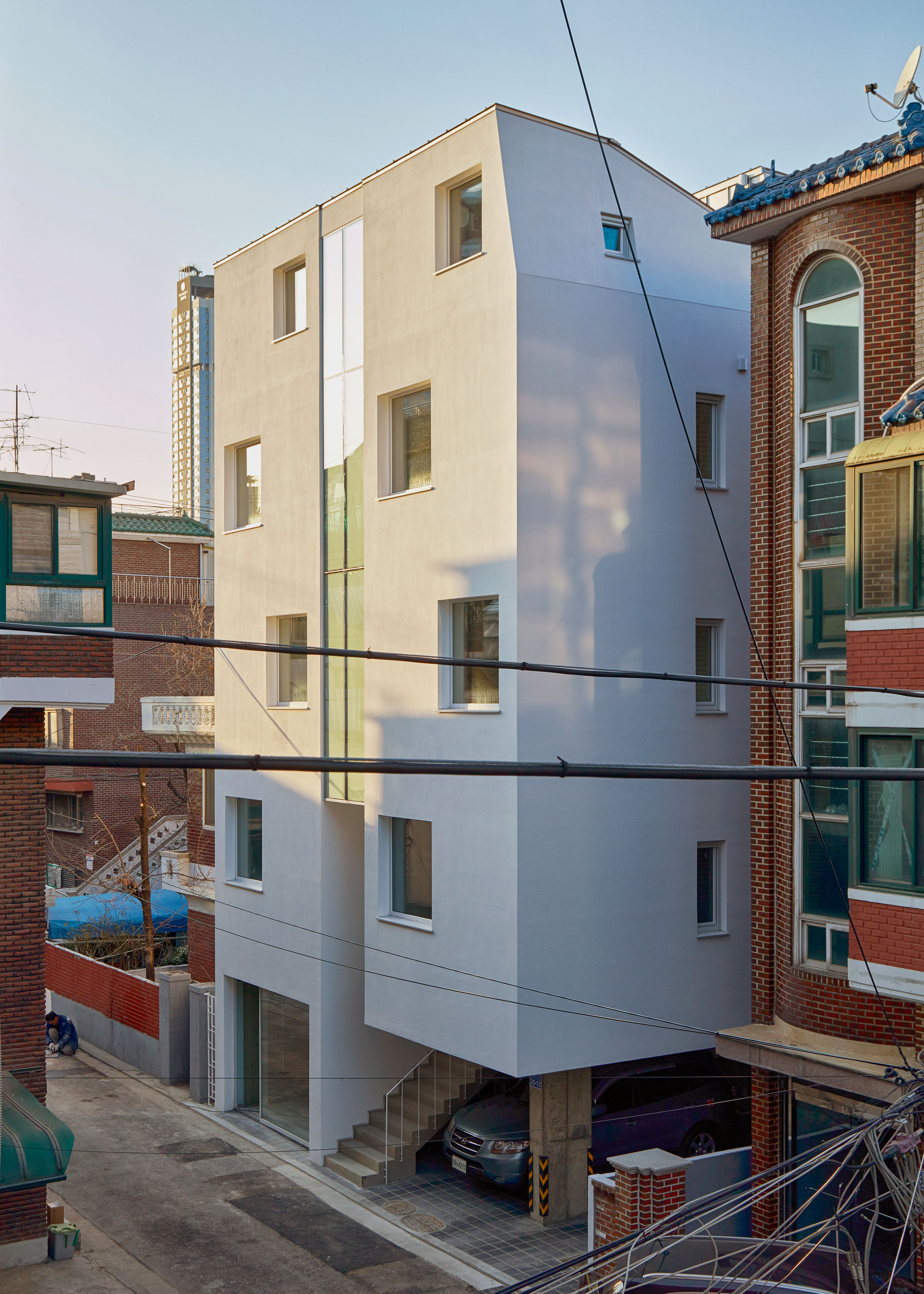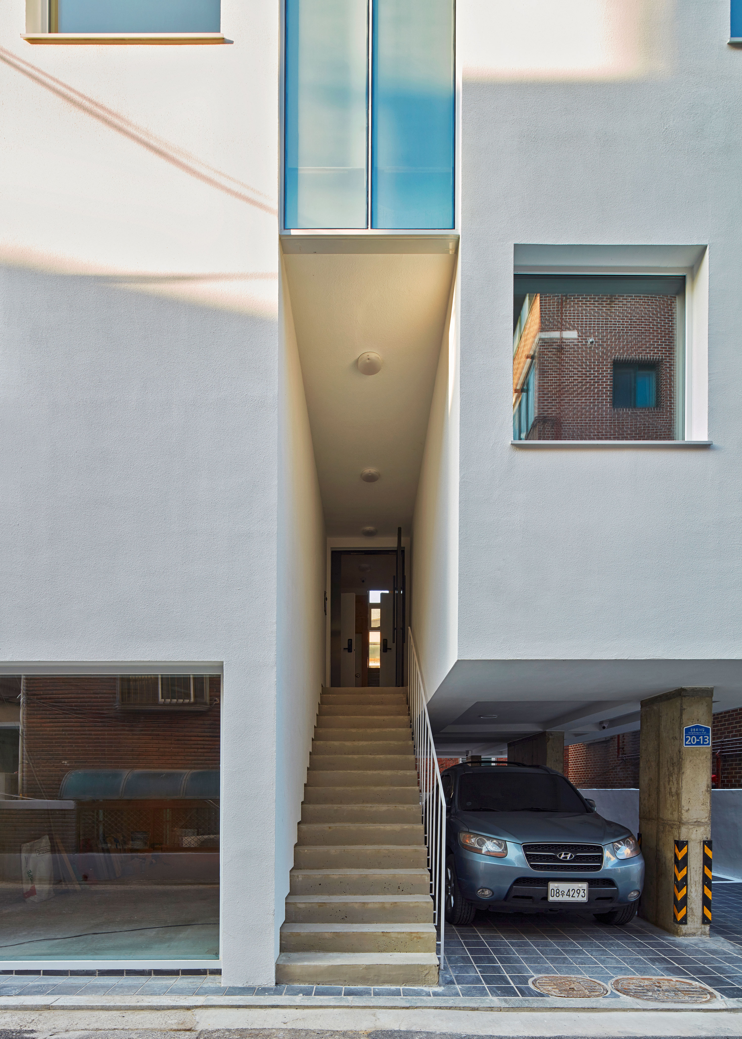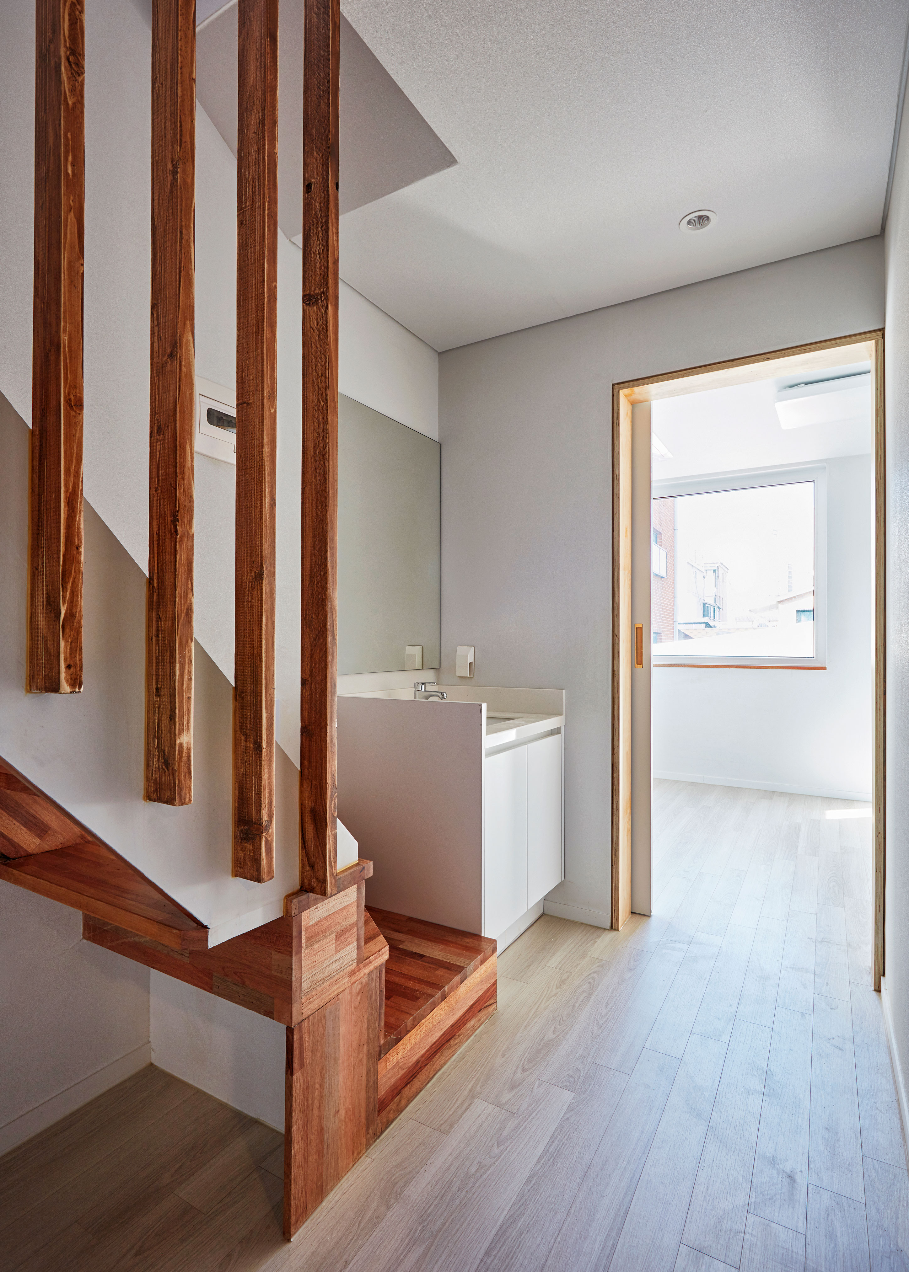 이웃한 집들 사이에 낀 대지 상황은 집을 깊숙이 자리하게 했다. 1층 근린생활시설과 주차장 사이, 이 집의 주된 접근 통로인 계단을 오르면 전면으로 나온 집과 깊숙하게 자리한 집이 병렬로 연속되어, 2층 원룸 형태의 집들과 3층 복층의 집들로 구성된다.