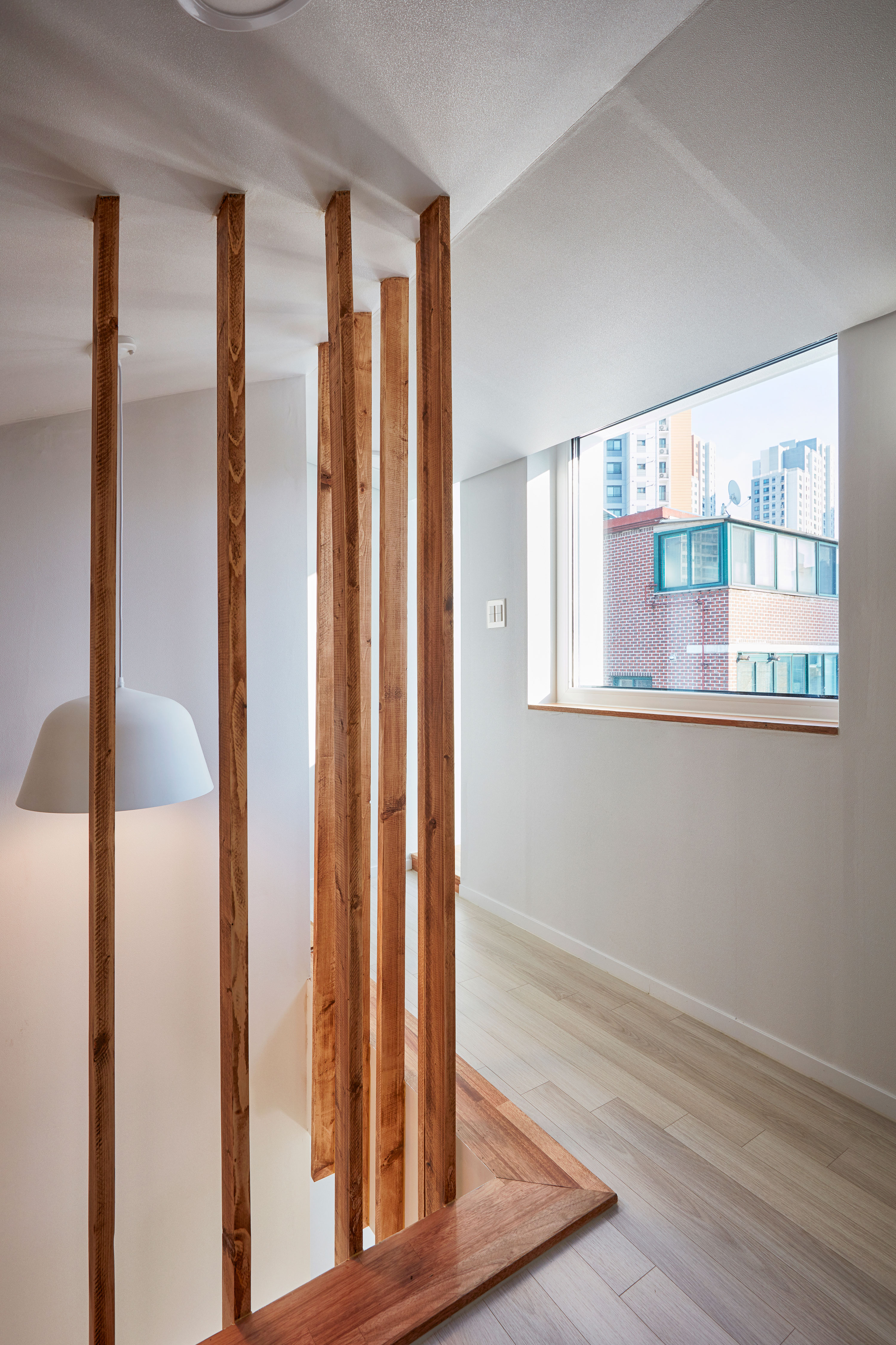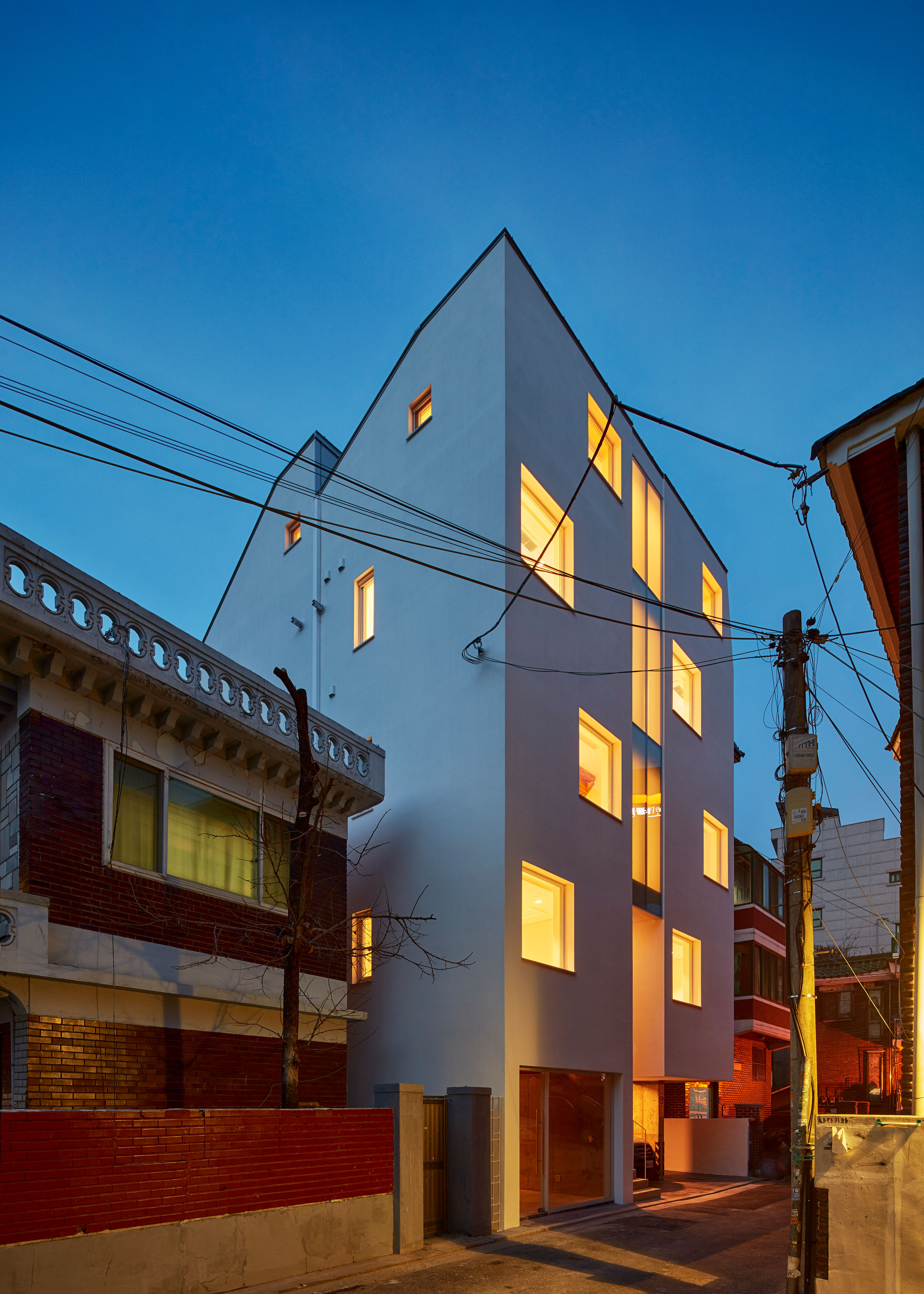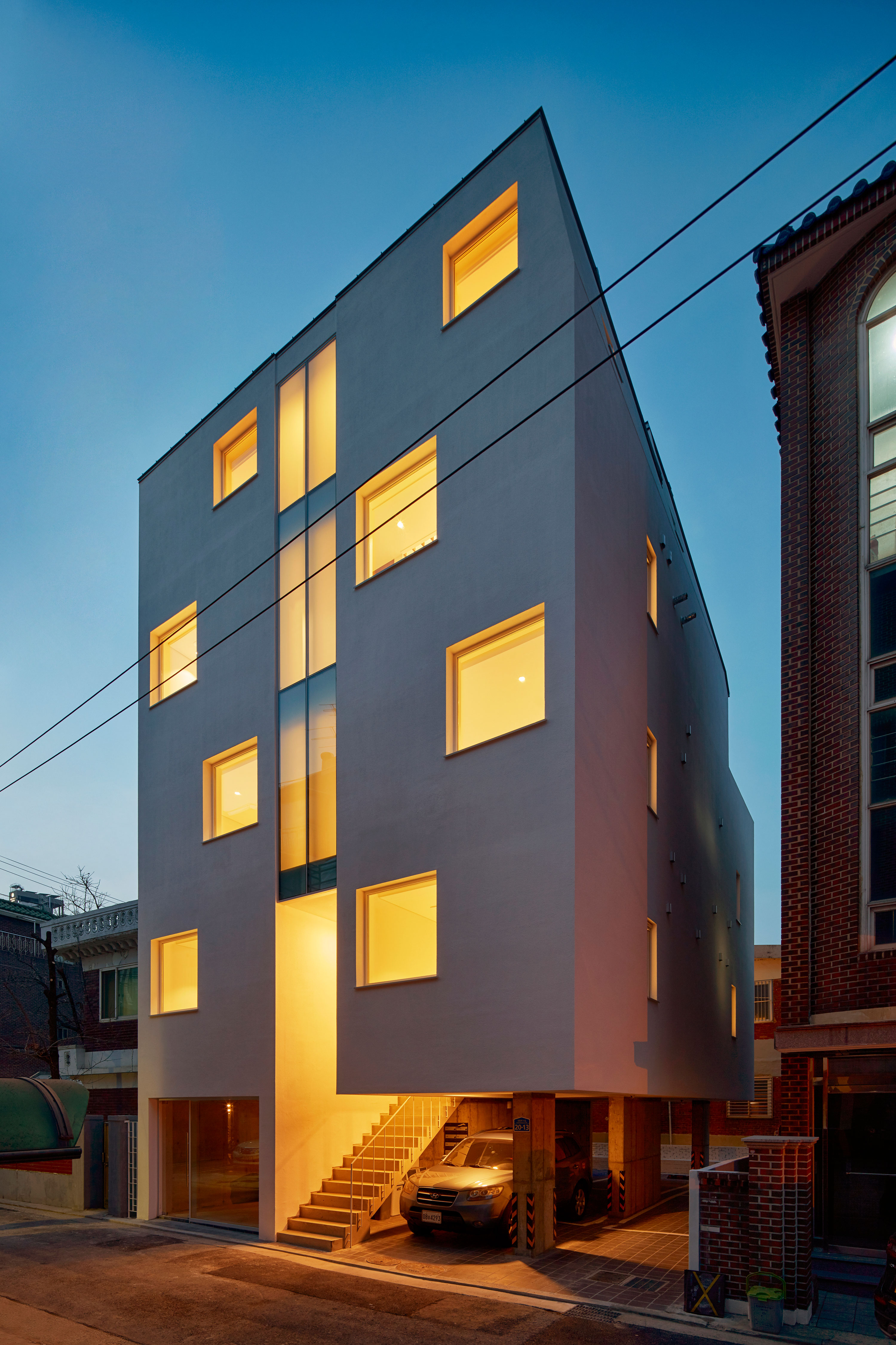 이웃한 집들 사이에 낀 대지 상황은 집을 깊숙이 자리하게 했다. 1층 근린생활시설과 주차장 사이, 이 집의 주된 접근 통로인 계단을 오르면 전면으로 나온 집과 깊숙하게 자리한 집이 병렬로 연속되어, 2층 원룸 형태의 집들과 3층 복층의 집들로 구성된다.