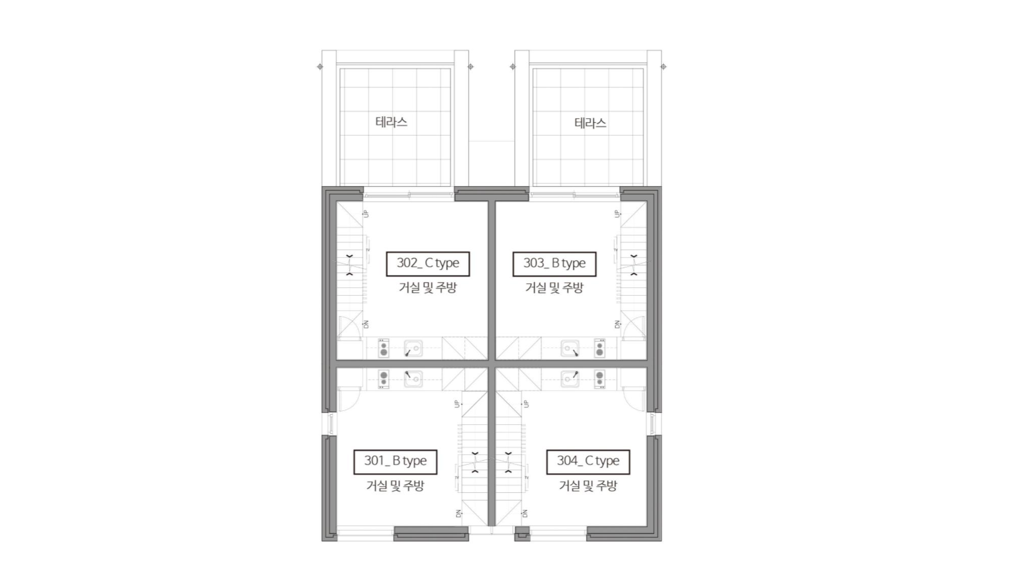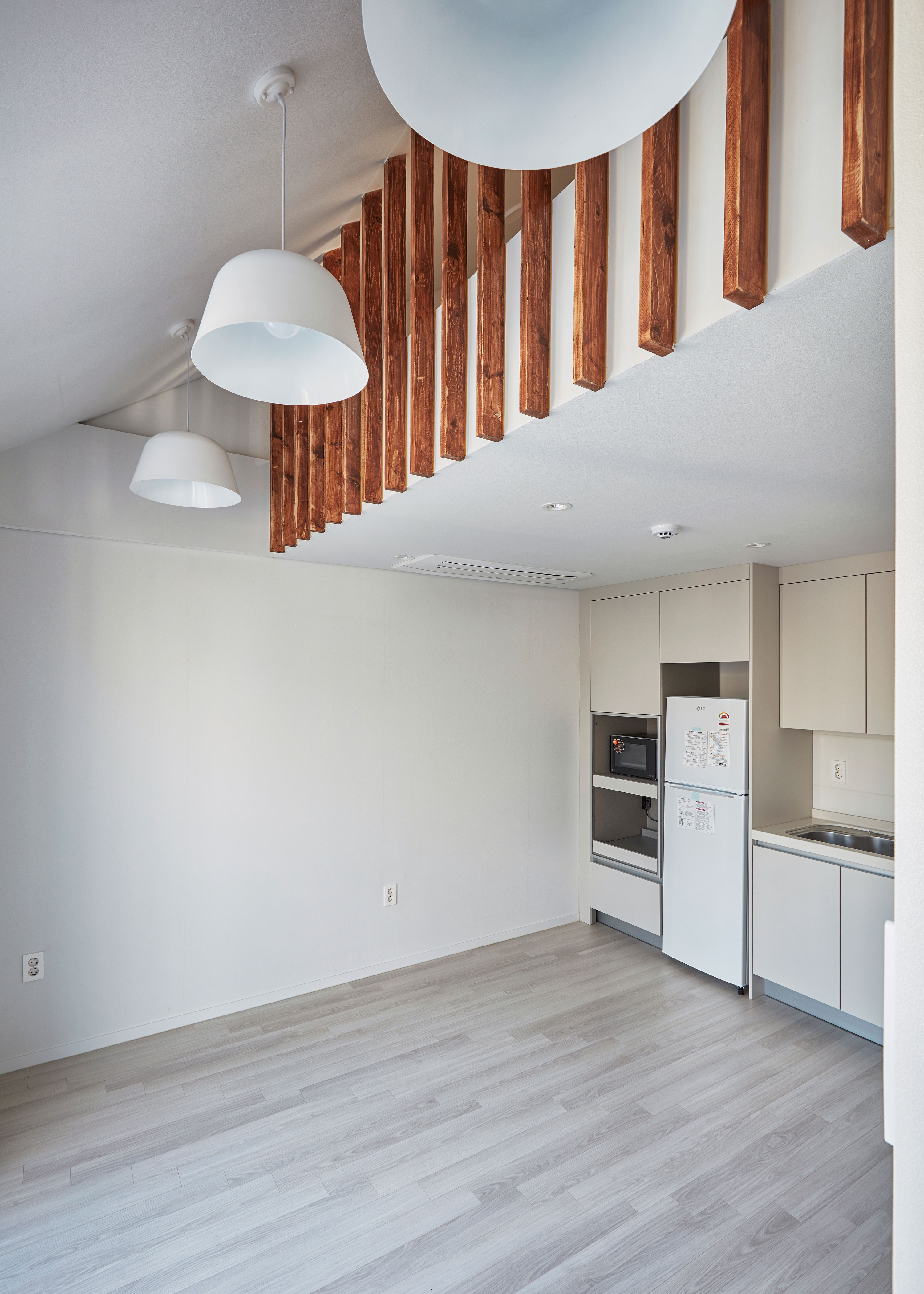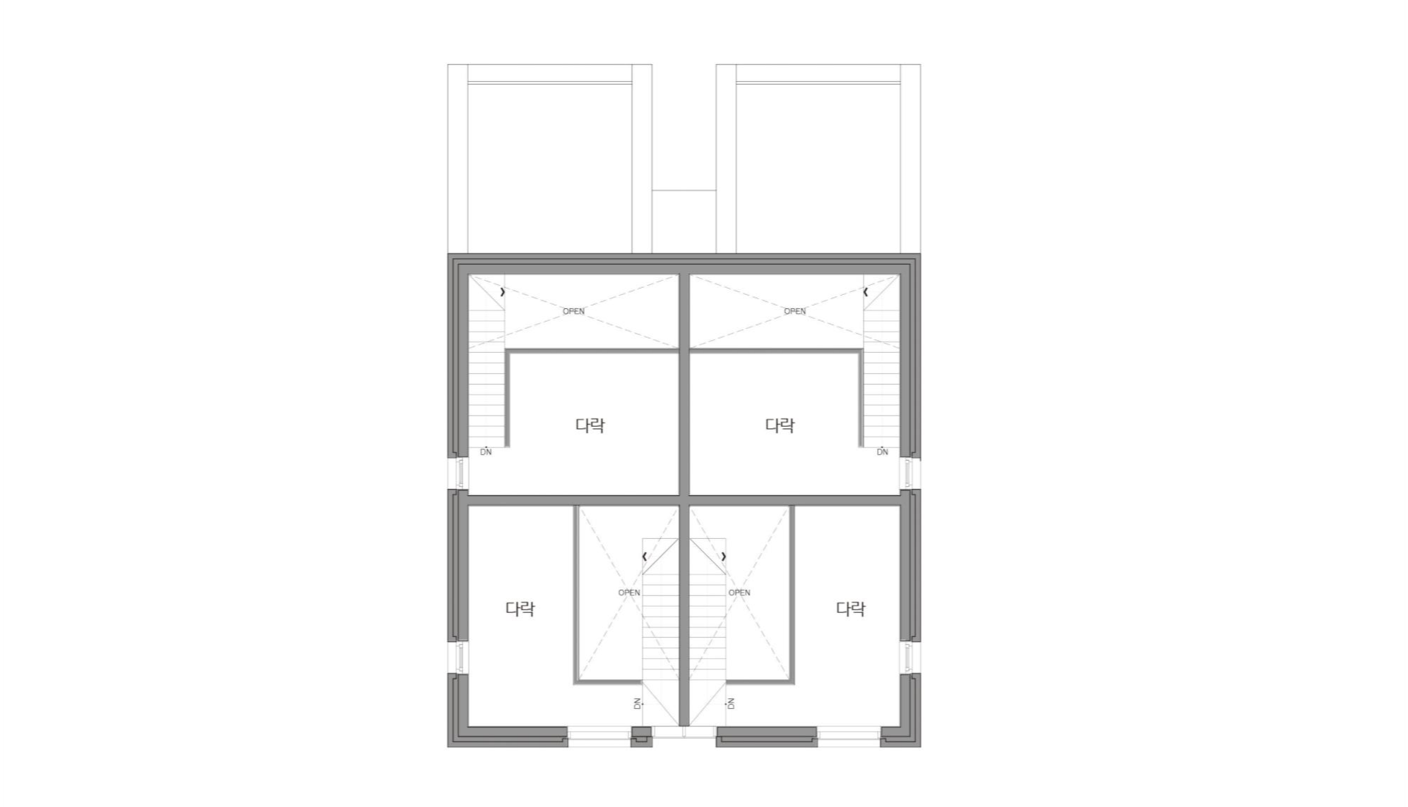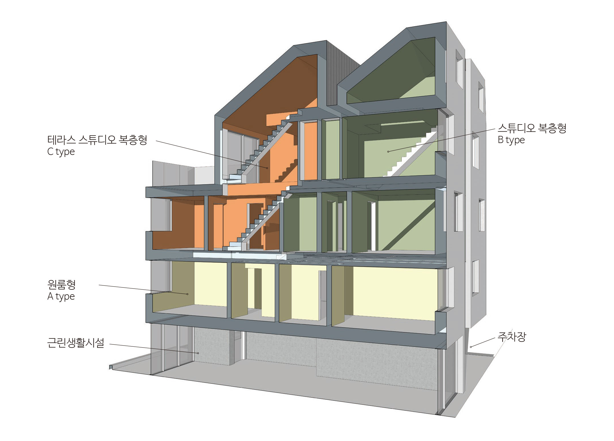 이웃한 집들 사이에 낀 대지 상황은 집을 깊숙이 자리하게 했다. 1층 근린생활시설과 주차장 사이, 이 집의 주된 접근 통로인 계단을 오르면 전면으로 나온 집과 깊숙하게 자리한 집이 병렬로 연속되어, 2층 원룸 형태의 집들과 3층 복층의 집들로 구성된다.