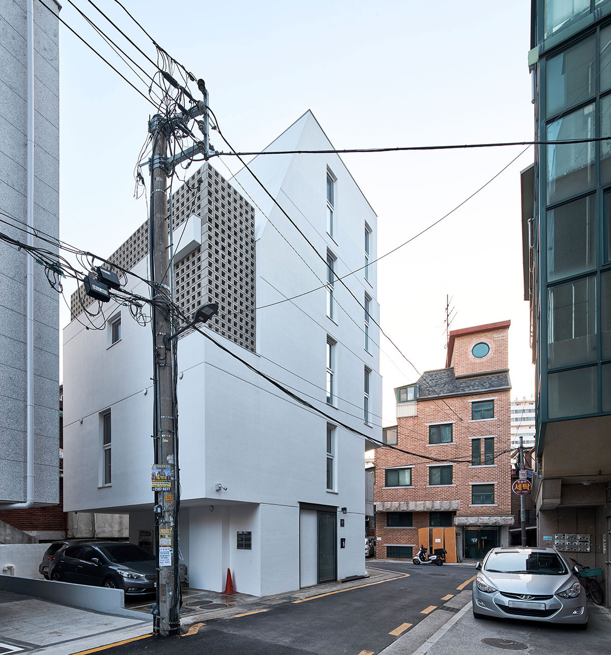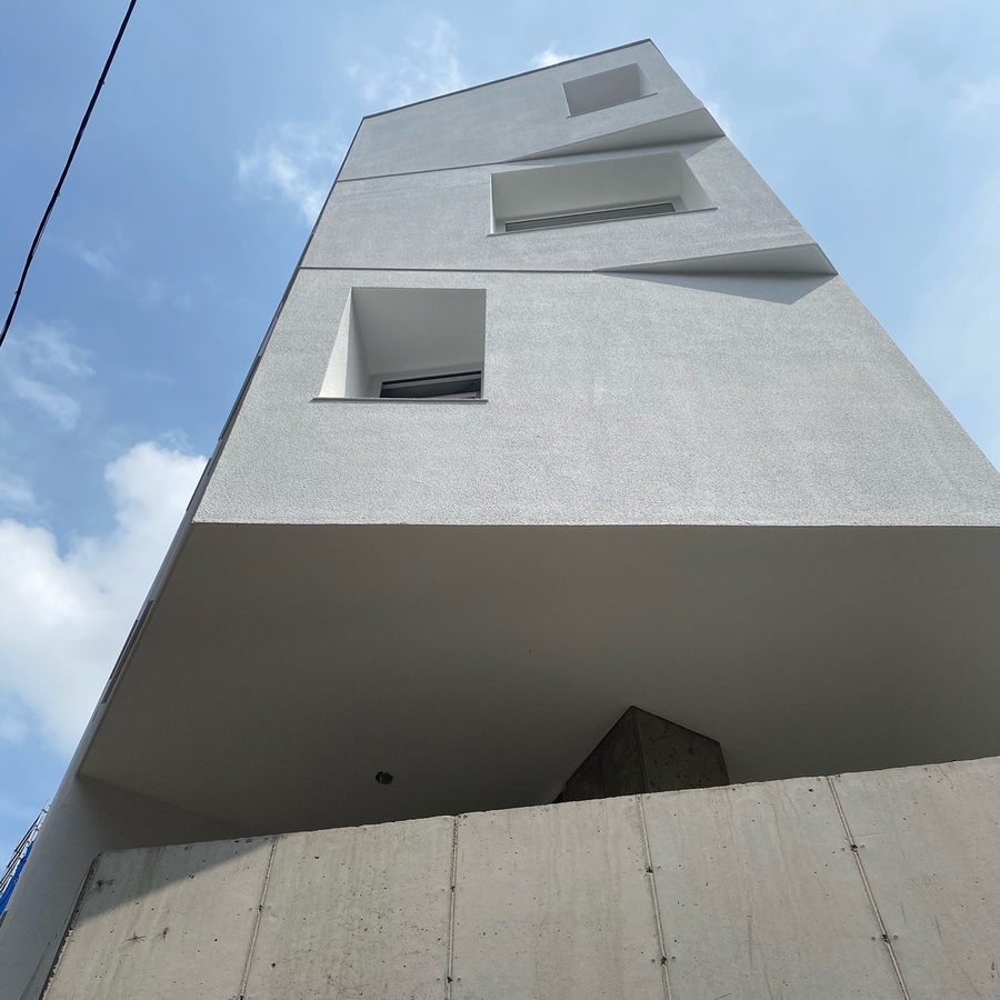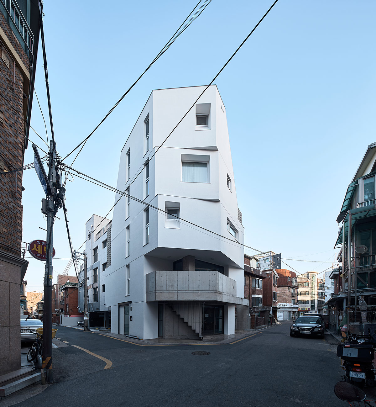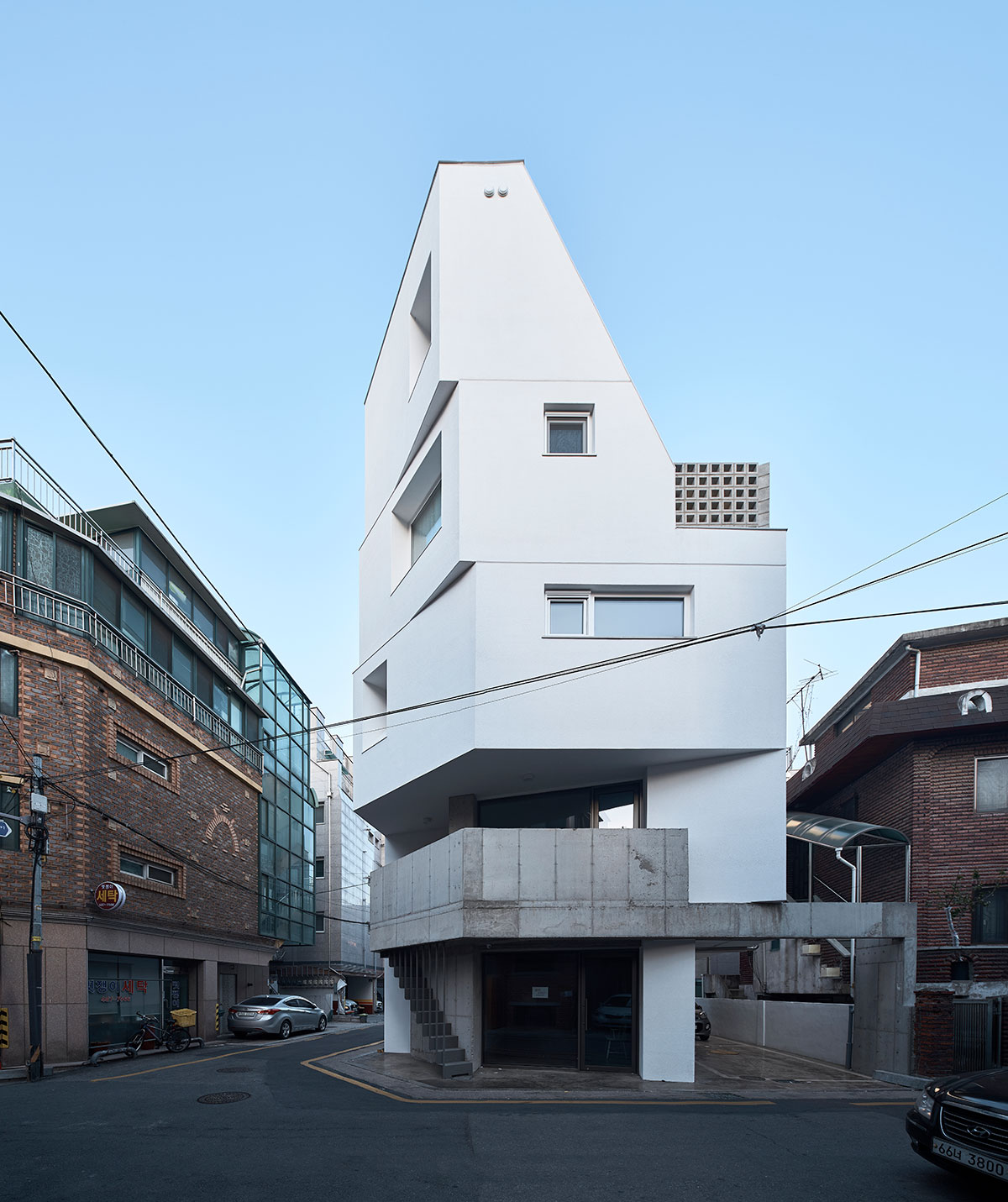 그렇게 둔각의 가각 면을 층별로 어긋나게 쌓은 성내동 상가주택.