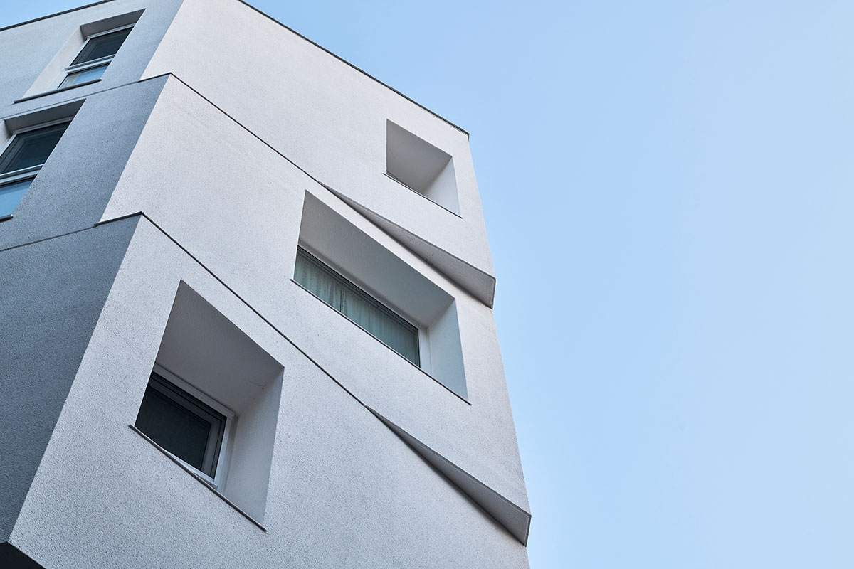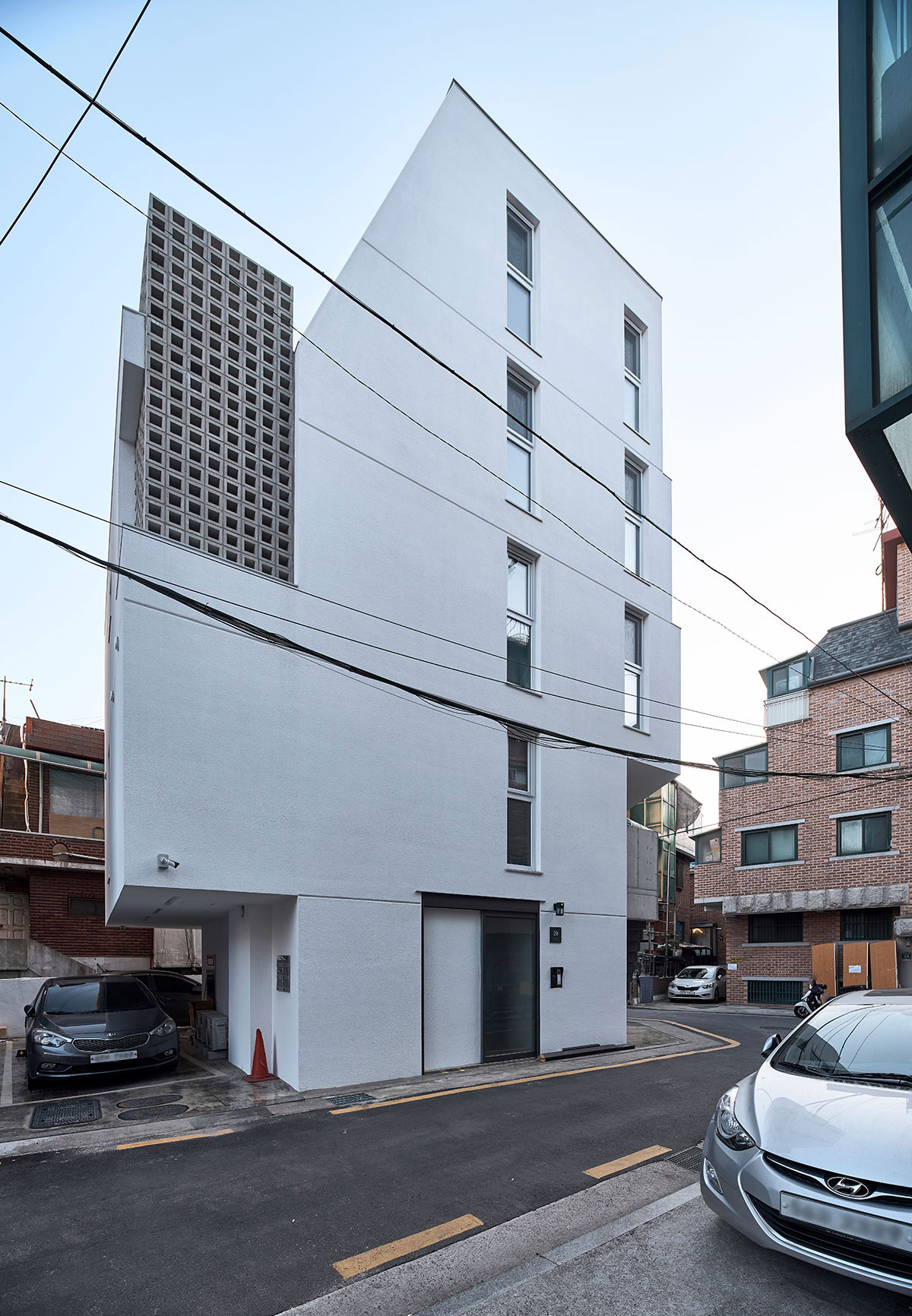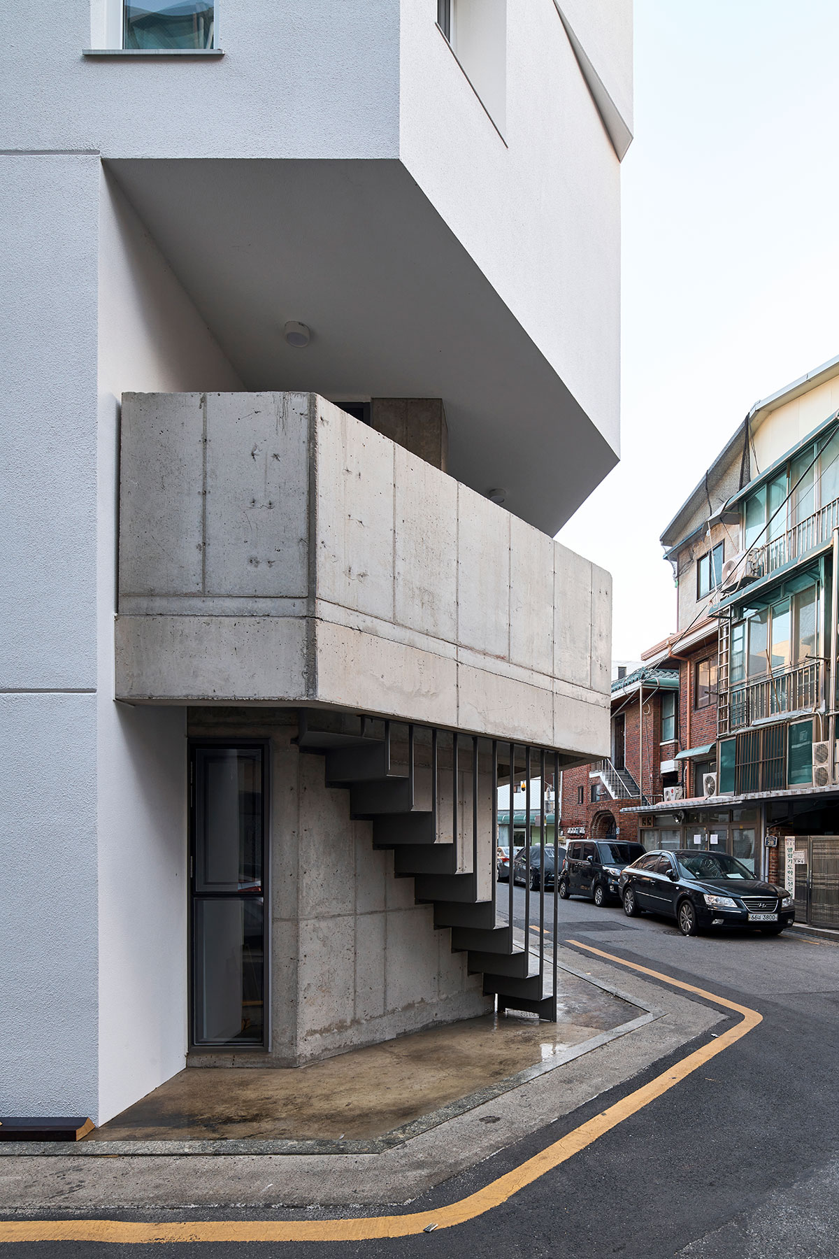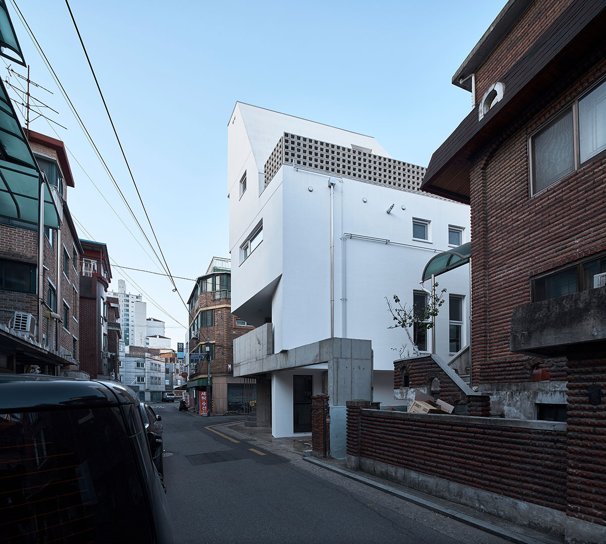 그렇게 둔각의 가각 면을 층별로 어긋나게 쌓은 성내동 상가주택.