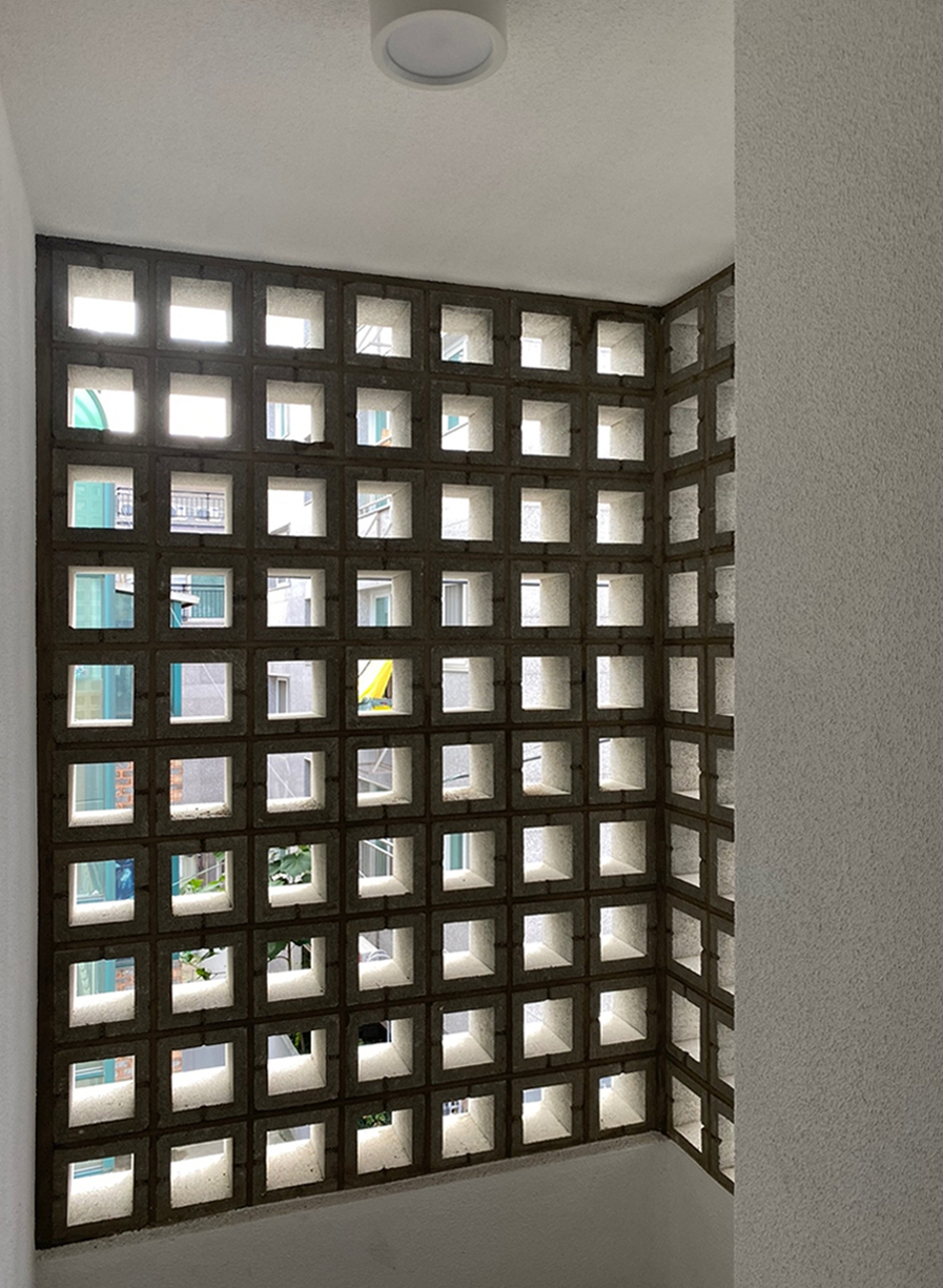 올림픽공원 근방 오래된 주거지에 위치한 38평 남짓의 모서리 땅. 오래된 토지라 신축을 하게 되면 모서리는 사선으로 잘려 나가고, 1.3평은 길로 내주어야 했다.