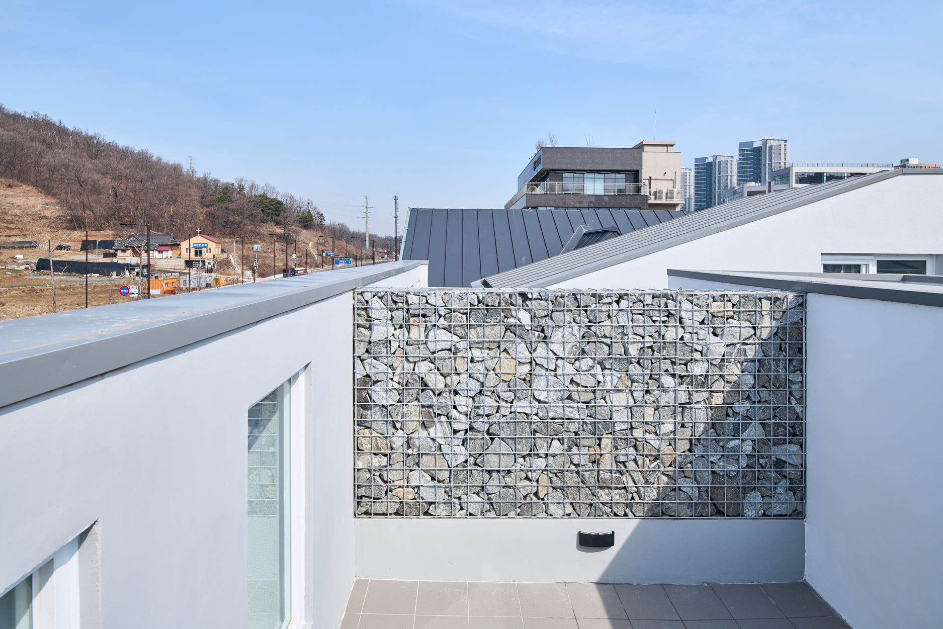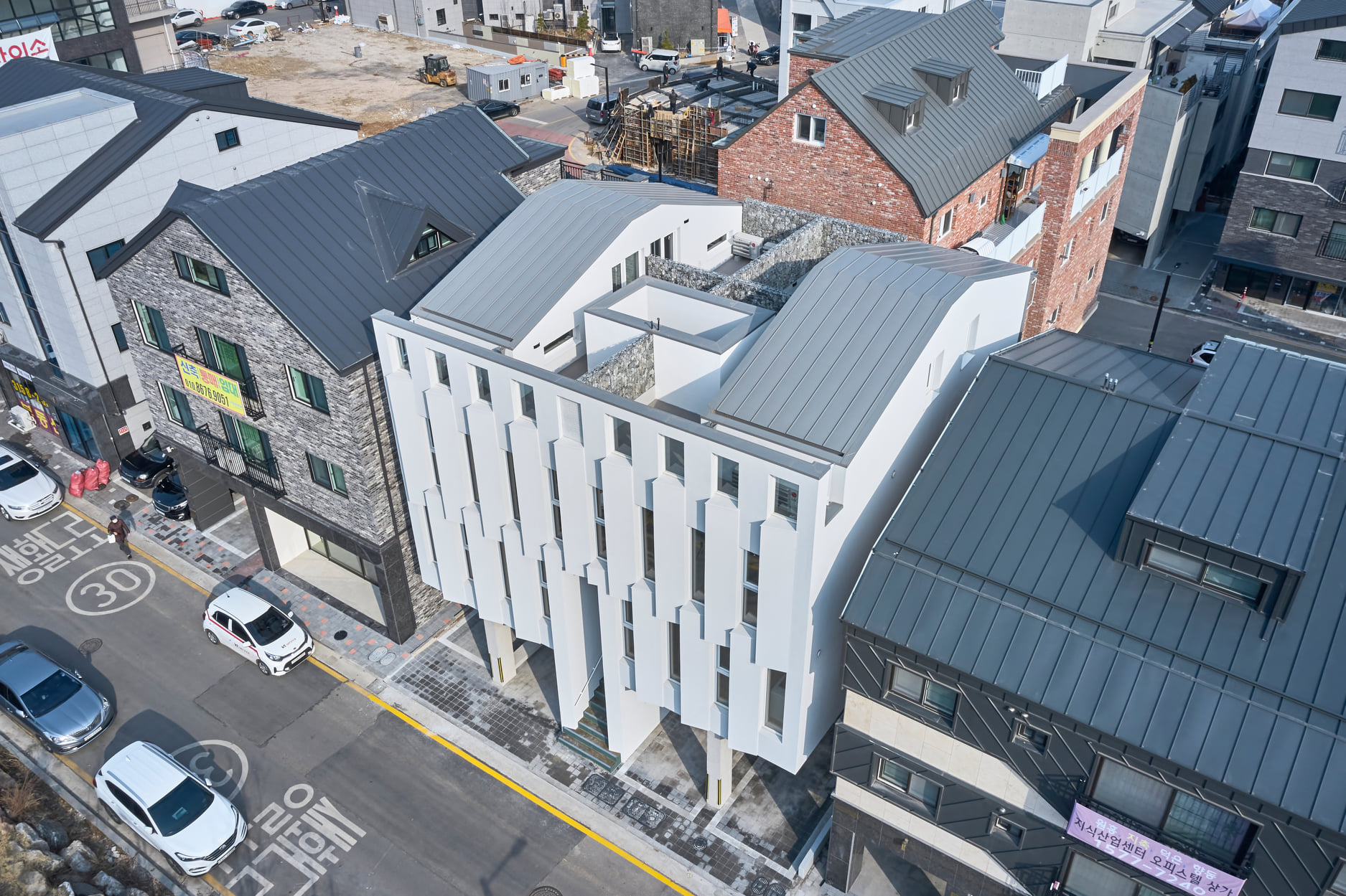 왕복 6차선의 메인도로 보다 낮은 대지의 특성상 1층 상가는 드러나지 않는다. 거기에 더해 주택의 출입구와 주차장을 전면에 내준 상황이라 상가의 존재, 입지는 상가 자체가 아닌 집 전체로 강하게 어필하는 것이 더 나은 방법이라 생각되었다. 자동차의 속도에서 인지되는 강한 인상을 단순하게 반복되는 커튼 같은 입면이 만들어주기를 기대했다.