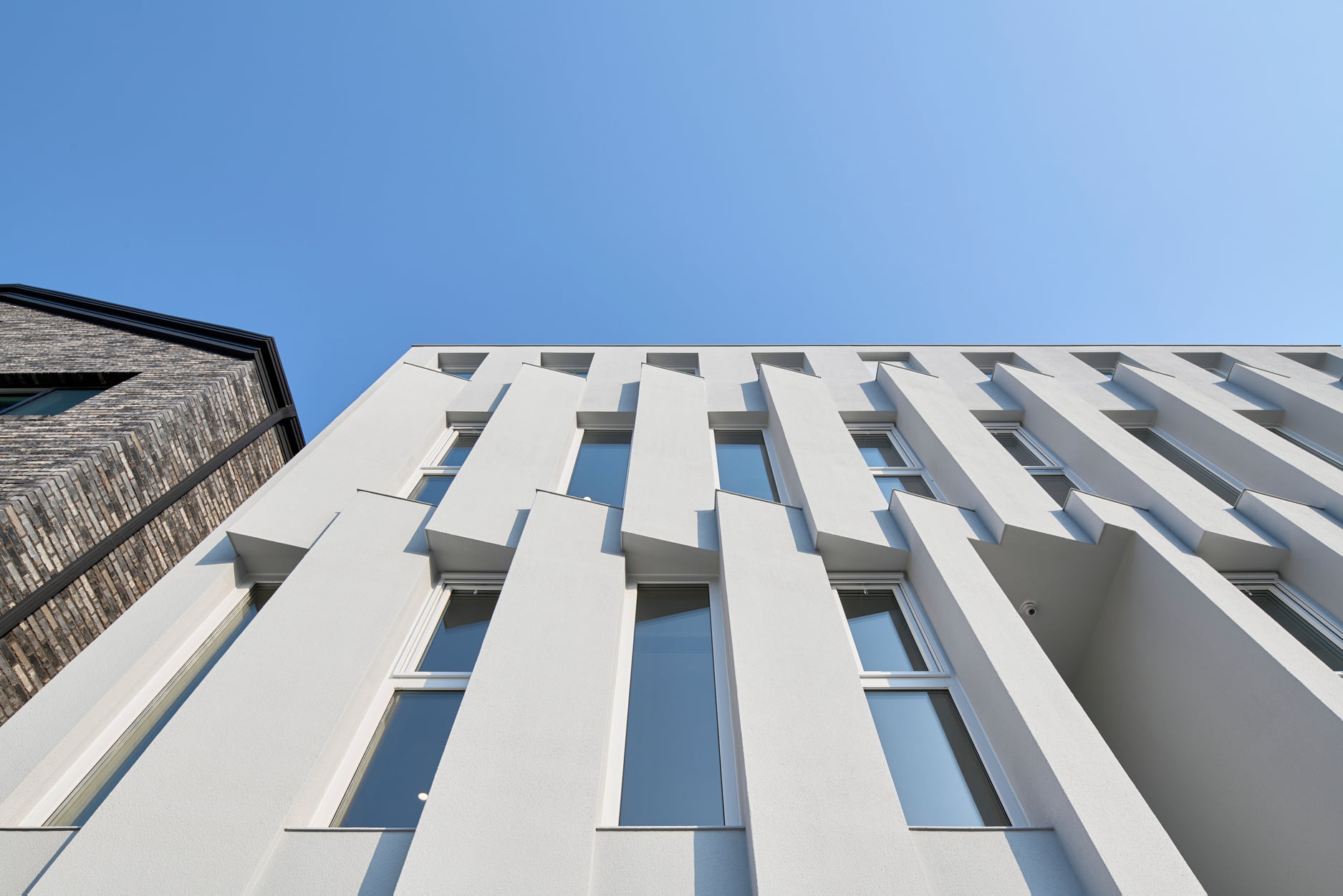 따라서 좁고 긴 창으로 한 사람, 한사람 그 생활이 조명되고 서향의 눈부심을 커튼처럼 굽어진 면으로 막아서고 그 창 앞으로 한발 더 나아가도록 하는 것이 입면 구성의 가장 큰 목표였다.