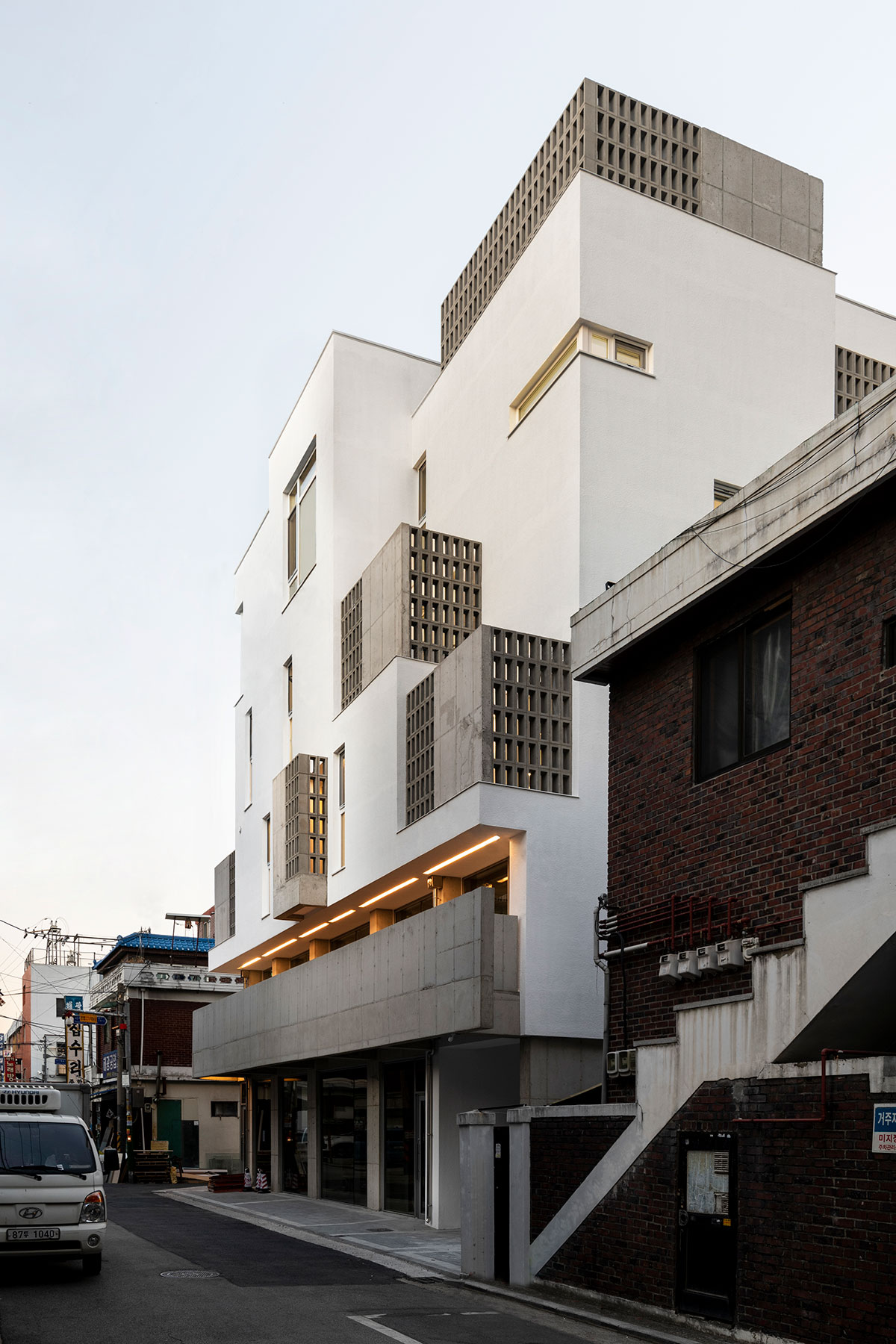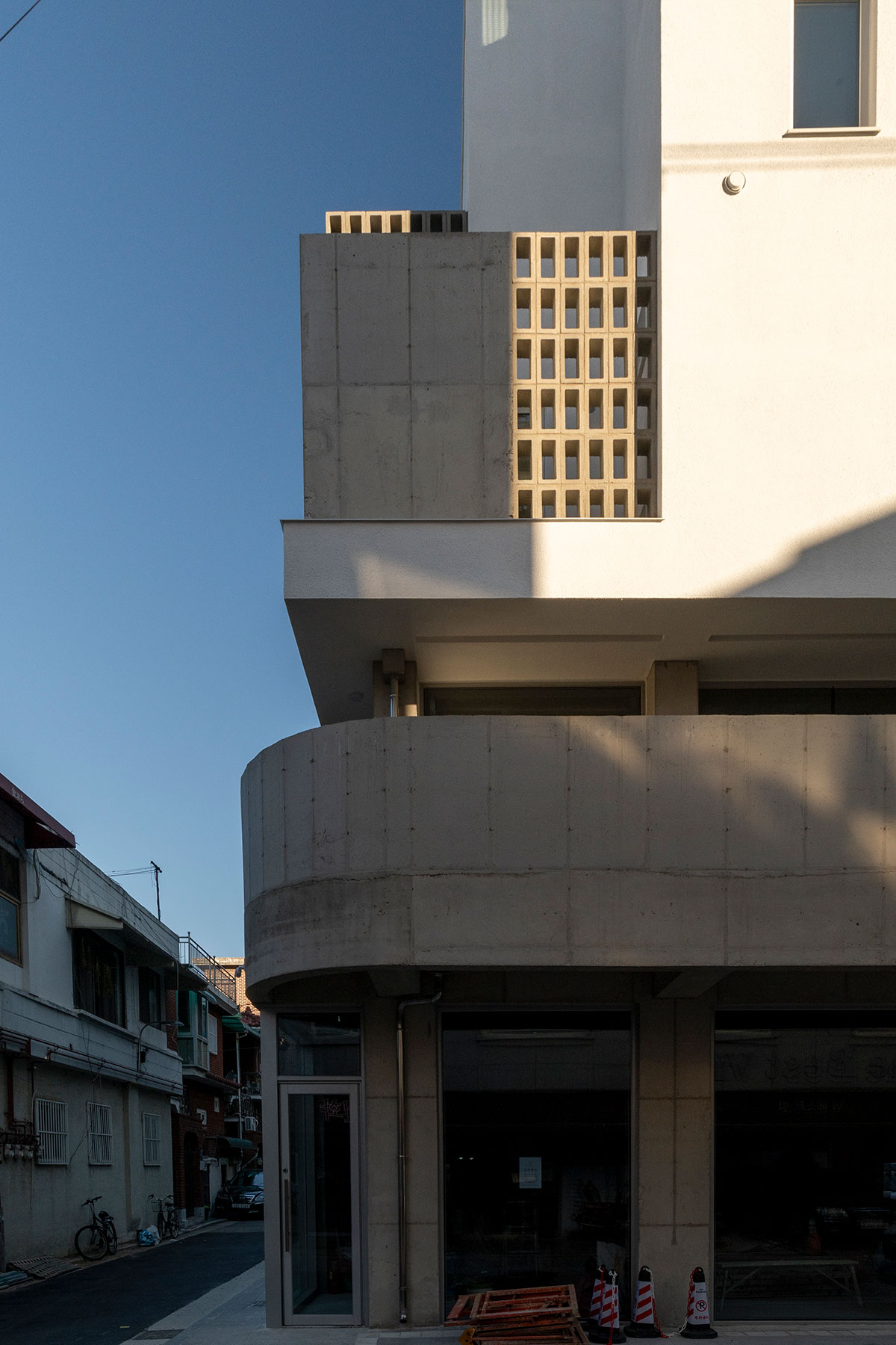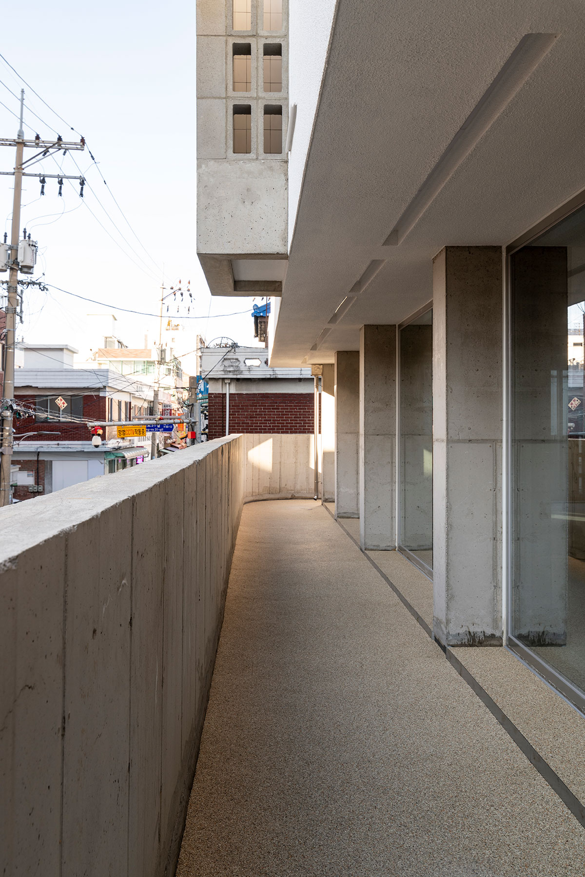 2층 근린생활시설의 베란다는 상업공간으로서의 쓰임을 확장하는 것이 주목표이나 1층 근생에 처마의 역할도 하여 공간의 깊이를 더하게 된다.