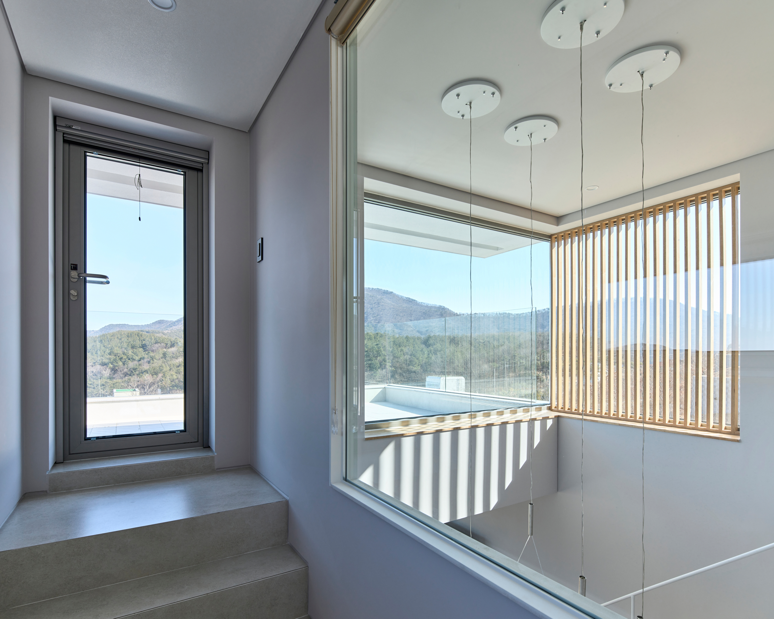 낮고 작은 집이라 가족의 중심 공간이 될 다이닝과 거실 공간 만큼은 체적을 키웠다. 2층까지 비워진 공간에 쪼개진 빛을 들여 벽에 새기니 순백의 공간에 활기가 돈다. 거실의 북동쪽 면은 전체가 창이다. 국수봉을 눈앞까지 끌고 오지만 향 덕분에 직사광선의 영향은 적어 편안한 빛을 들인다.