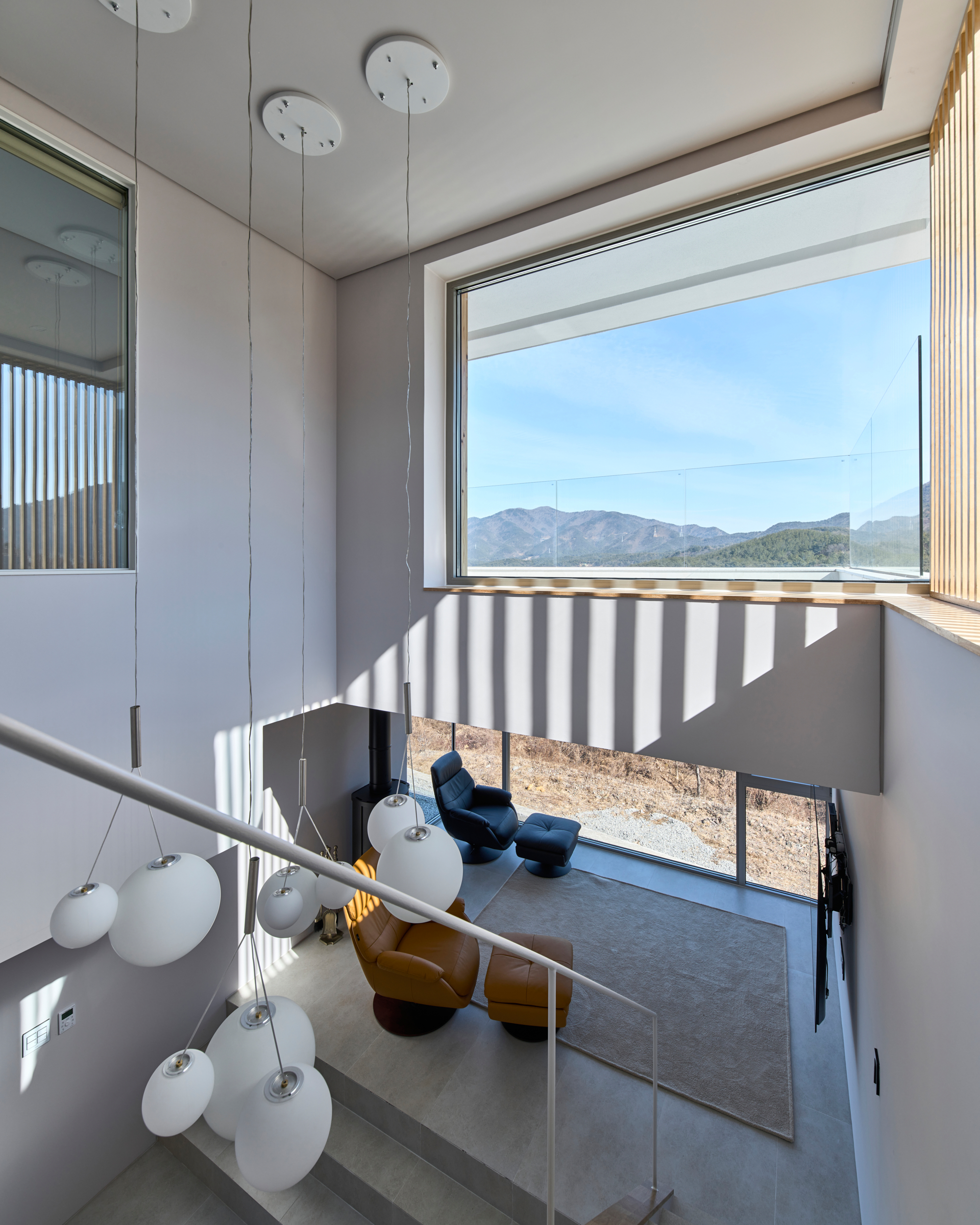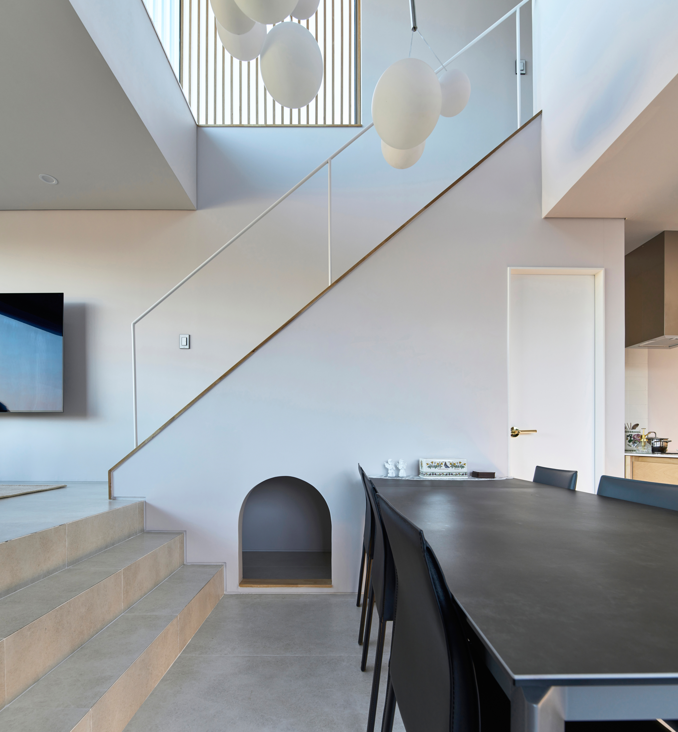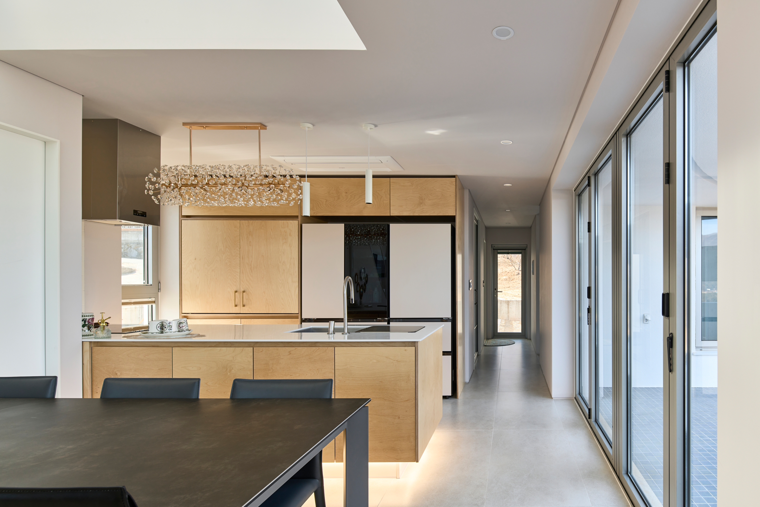 낮고 작은 집이라 가족의 중심 공간이 될 다이닝과 거실 공간 만큼은 체적을 키웠다. 2층까지 비워진 공간에 쪼개진 빛을 들여 벽에 새기니 순백의 공간에 활기가 돈다. 거실의 북동쪽 면은 전체가 창이다. 국수봉을 눈앞까지 끌고 오지만 향 덕분에 직사광선의 영향은 적어 편안한 빛을 들인다.