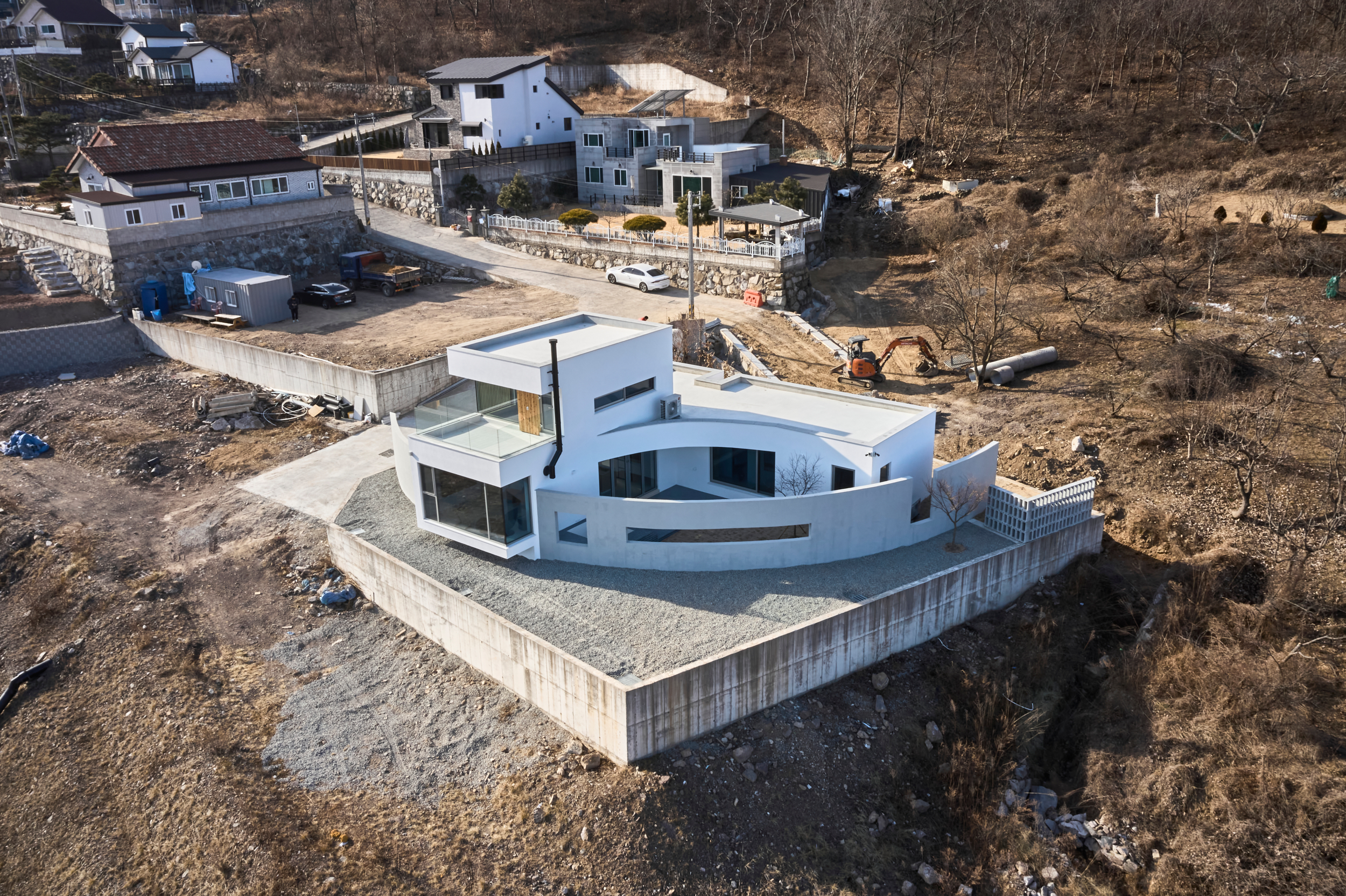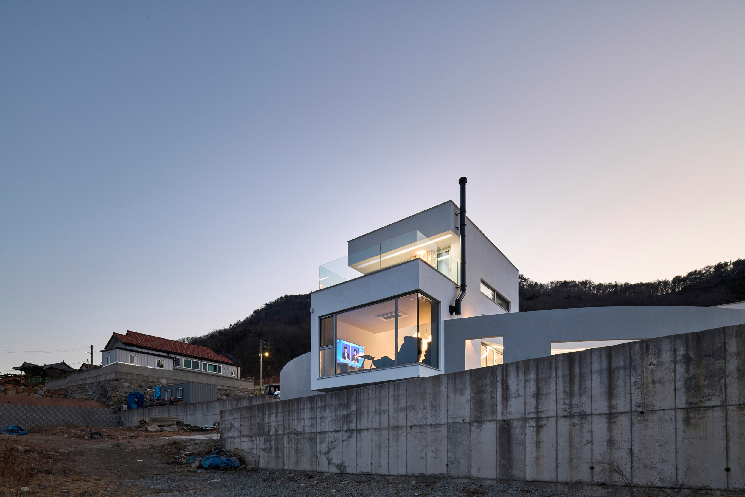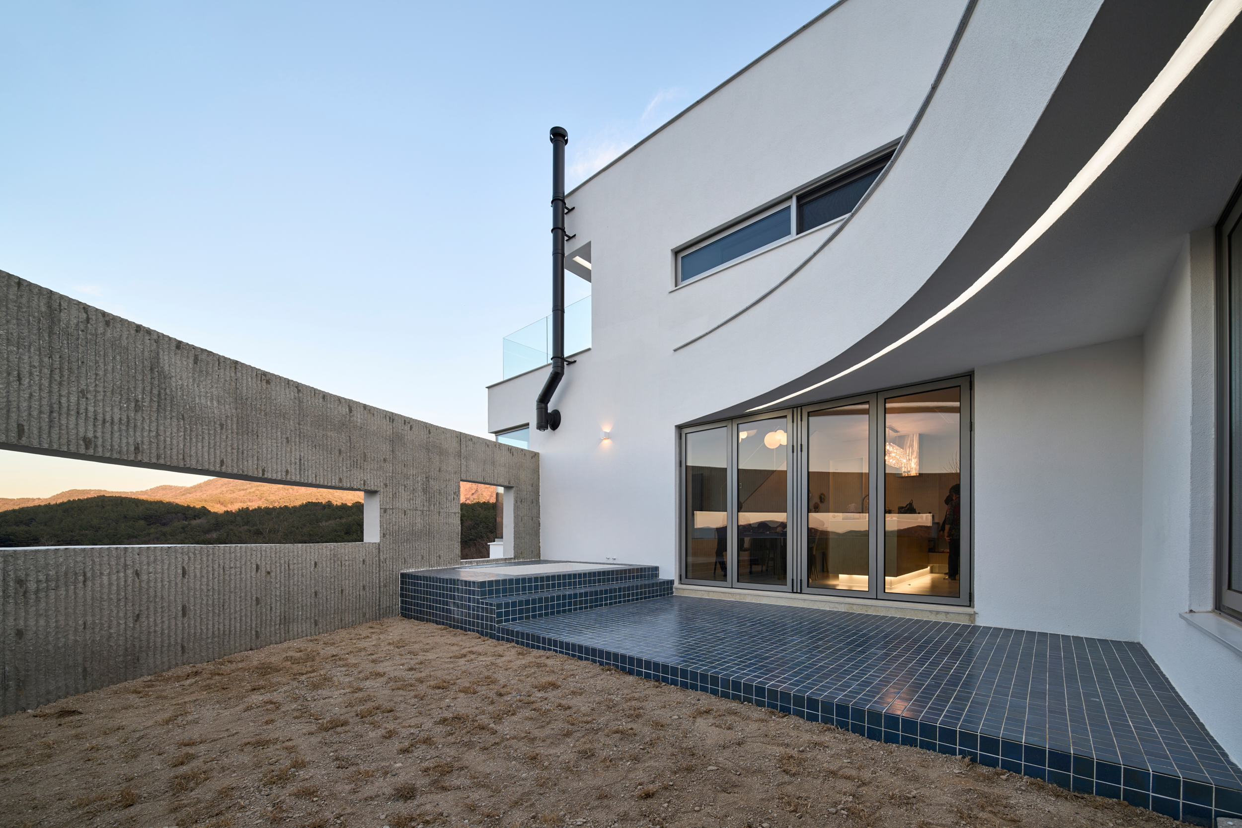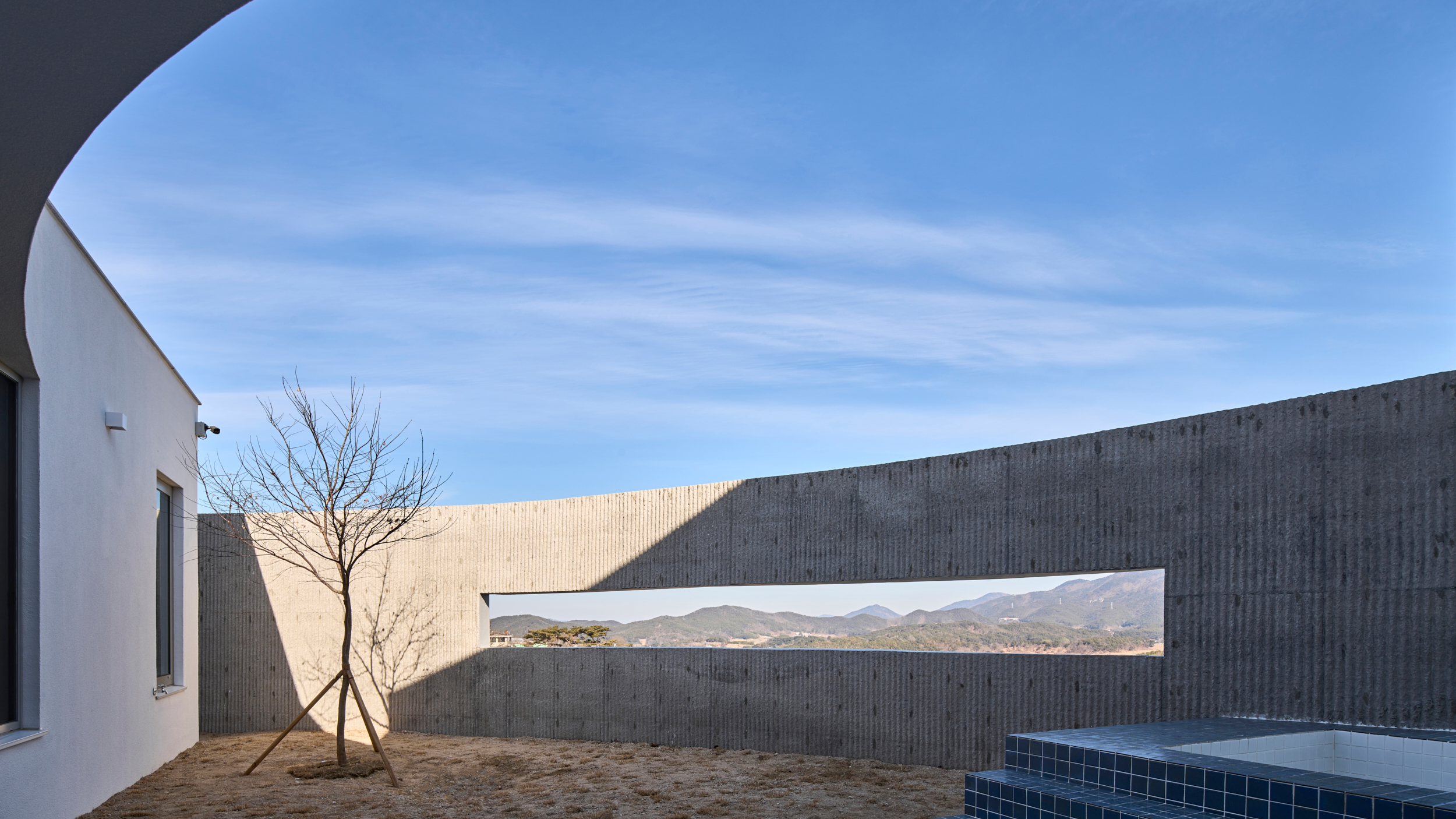 그래서 L자 형태의 작은 집에 반원의 가벽으로 마당을 한정했다. 반원의 콘크리트 가벽은 기존 콘크리트 축대와 집을 연결시키는 장치이자 가족만의 내밀한 마당을 제공한다.