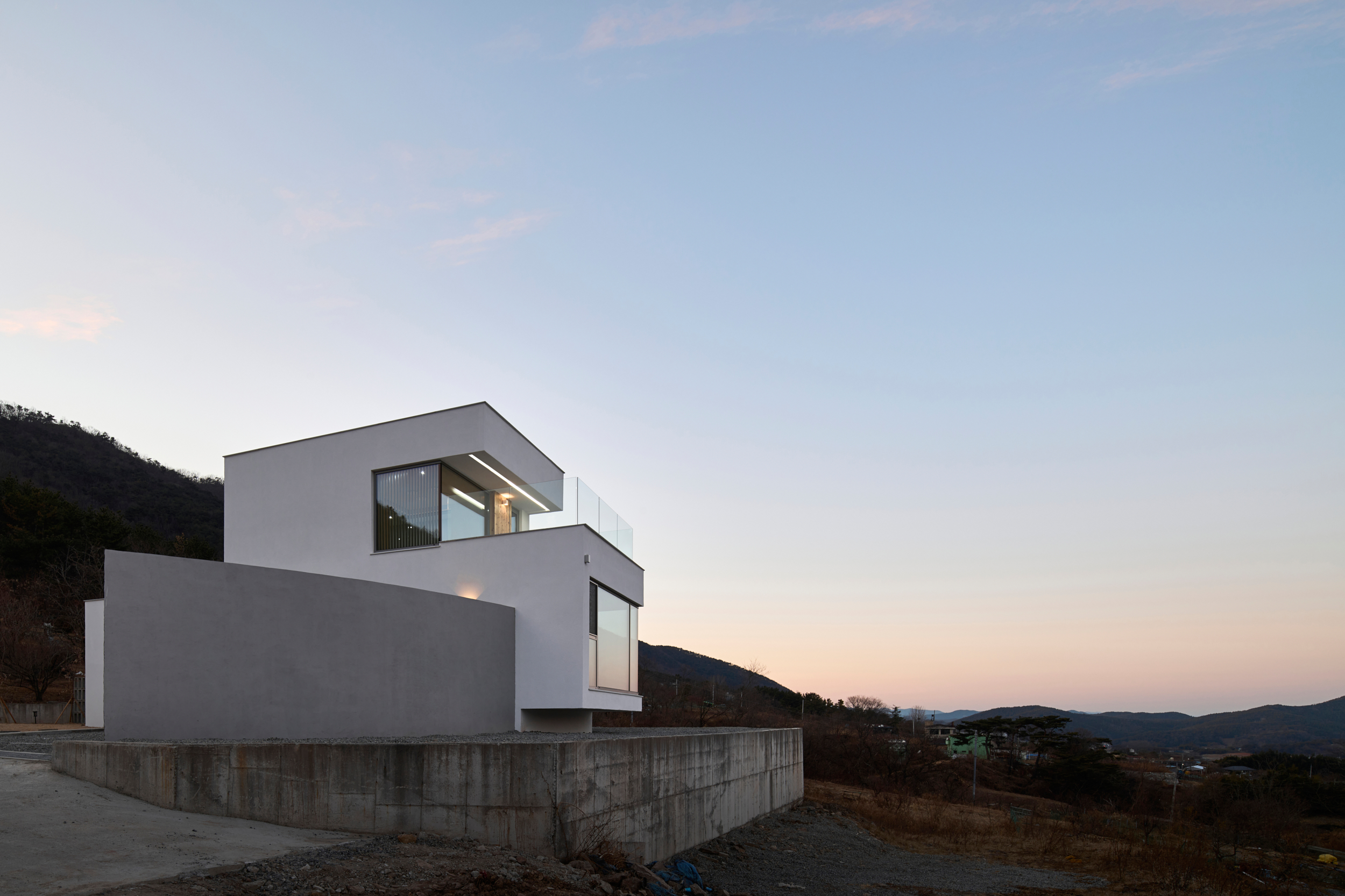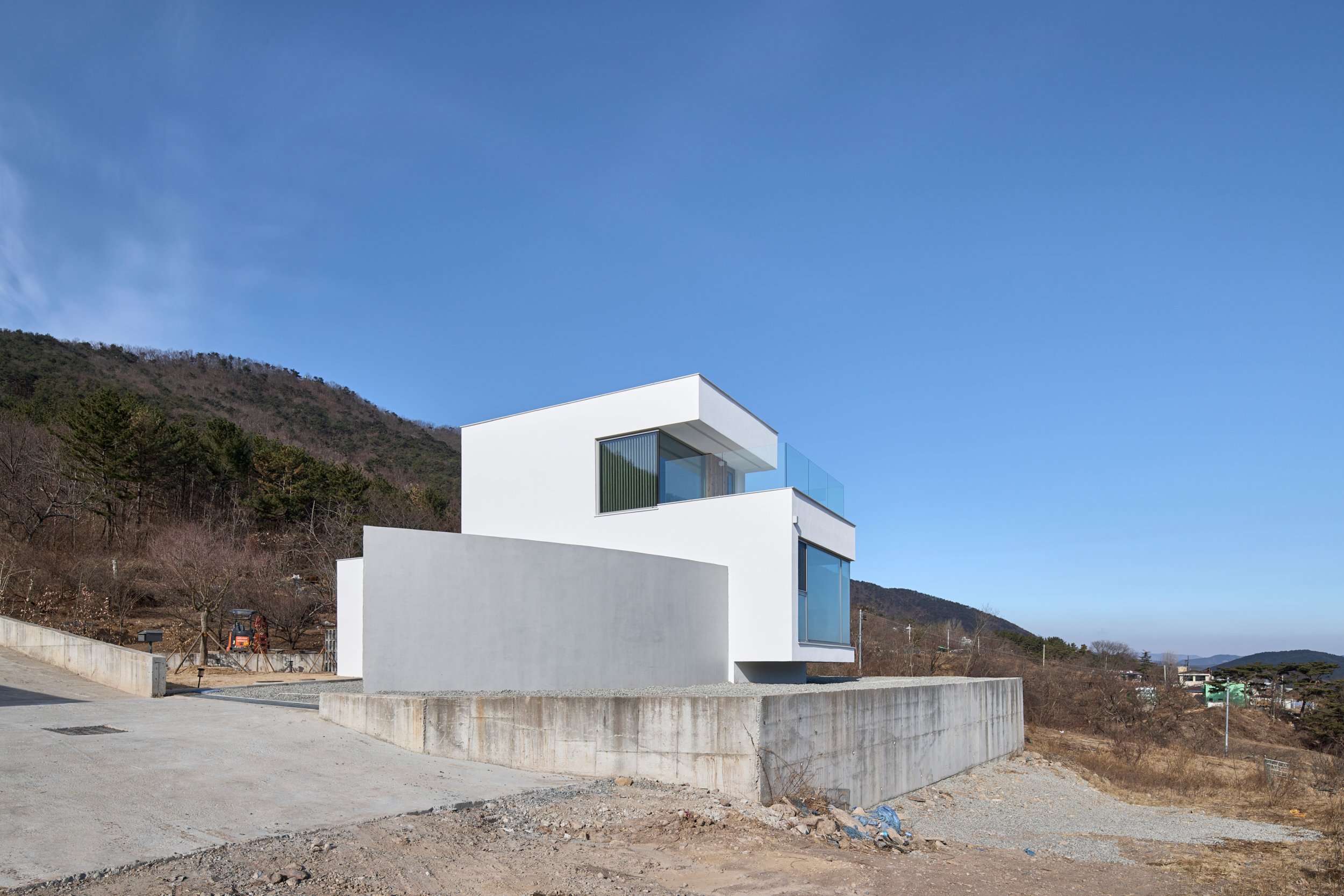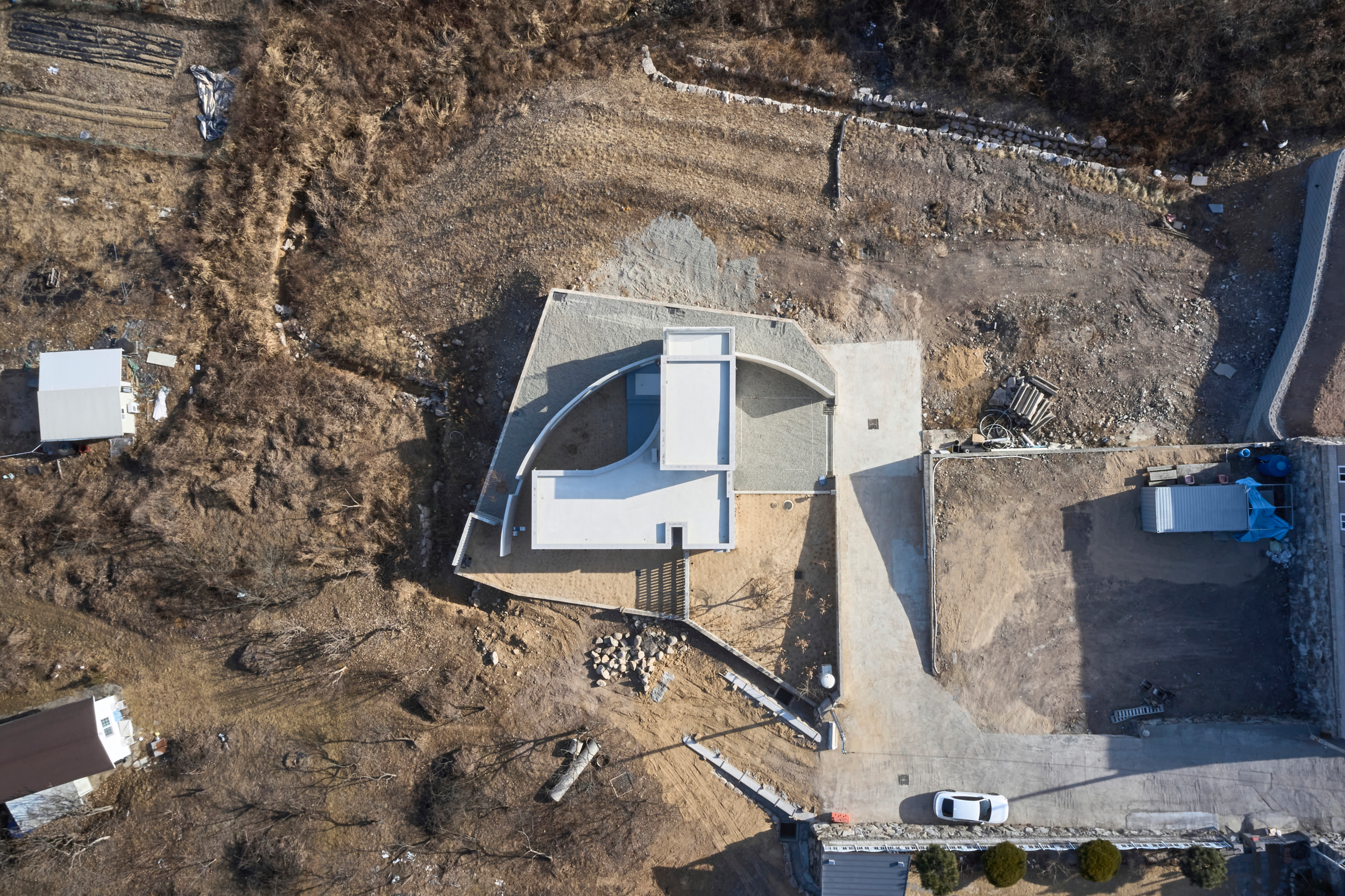 경사진 땅은 고점을 기준으로 평탄화된 터라 낮은 쪽에선 3M가 넘는 콘크리트 축대가 형성되어 있다. 땅을 들어올리기 위해 쓰여 진 콘크리트 옹벽을 보면 거부감부터 들고는 했는데, 이 옹벽을 첫 대면하고는 여기서부터 시작할 수 있겠다는 묘한 기대감이 들었다. 들어 올려졌다기 보다는 자연스레 솟아오른 것 같은 이 땅의 모습에서, 집이 자라난 것처럼 보이게 하고 싶었다. 축대와 집이 원래 한 몸인 양 읽혔으면 좋겠다는 생각이 들었다. 집이 태생적(주말주택)으로 클 필요가 없는 조건에서 위와 같은 인상을 만들기 위해서는 특별한 전략이 필요했다.