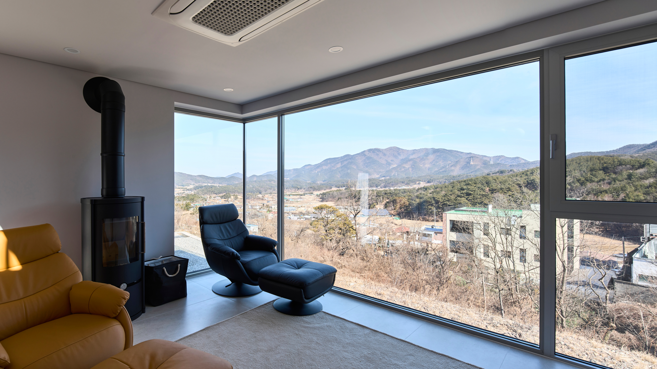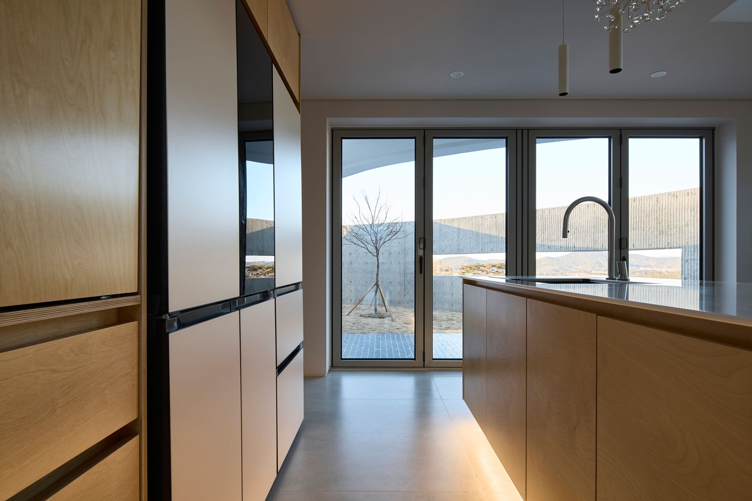 건축주 가족에겐 이 곳이 은신처가 될 것이라 했다. 더해서 400km를 달려 올만큼 특별한 것이 이 집에 존재하길 기대했다. 그 특별함은 집 안이 아닌 집 밖에, 건축주의 기억 속에 이미 존재하고 있다고 보았다. 나고 자라며 늘 눈앞에 존재하던 국수봉 자락, 펼쳐진 능선이 그랬다. 그 풍경을 그저 바라보고 액자처럼 창으로 고정시키는 것에서 더 나아가 생활의 모습을 겹치고 정돈된 자연을 더해서 삭혀내고 싶었다. 발효된 풍경이 이 가족에게 특별한 기억으로 남길 기대했다.