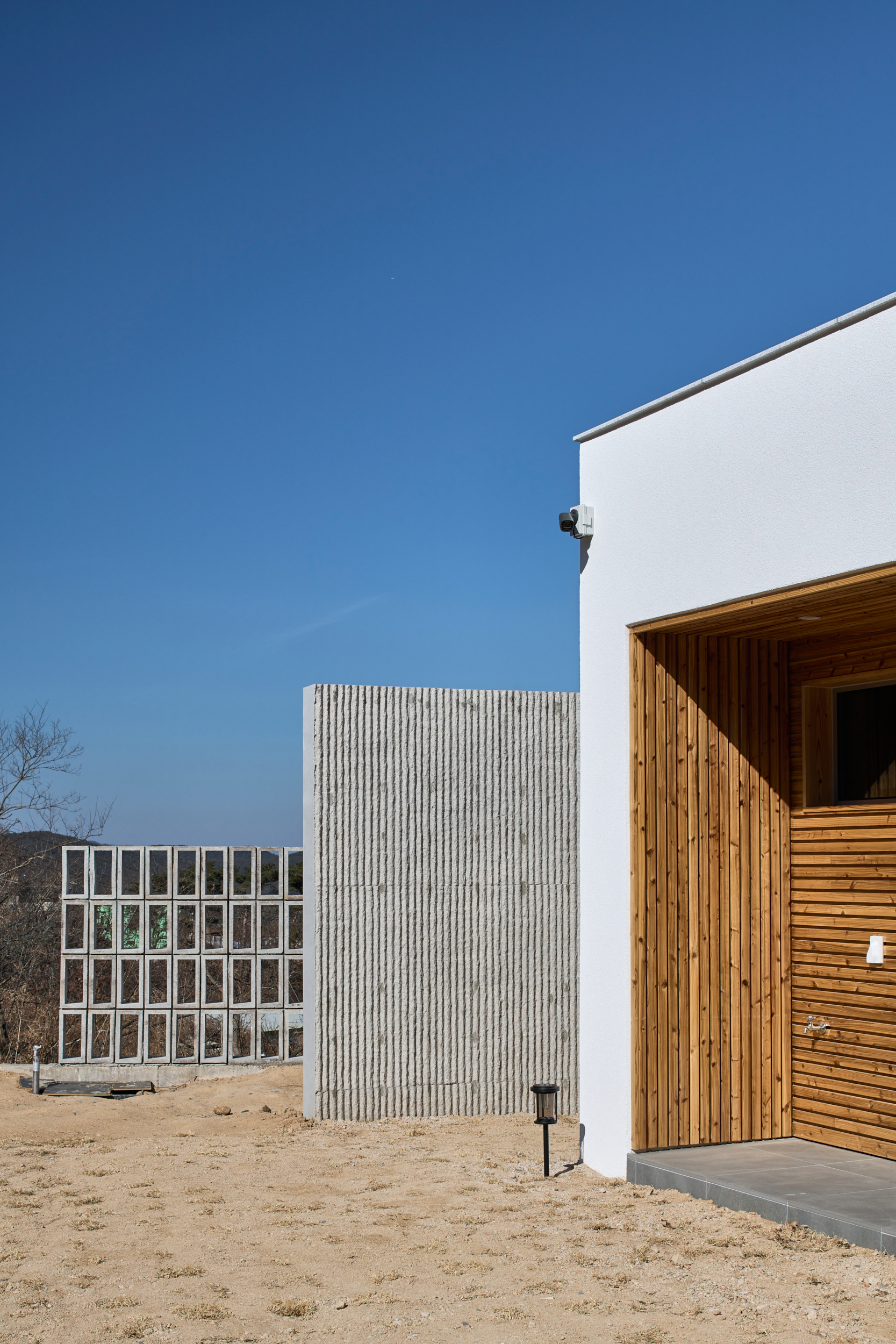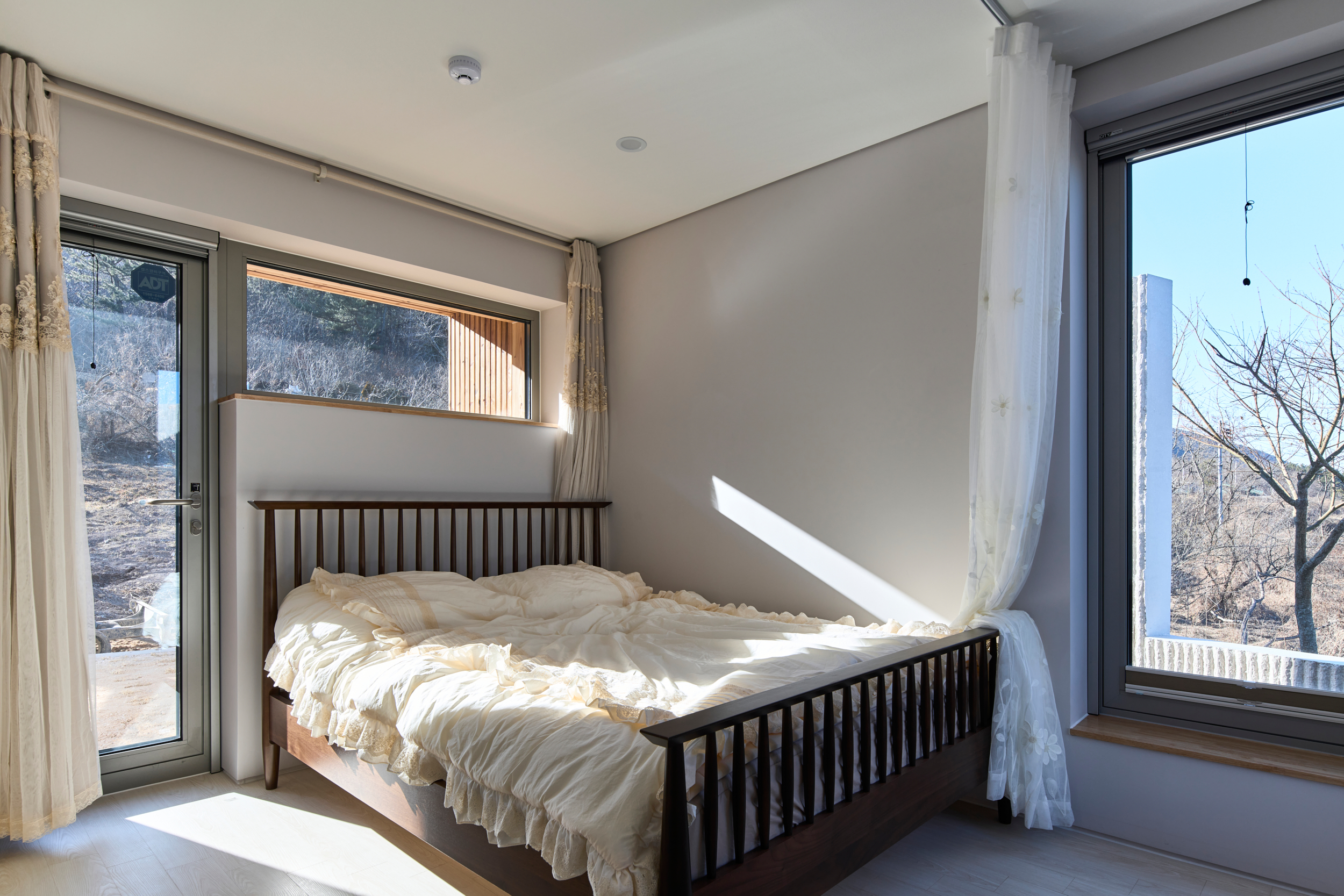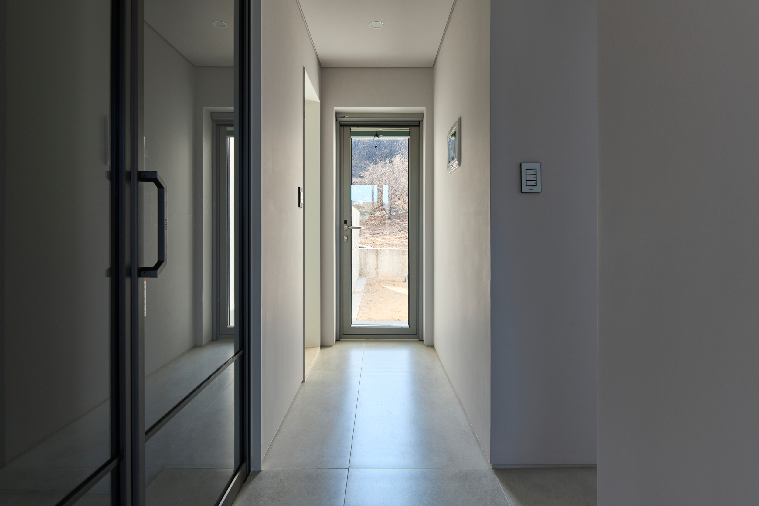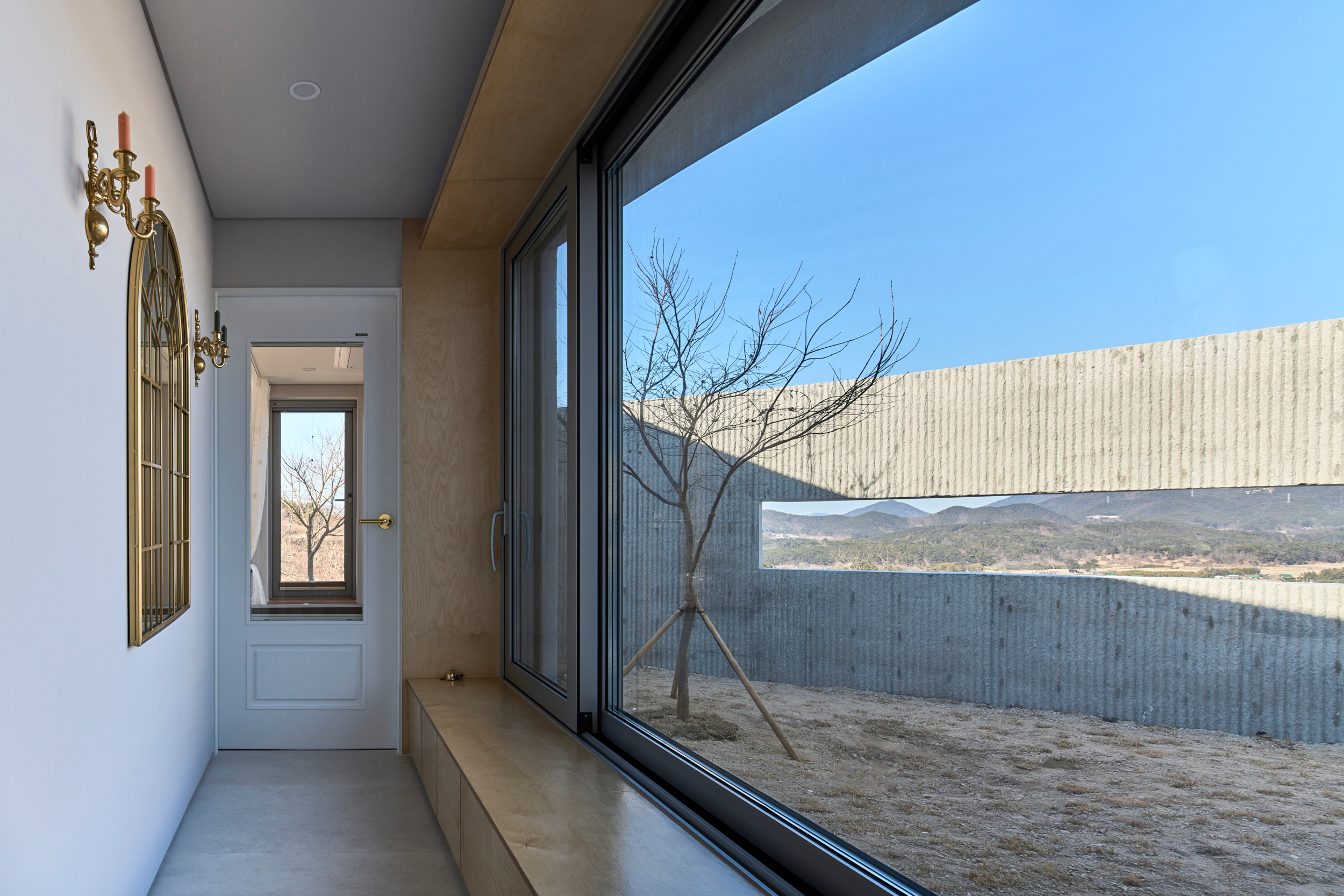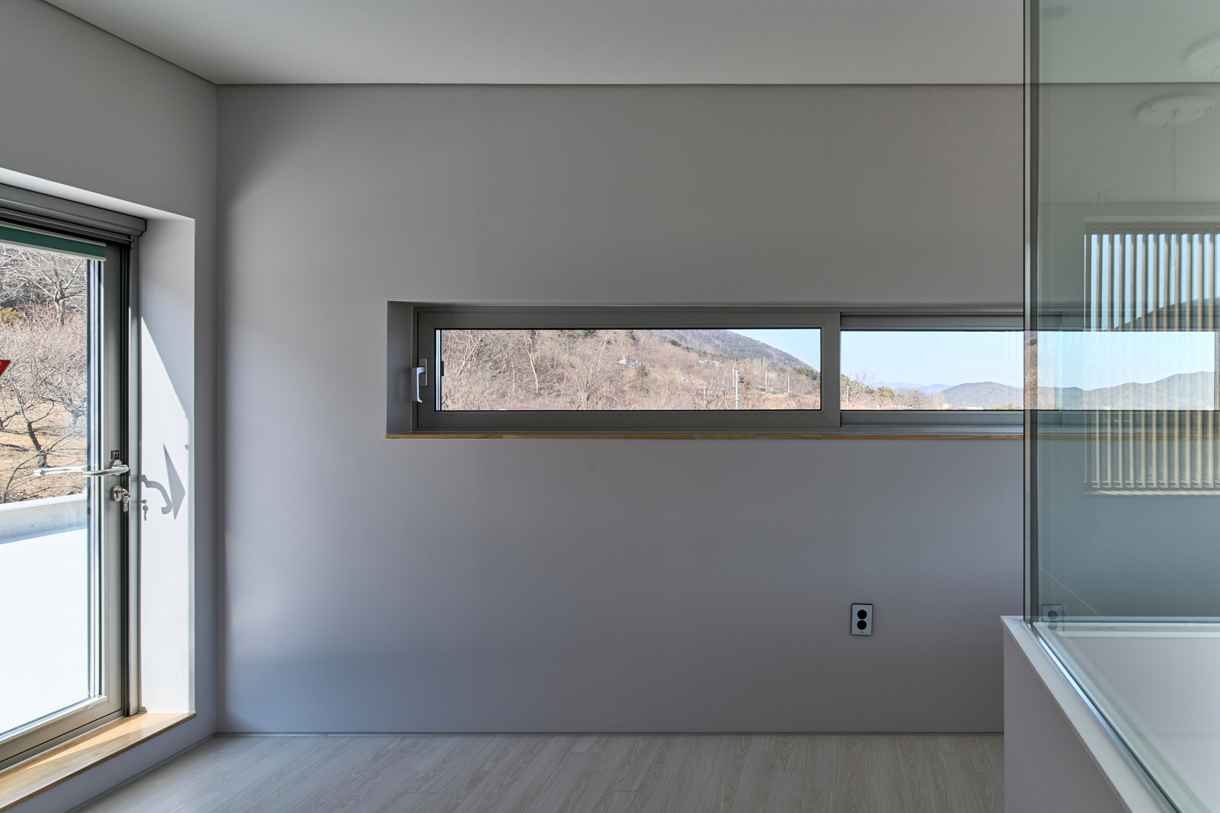 마당에는 야외 욕조가 있고 나무 한그루가 그림자로 벽에 그림을 새긴다. 국수봉의 펼쳐진 능선을 잘 담아낼 위치에 가벽을 뚫고 가벽 너머의 산과 마당과 집안의 윈도우시트를 겹치게 했다. 생활의 모습과 풍경이 잘 섞이고 삭아서 발효된 풍경, 시김된 장소로서 의미를 가지길 바래본다.